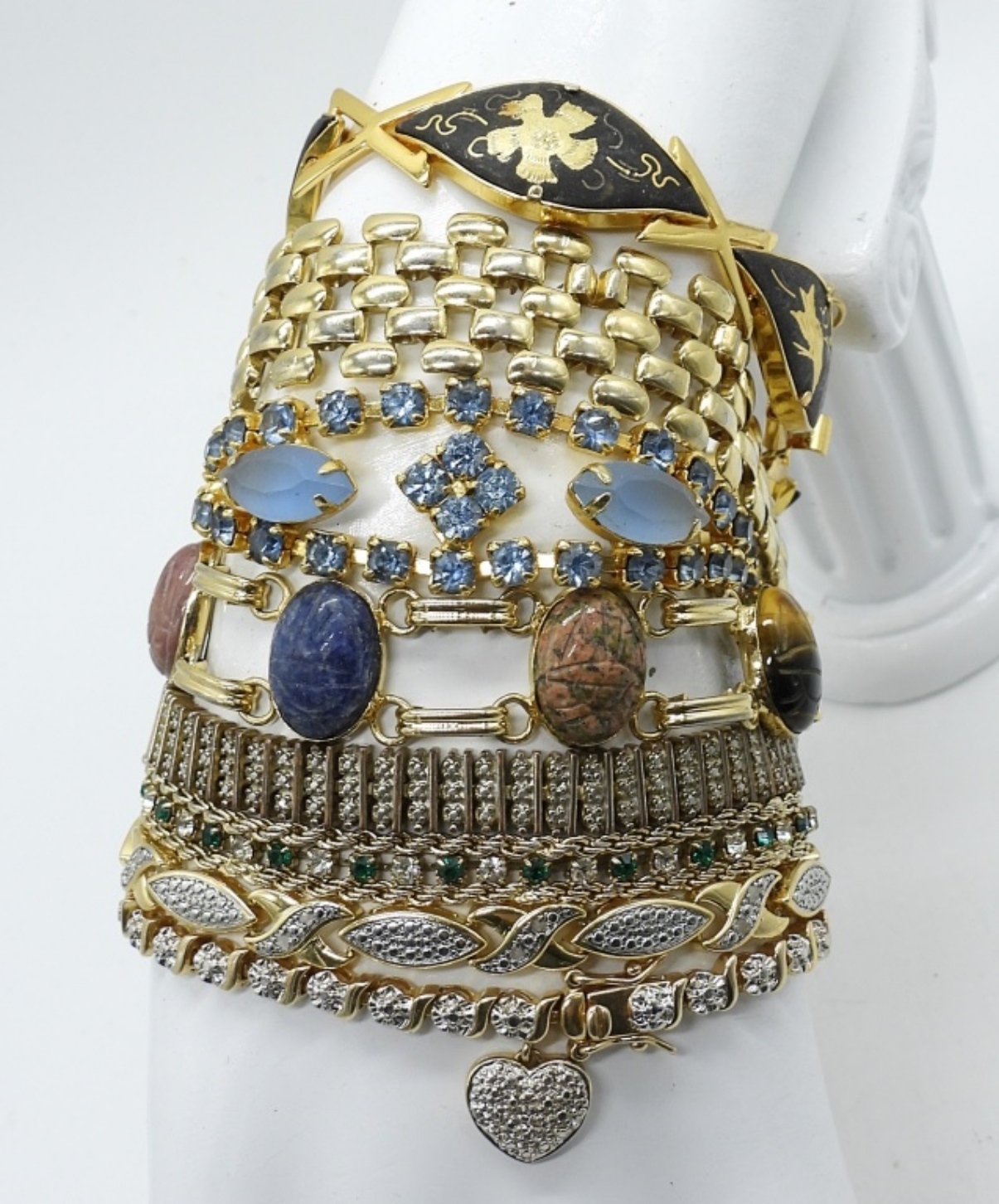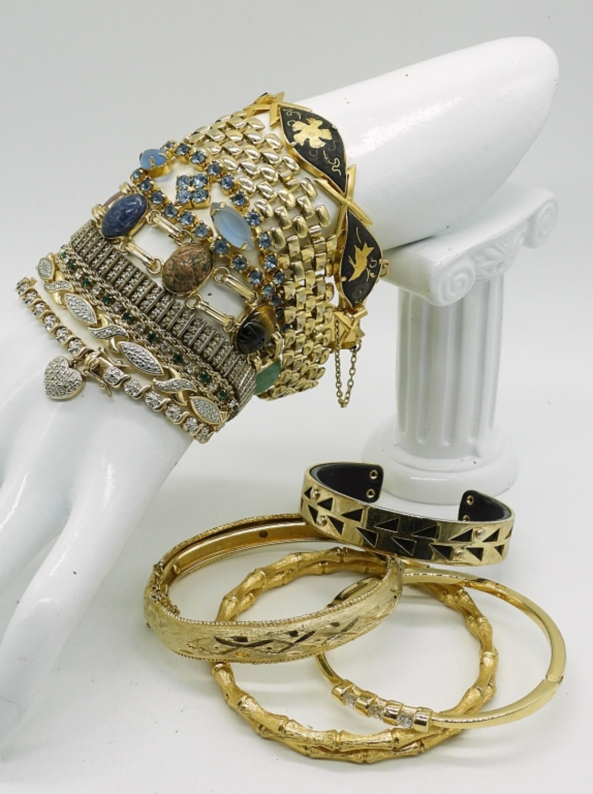 TWELVE VINTAGE GOLD TONE BRACELETS 6-8″.