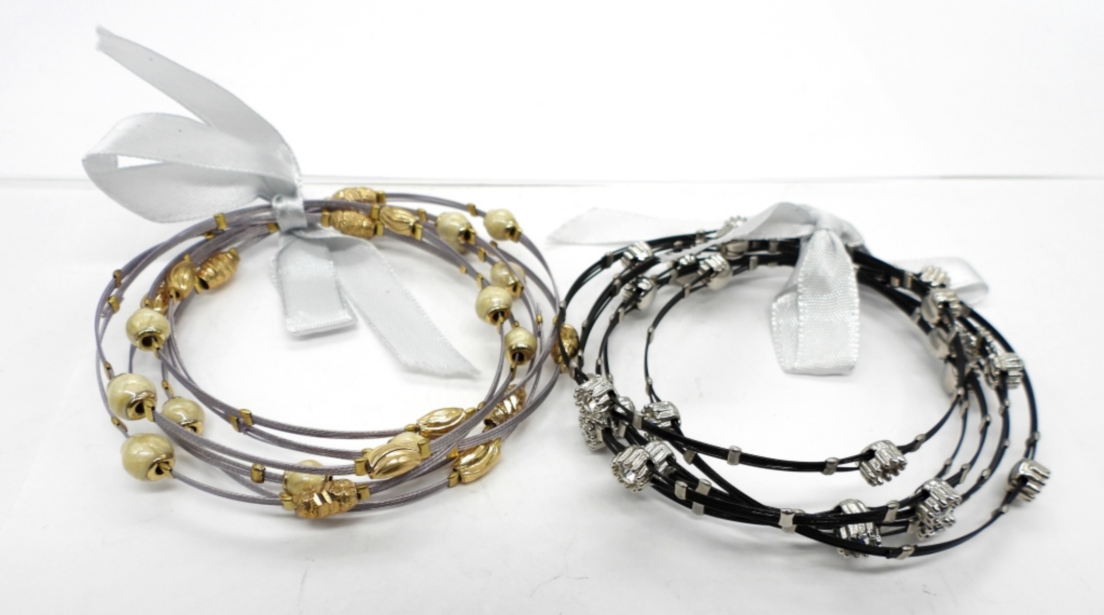Two Styles, Six Bracelets each Style. Silver Tone Wire Bracelets with Gold tone Charms. Black Tone Wire Bracelets with Silver tone with Gemstones. 7″.