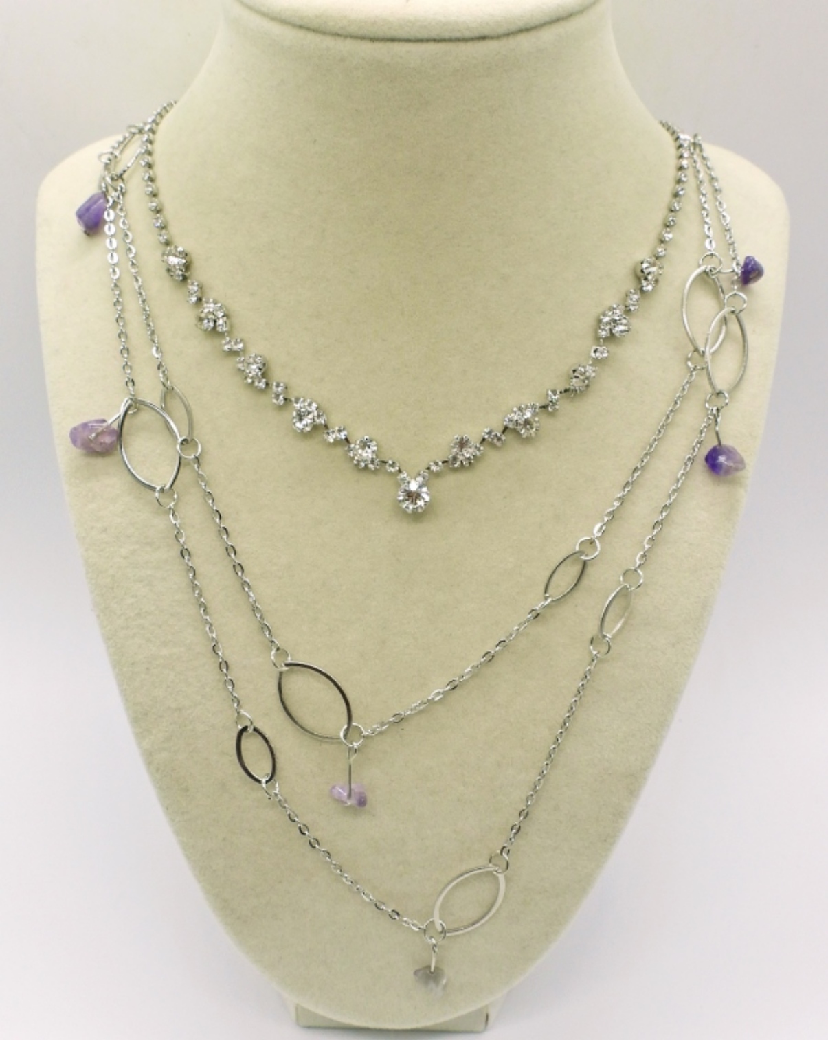 6 SILVER TONE FASHION NECKLACES. 36″ x2, 46″ WITH AMETHYST CHIPS, 22″, 18″, 22″.