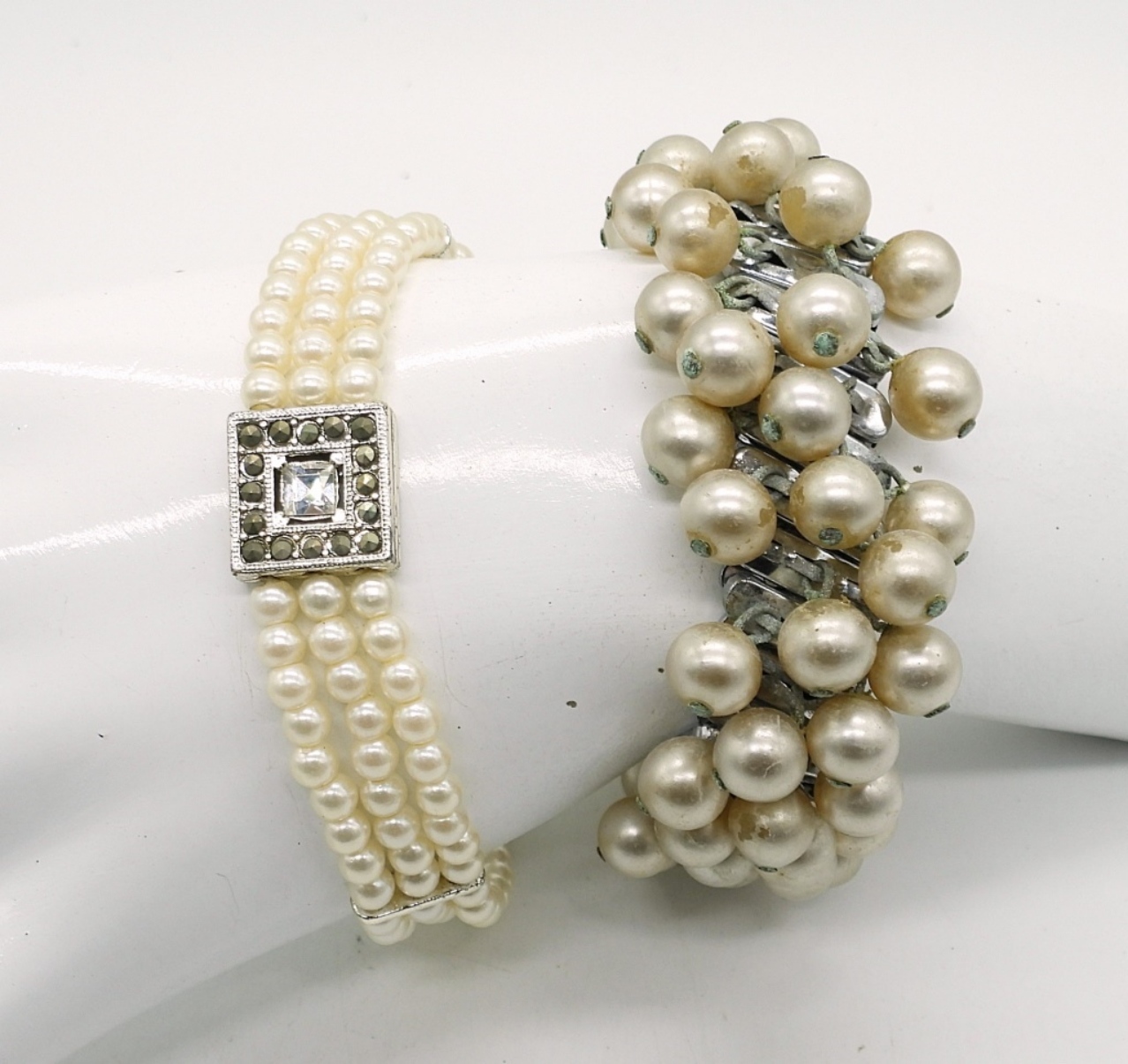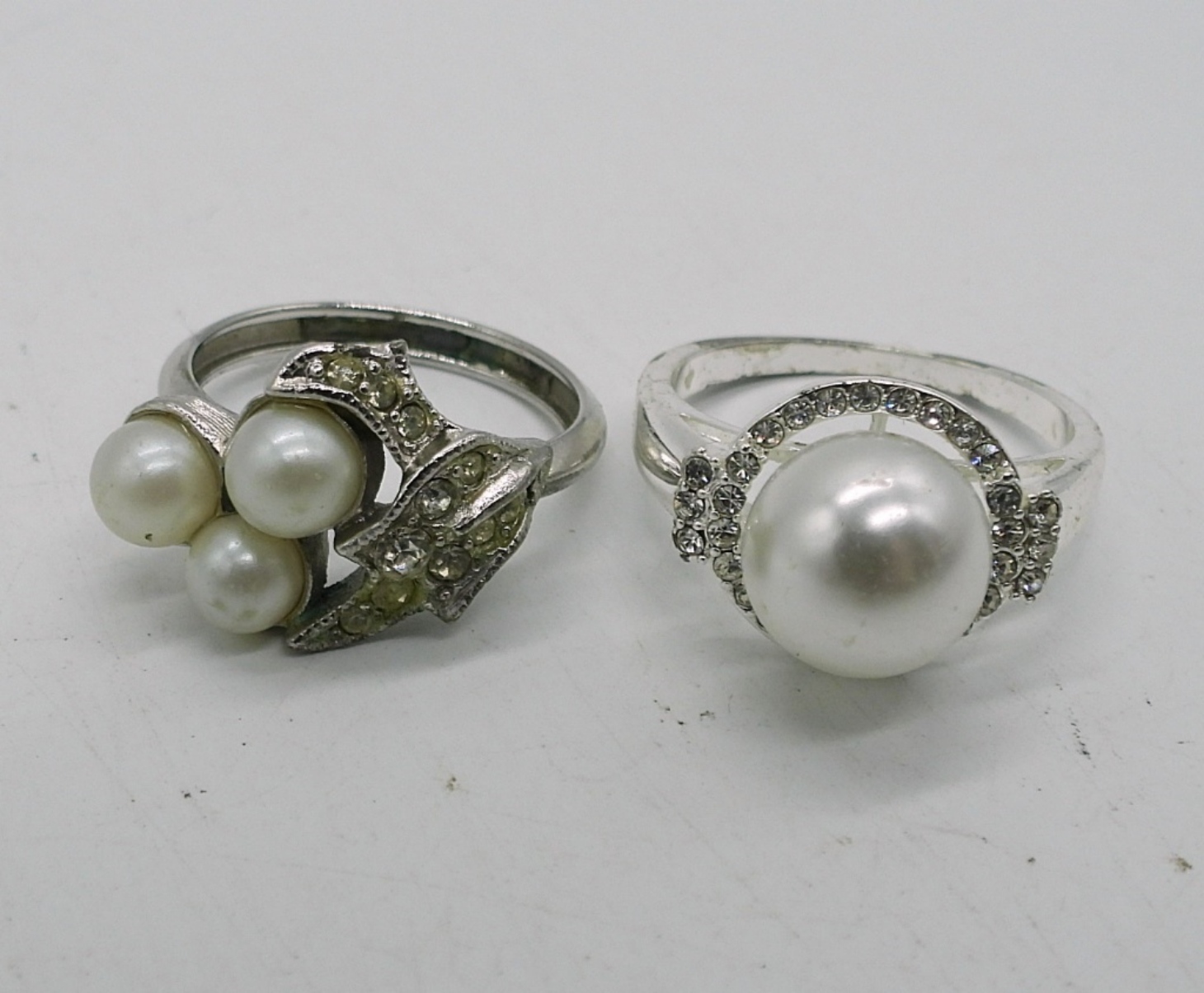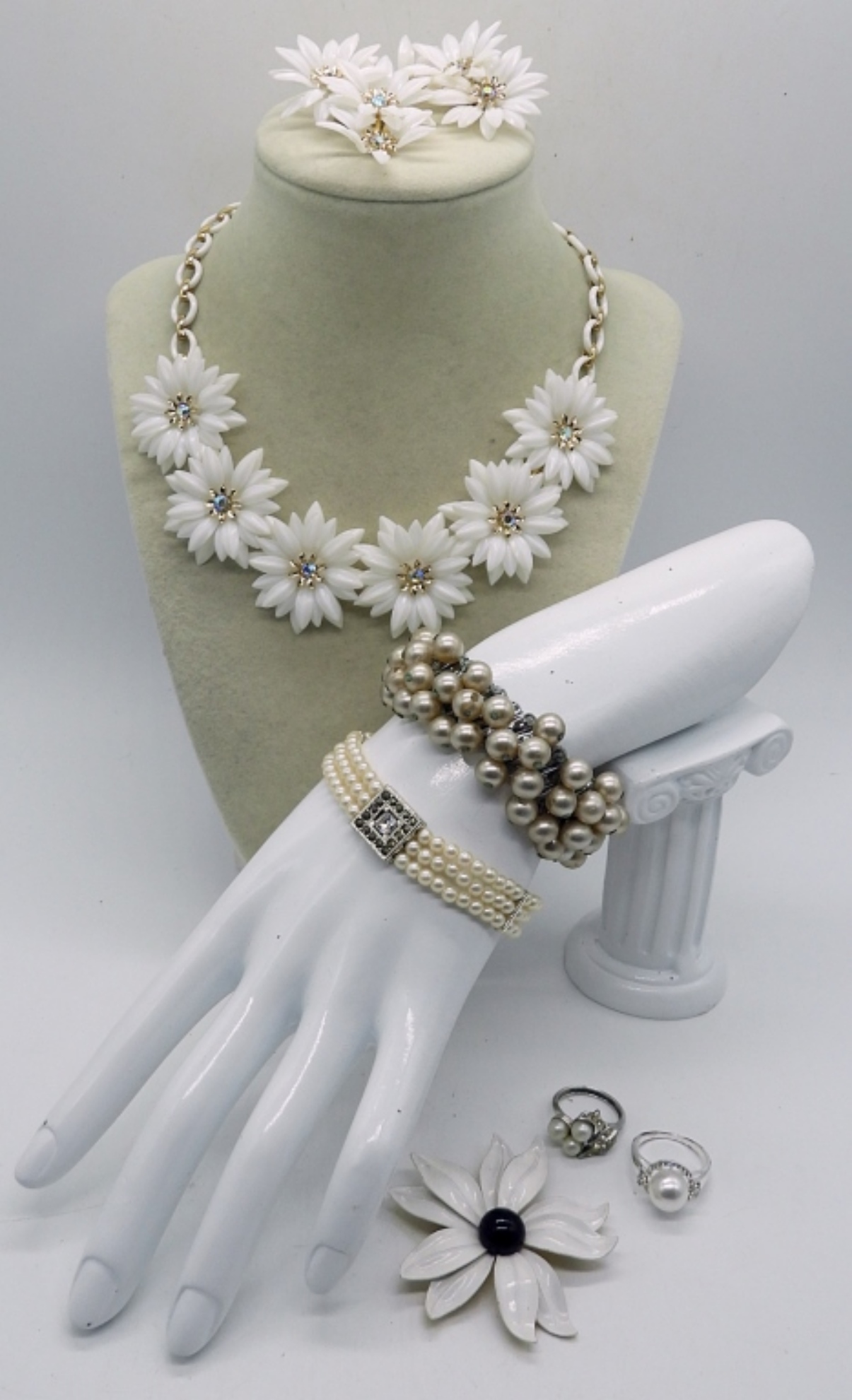 VINTAGE CORO WHITE PLASTIC DAISY NECKLACE & EARRINGS IN GREAT CONDITION! TWO PEARL BRACELETS, TWO PEARL SILVERTONE RINGS, SIZES 6 & 7. ONE VINTAGE WHITE METAL BROOCH.
