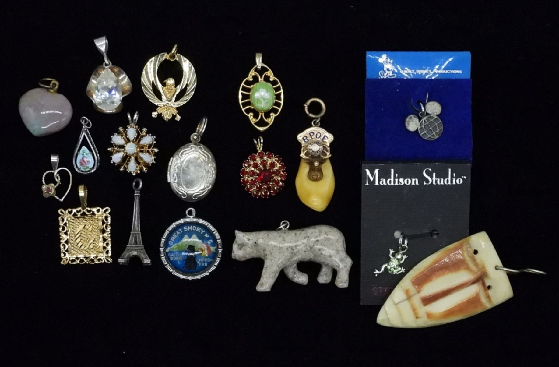 SEVENTEEN PENDANTS IN GOLD & SILVER TONES. GEMSTONES, ELK TOOTH, TIKI HEAD & MORE.