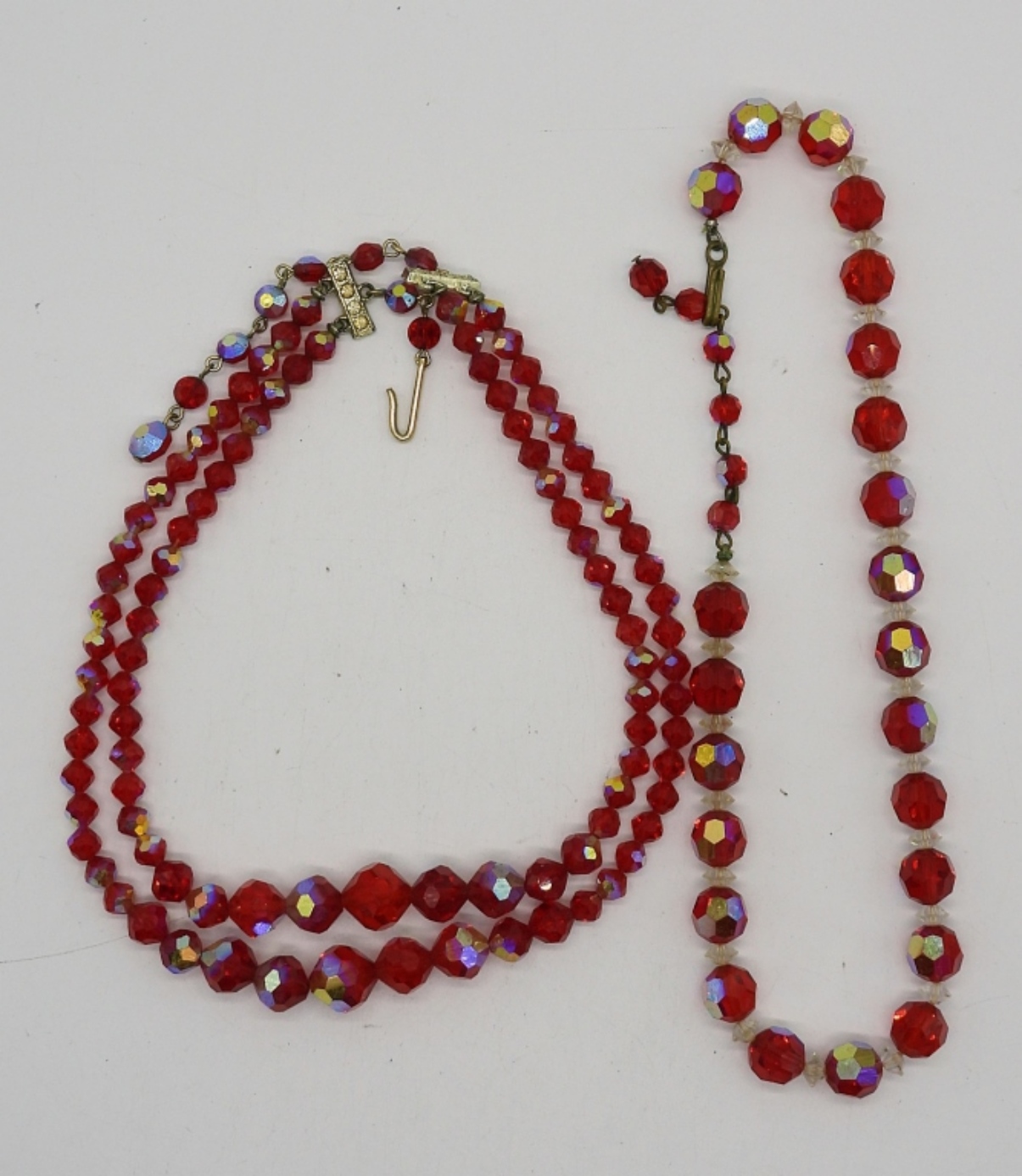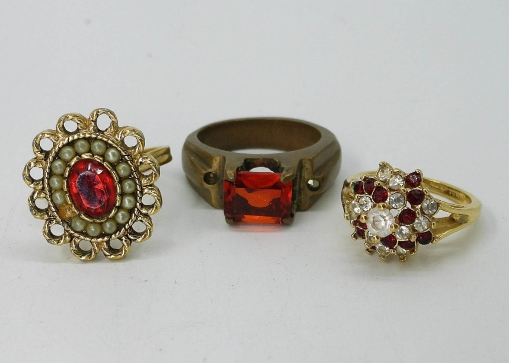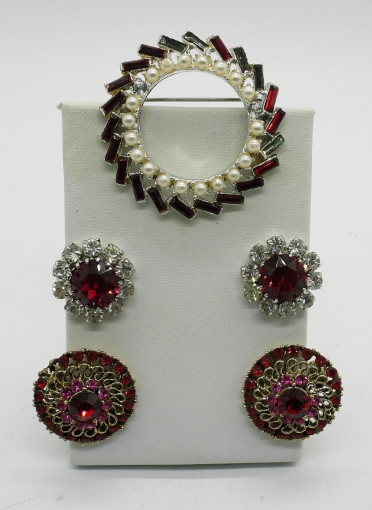 TWO VINTAGE RED CRYSTAL NECKLACES, 16″. ONE RED GEMSTONE & PEARL BROOCH (MISSING 5 GEMSTONES & 2 PEARLS). TWO PAIR OF VINTAGE CLIP ON EARRINGS. THREE RINGS, SIZES 6, 7, 9.