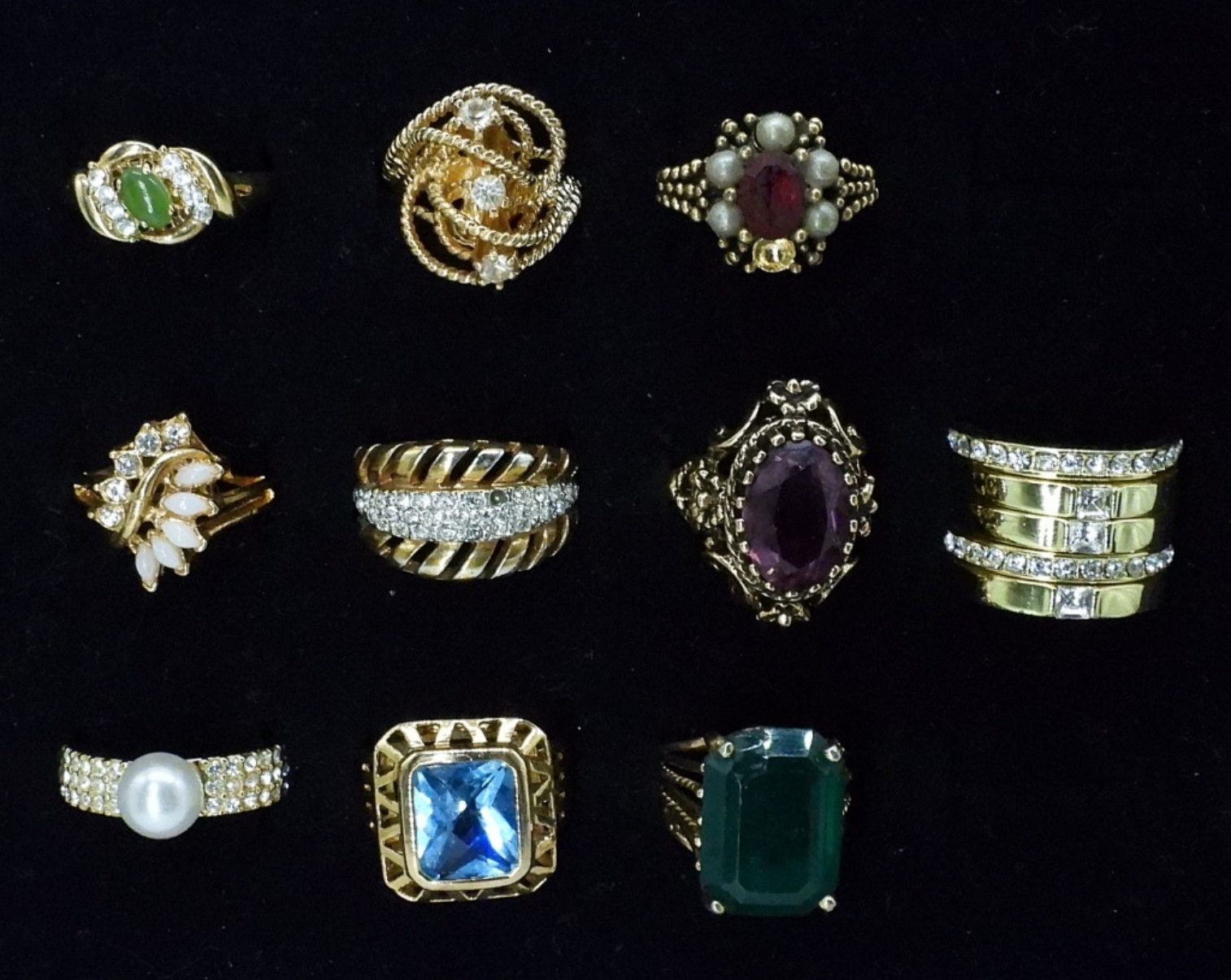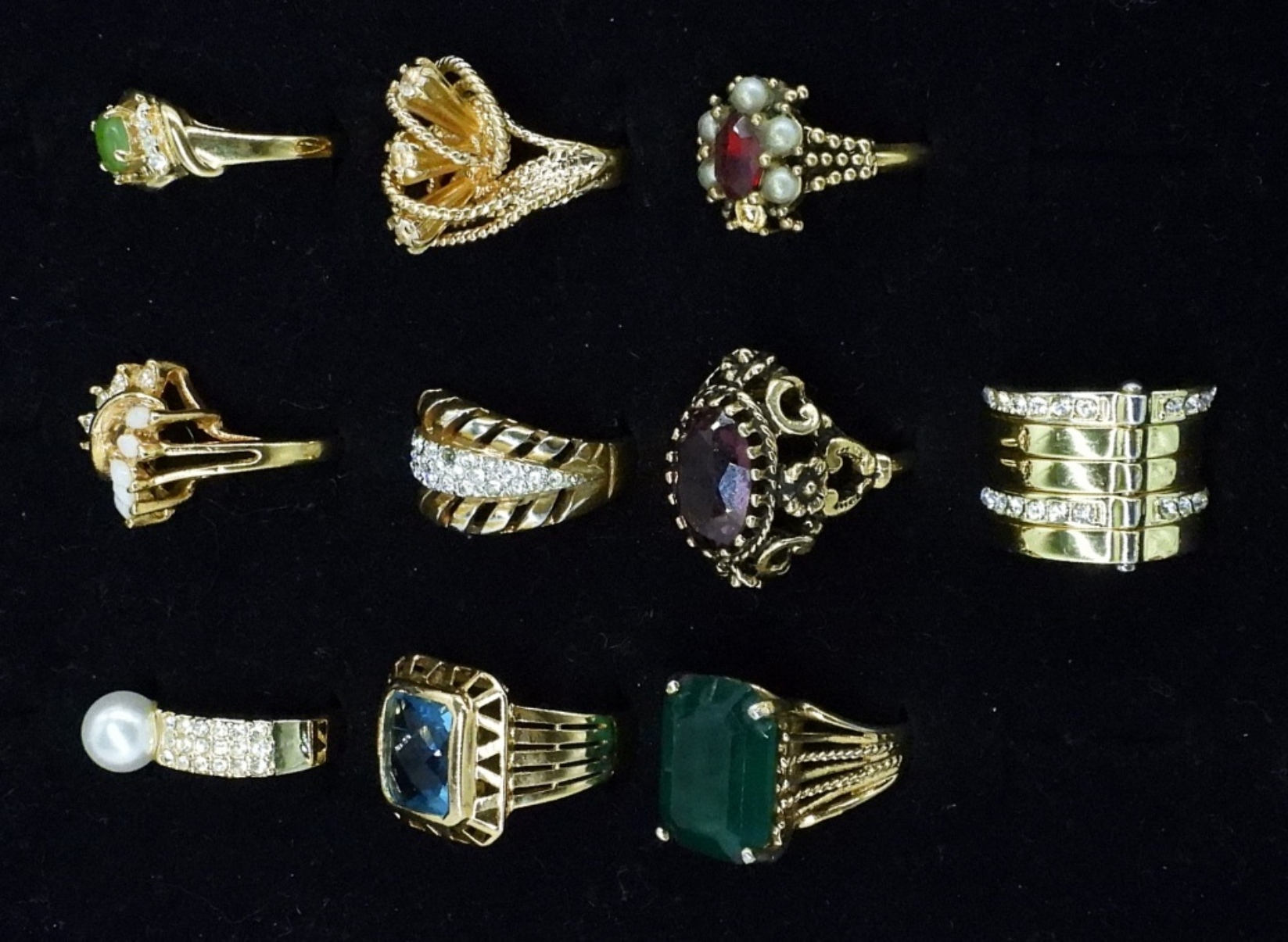 TEN GOLD TONE FASHION RINGS WITH PRETTY GEMSTONES. SIZES 5-9