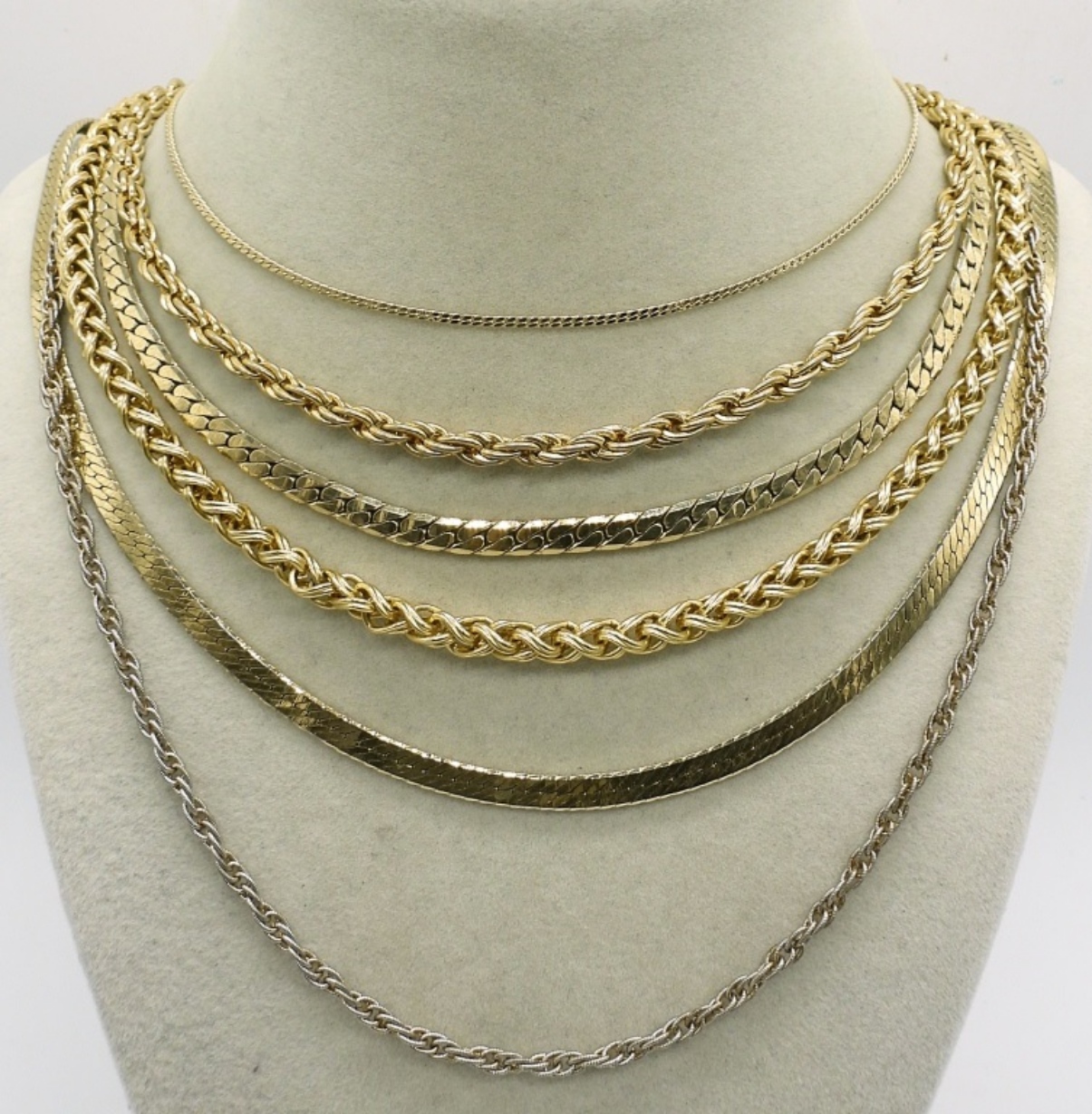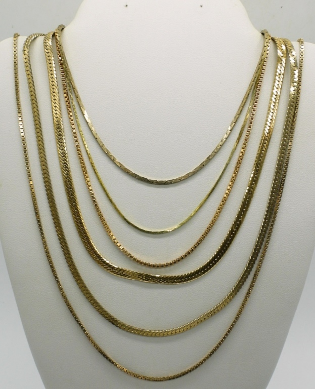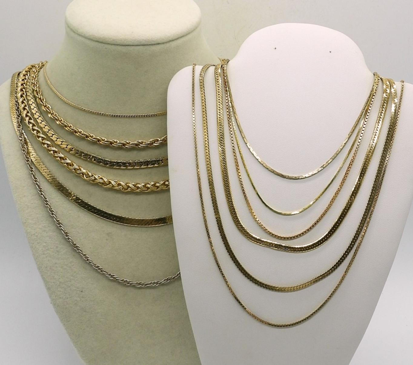 TWELVE NICE GOLD TONE CHAINS, SEVERAL STYLES. LENGTHS RANGE FROM 15-30″.