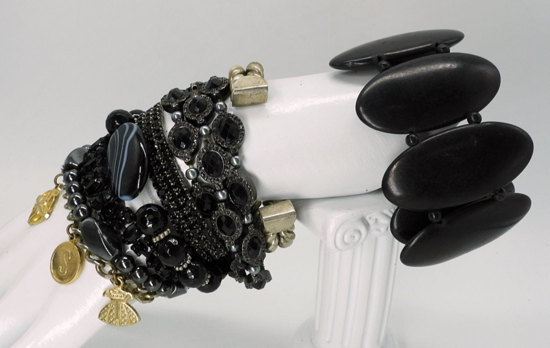 TEN BRACELETS, BLACK RHINESTONES & GEMSTONES. SILVER AND GOLD TONE. BANGLES, STRETCHY, HEMATITE, CHARM. 7-10″.