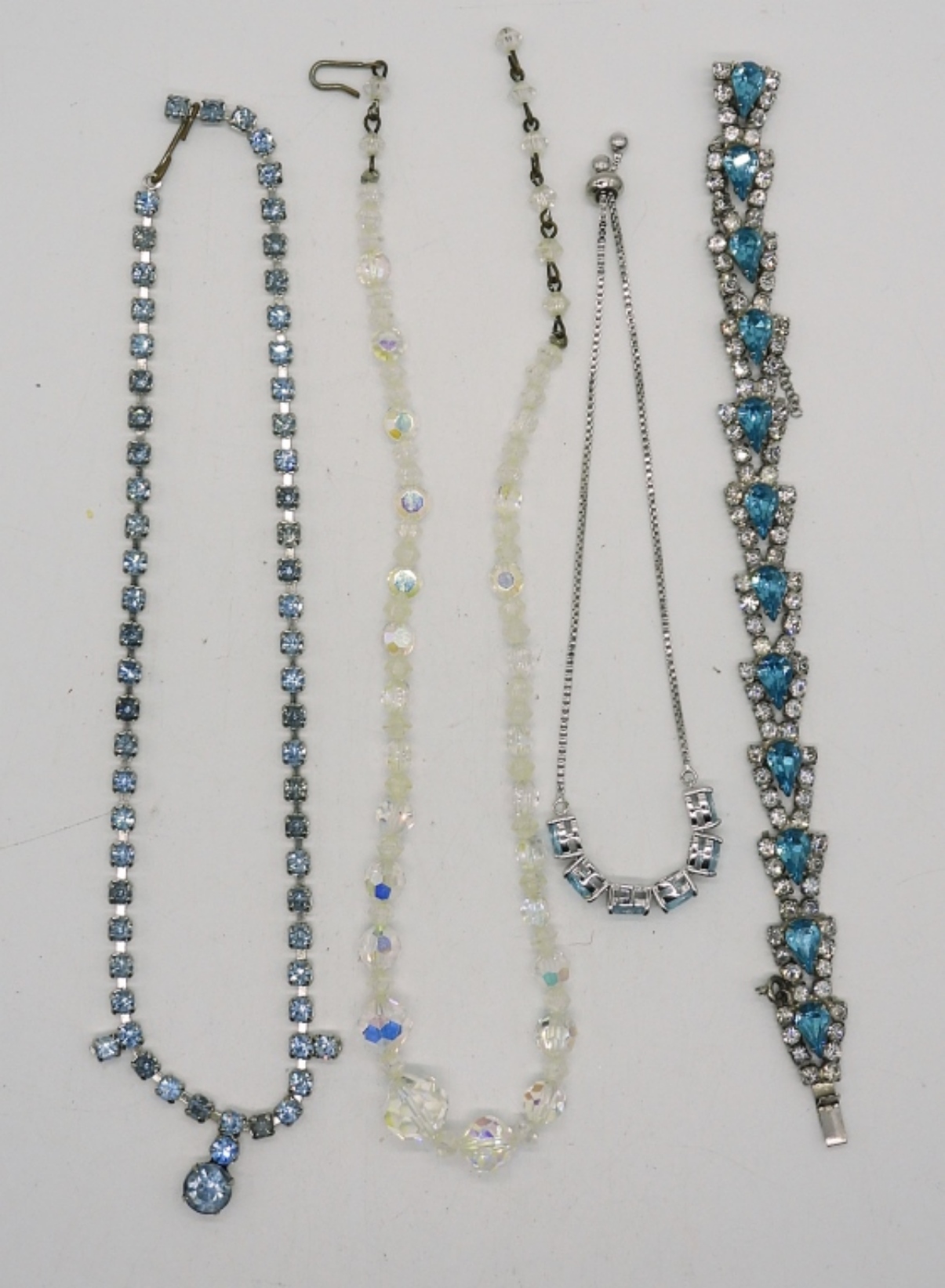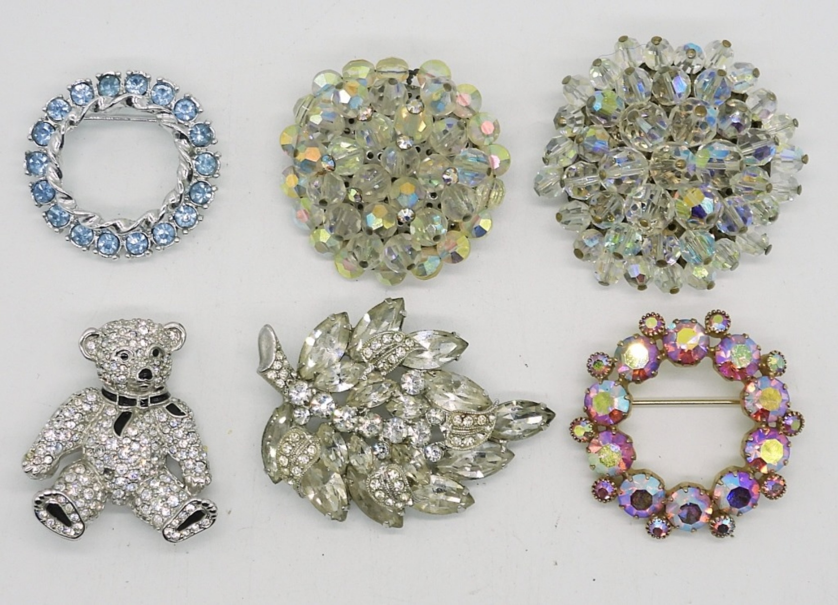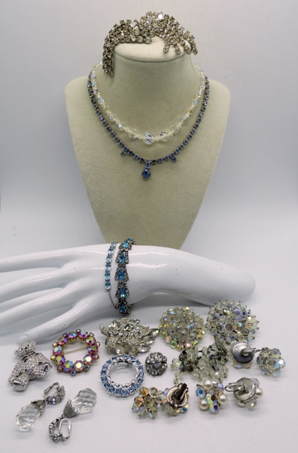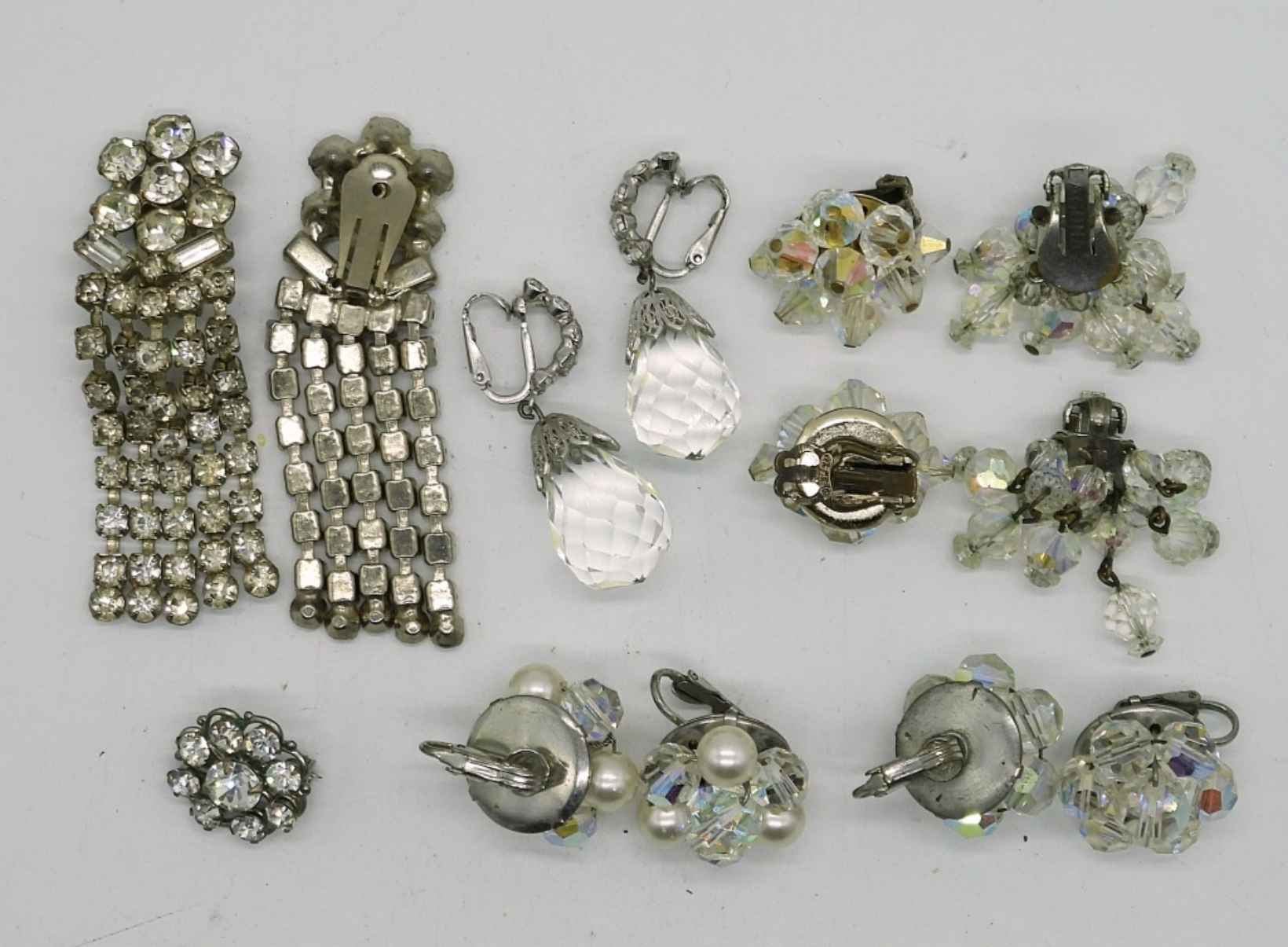SIX PAIR OF CLIP ON EARRINGS. SEVEN BROOCHES. TWO NECKLACES, 16″. TWO BRACELETS, 7″ & 10″ ADJ.