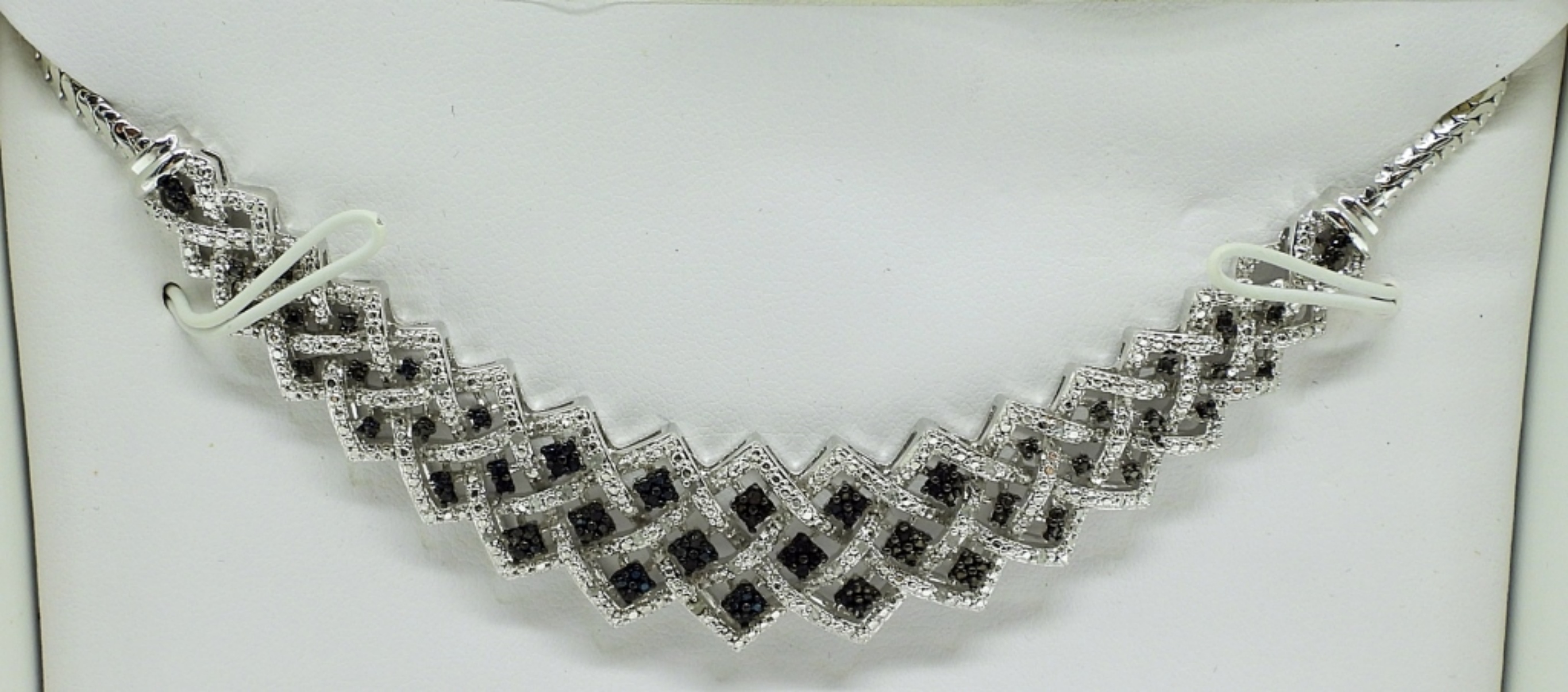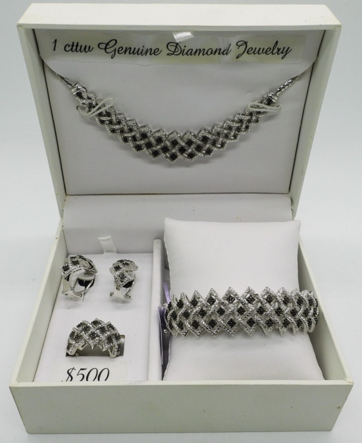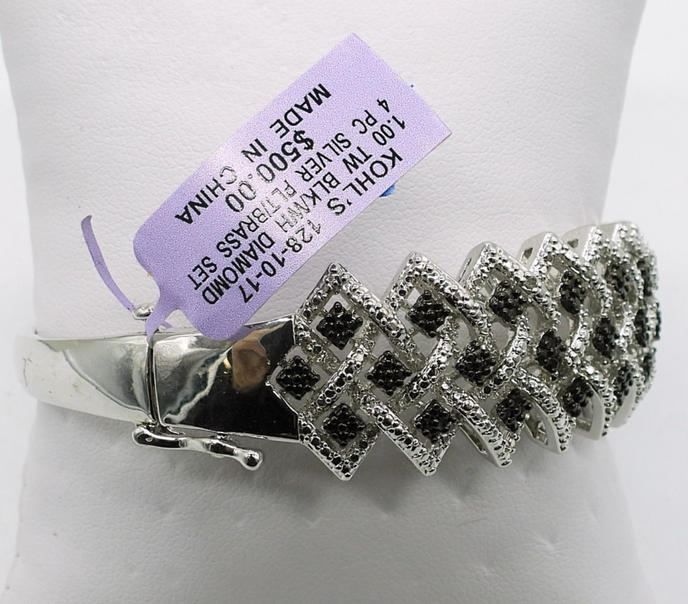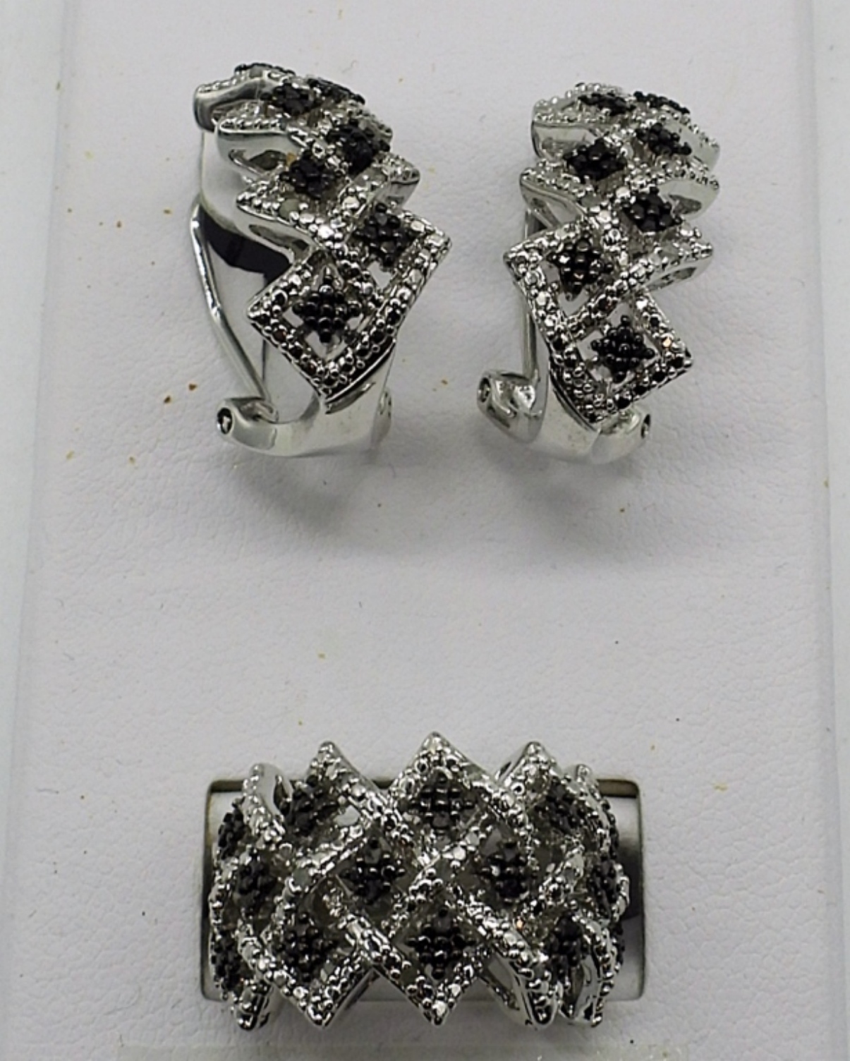 1 CARAT TOTAL WEIGHT BLACK AND WHITE DIAMOND 4 PIECE SET. FROM KOHL’S, RETAIL PRICE $500. SILVER PLATED BRASS! NECKLACE IS 18″. RING SIZE 7.