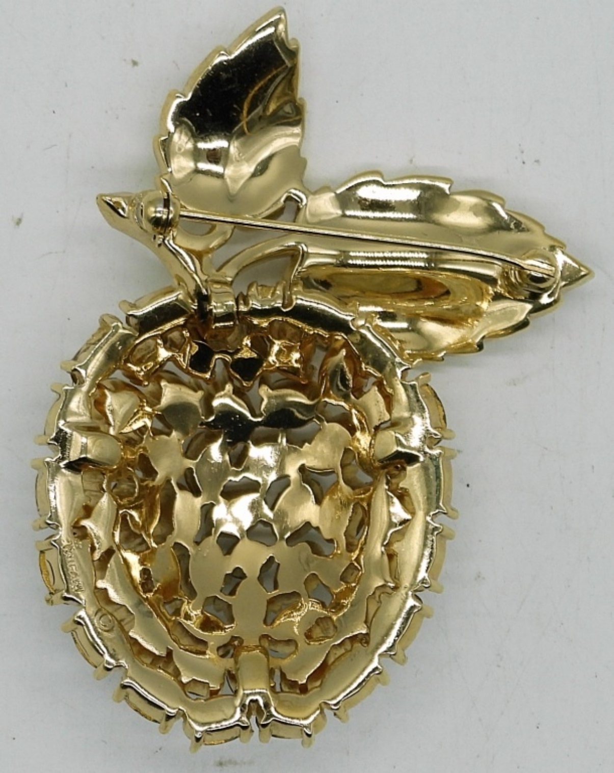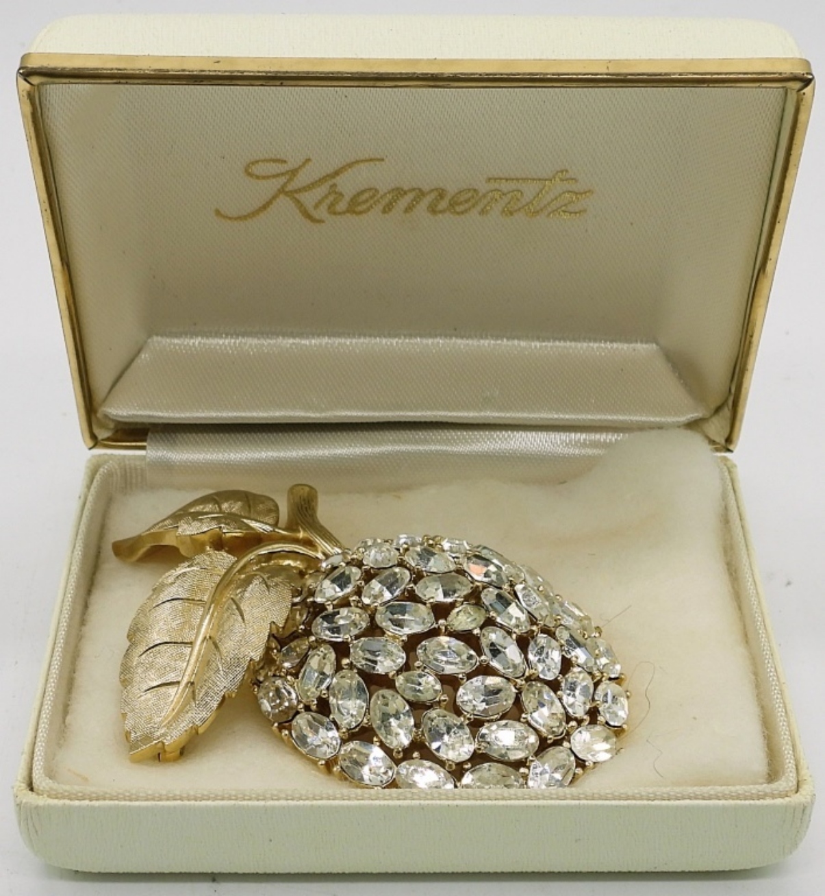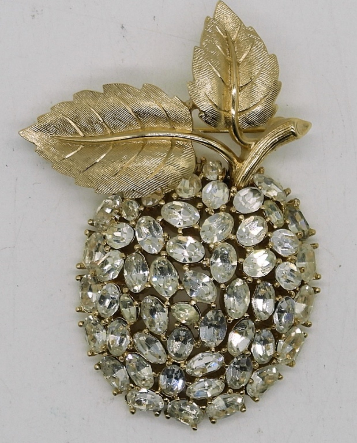 GORGEOUS VINTAGE TRIFARI APPLE BROOCH WITH BEAUTIFUL RHINESTONES. THIS PIECE IS IN PERFECT CONDITION! COMES IN VINTAGE HARD JEWELRY BOX. 2.5″.
