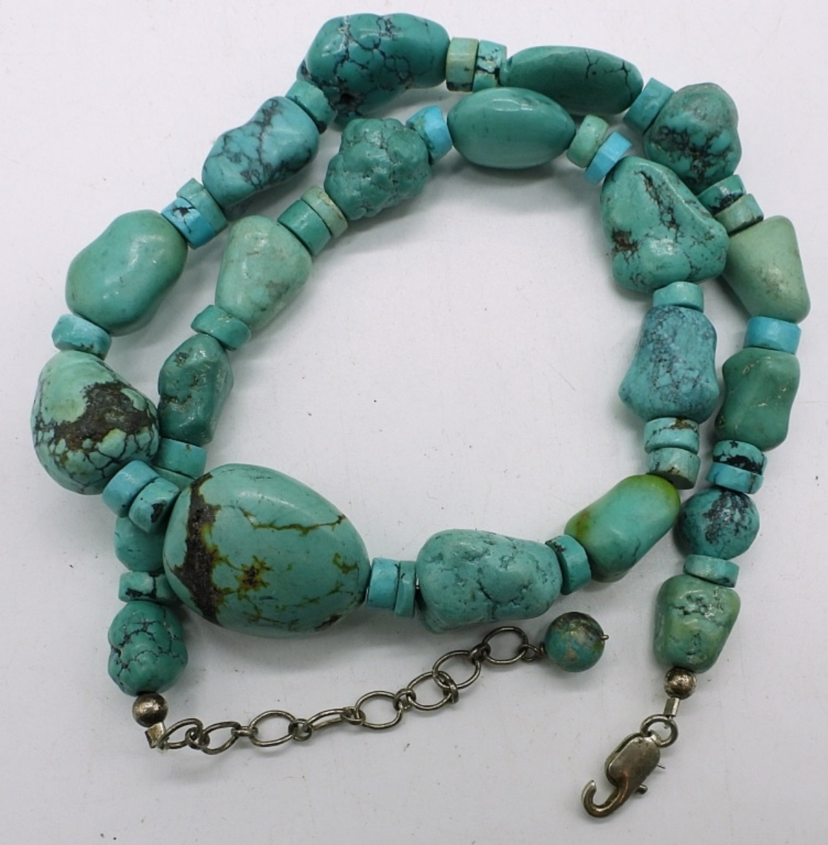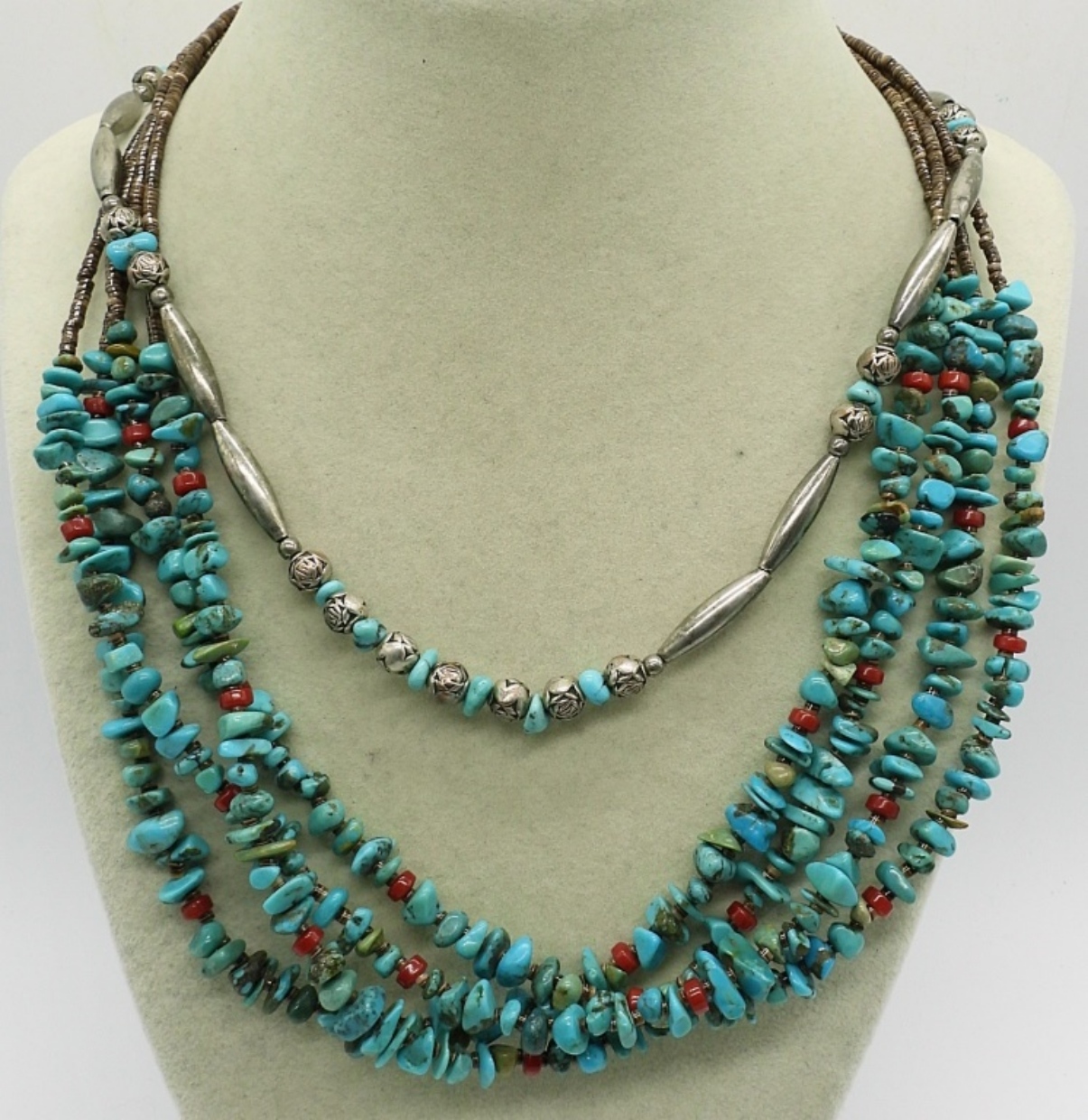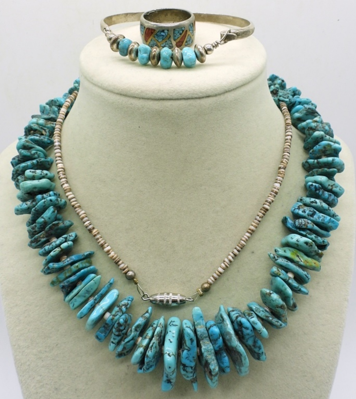 FOUR TURQUOIS BEADED NECKLACES, 18-30″. SILVER TONE TURQUOISE BRACELET, 7″. SILVER TONE RING WITH TURQUOISE INLAY, SIZE 8. ONE NECKLACE HAS A BROKEN CLASP.