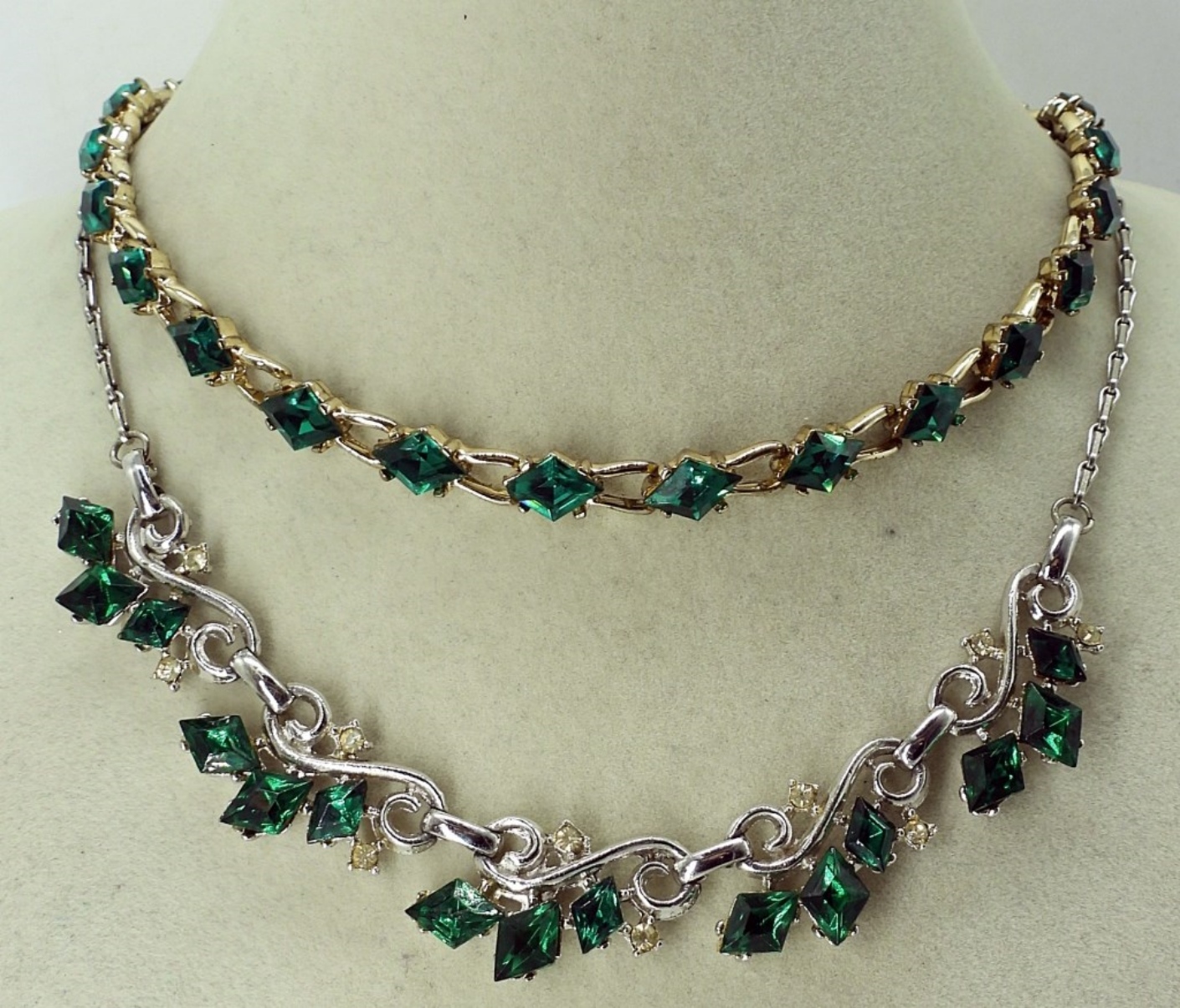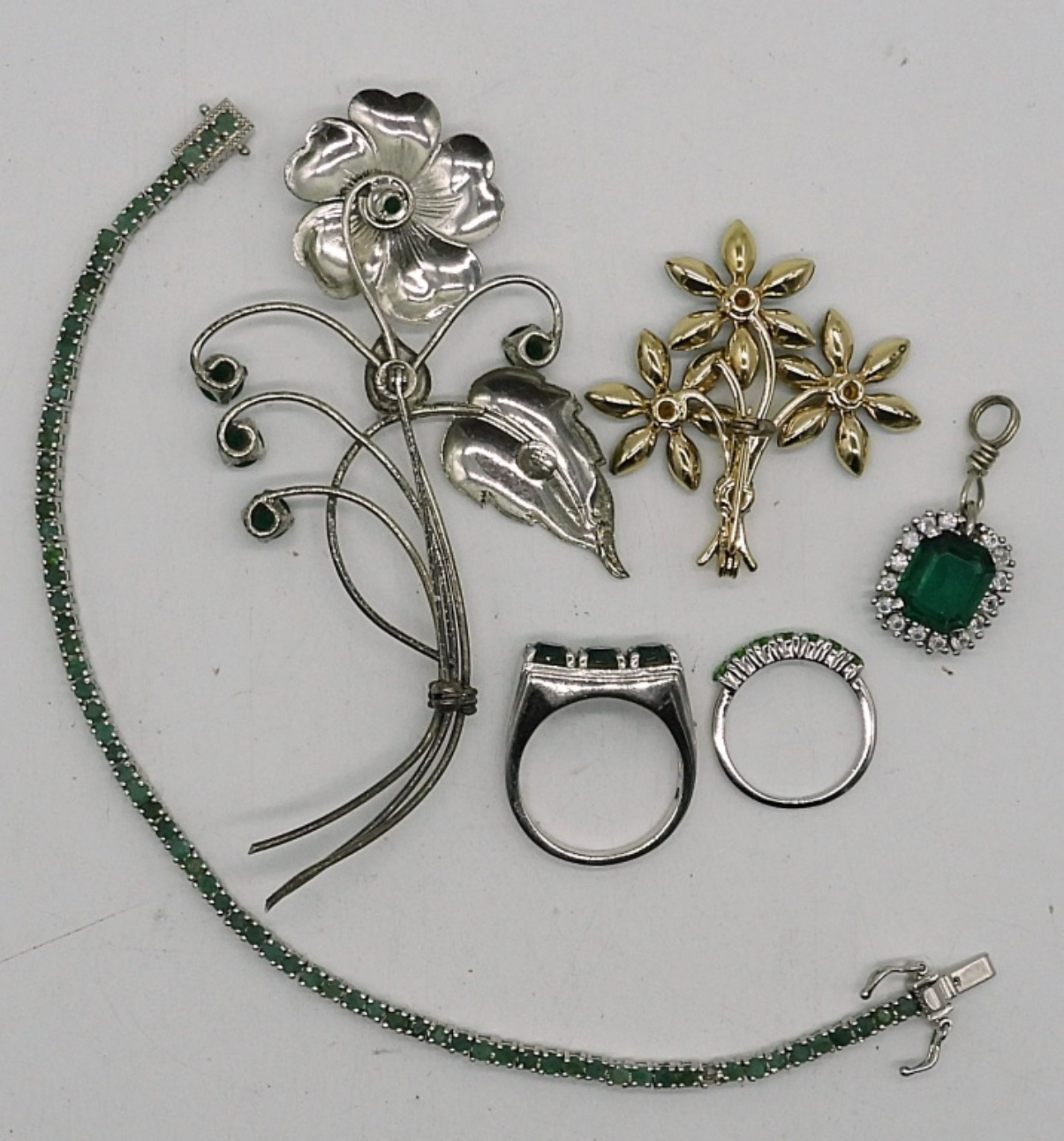 GENUINE NATURAL EMERALD SILVER TONE BRACELET, MARKED “STS KARIS”, 8″ MISSING 1 STONE. TWO EMERALD GREEN GEMSTONE NECKLACES (NOT REAL EMERALDS), 15-16″. ONE PENDANT, TWO BROOCHES (2″ & 4″). TWO SILVER TONE RINGS WITH