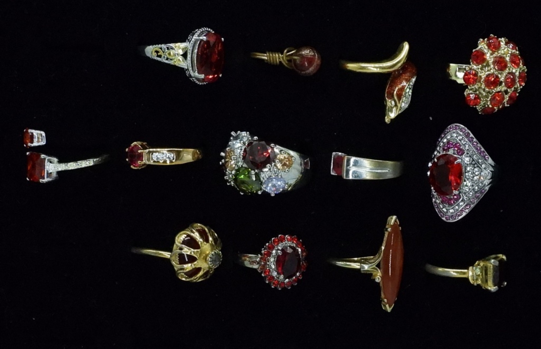 THIRTEEN RED GEMSTONE GOLD AND SILVERTONE LADIES FASHION RINGS. SIZES 3-9