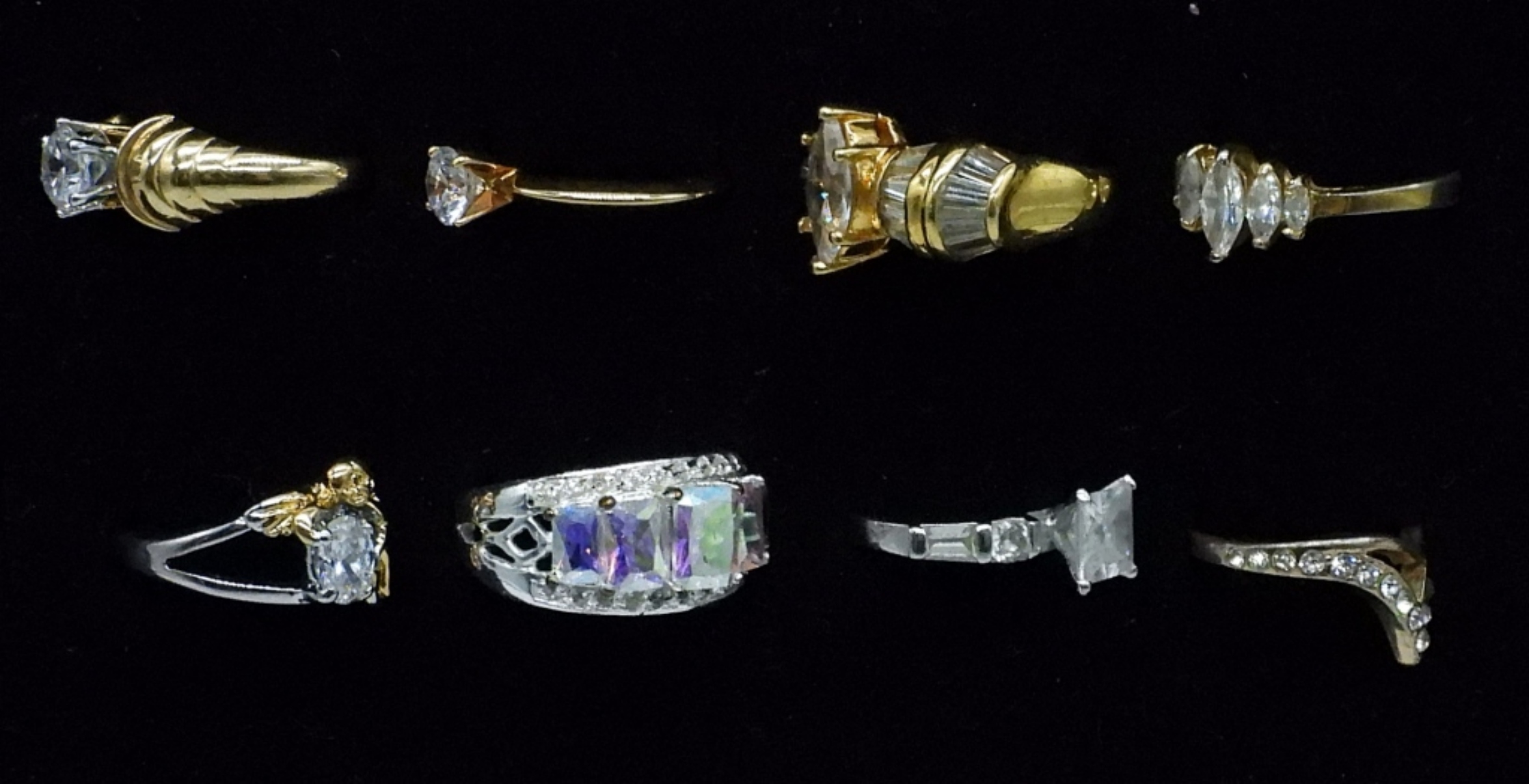EIGHT BRIDAL STYLE FASHION RINGS IN GOLD AND SILVER TONES. SIZES 7, 8, 9.