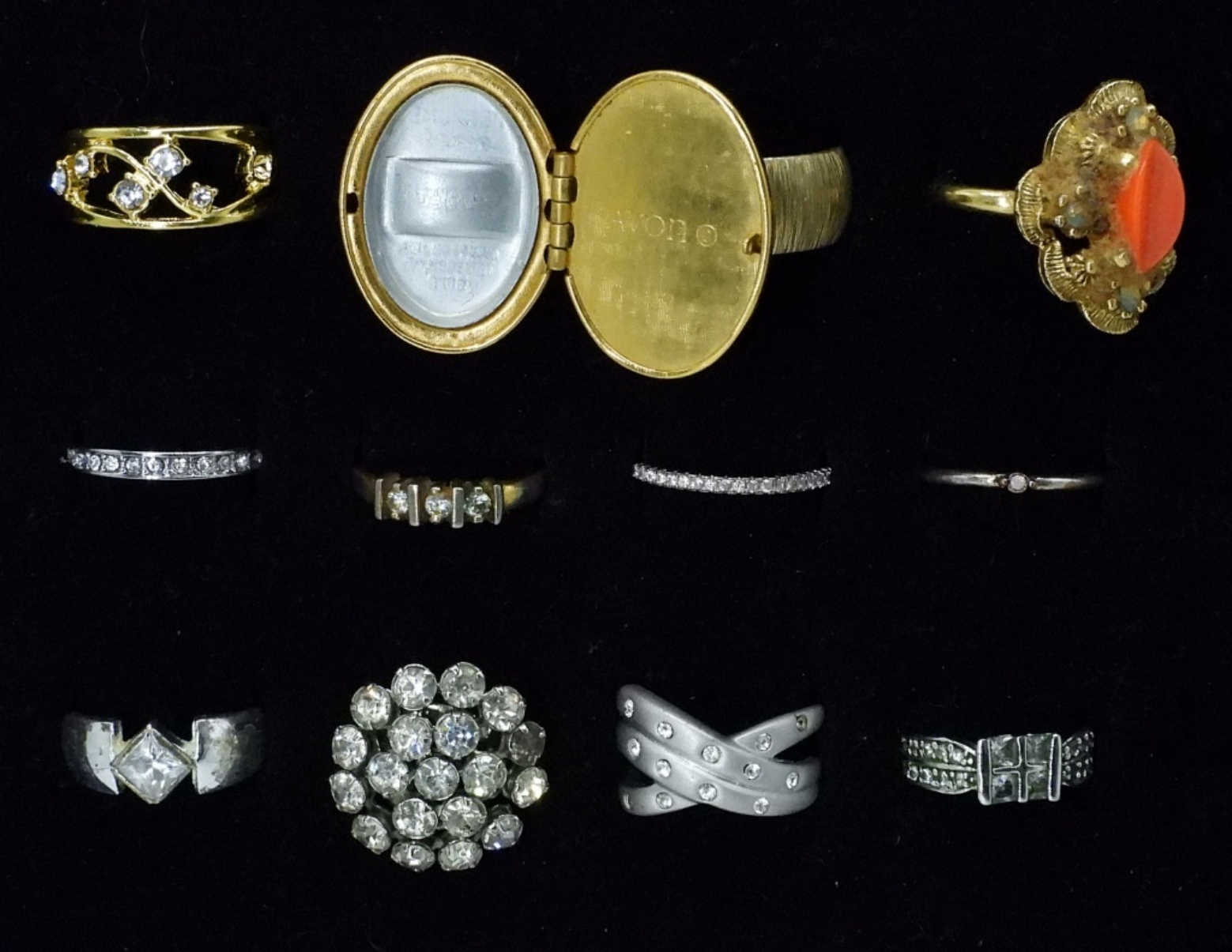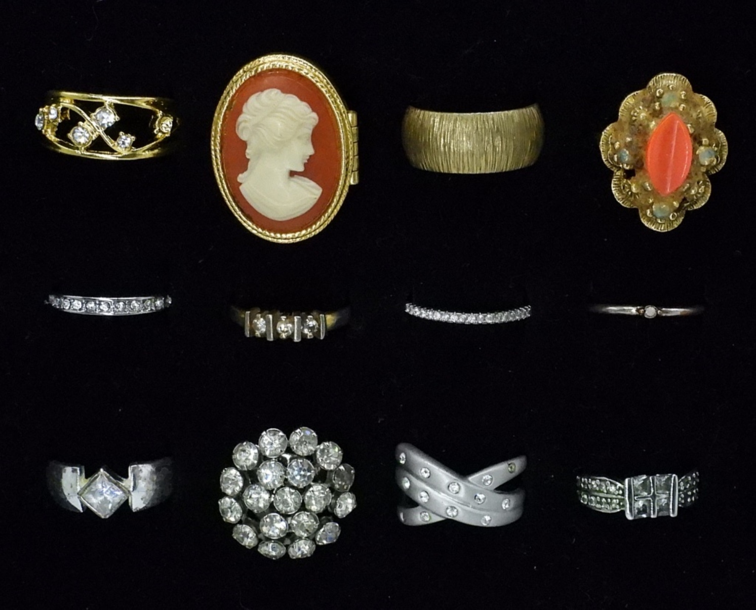 TWELVE WOMEN’S GOLD AND SILVER TONE RINGS. SIZES 5-9