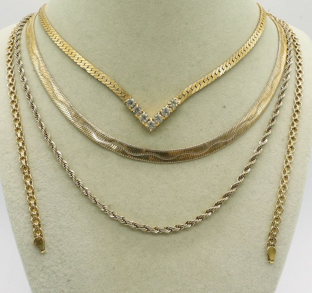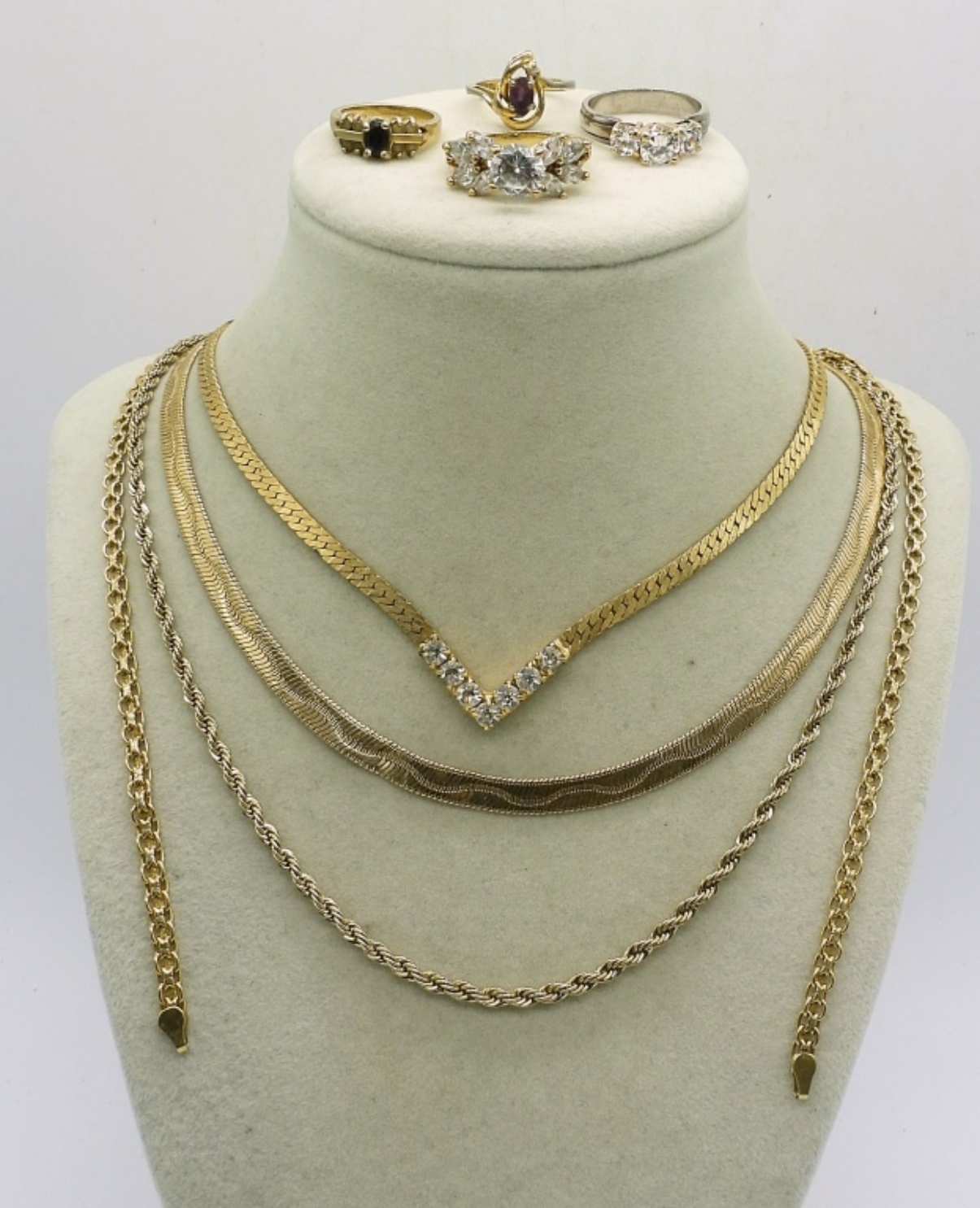 FOUR GOLD TONE FASHION CHAINS, 17-24″. TWO GOLD TONE FASHION RINGS, SIZES 5.