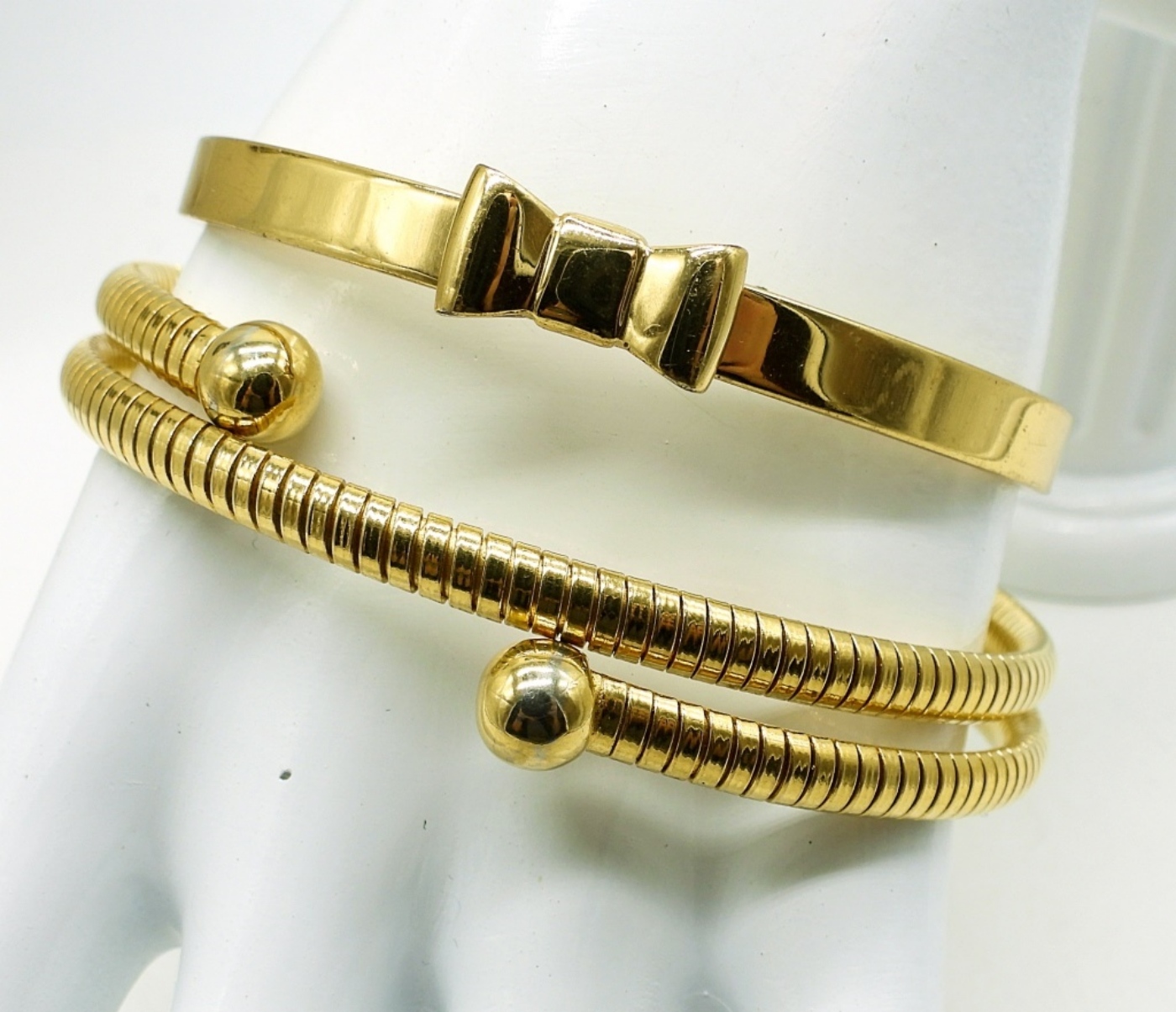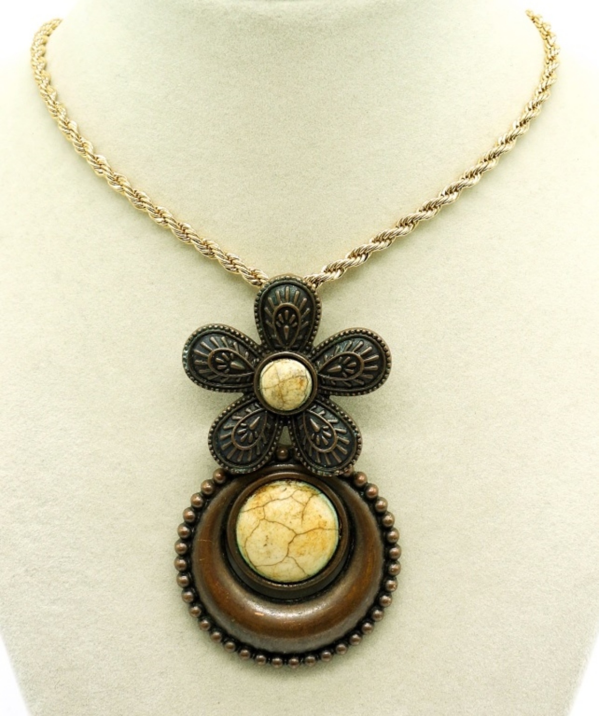BRONZE TONE FLOWER PENDANT ON A 34″ GOLD TONE AVON CHAIN (Pendant is NOT Avon). 2 GOLD TONE BRACELETS,BANGLE STYLE 9″ & KATE SPADE GOLD TONE BOW TIE BANGLE. GOLD TONE RING, SIZE 6 WITH TIGERS EYE GEMSTONE.