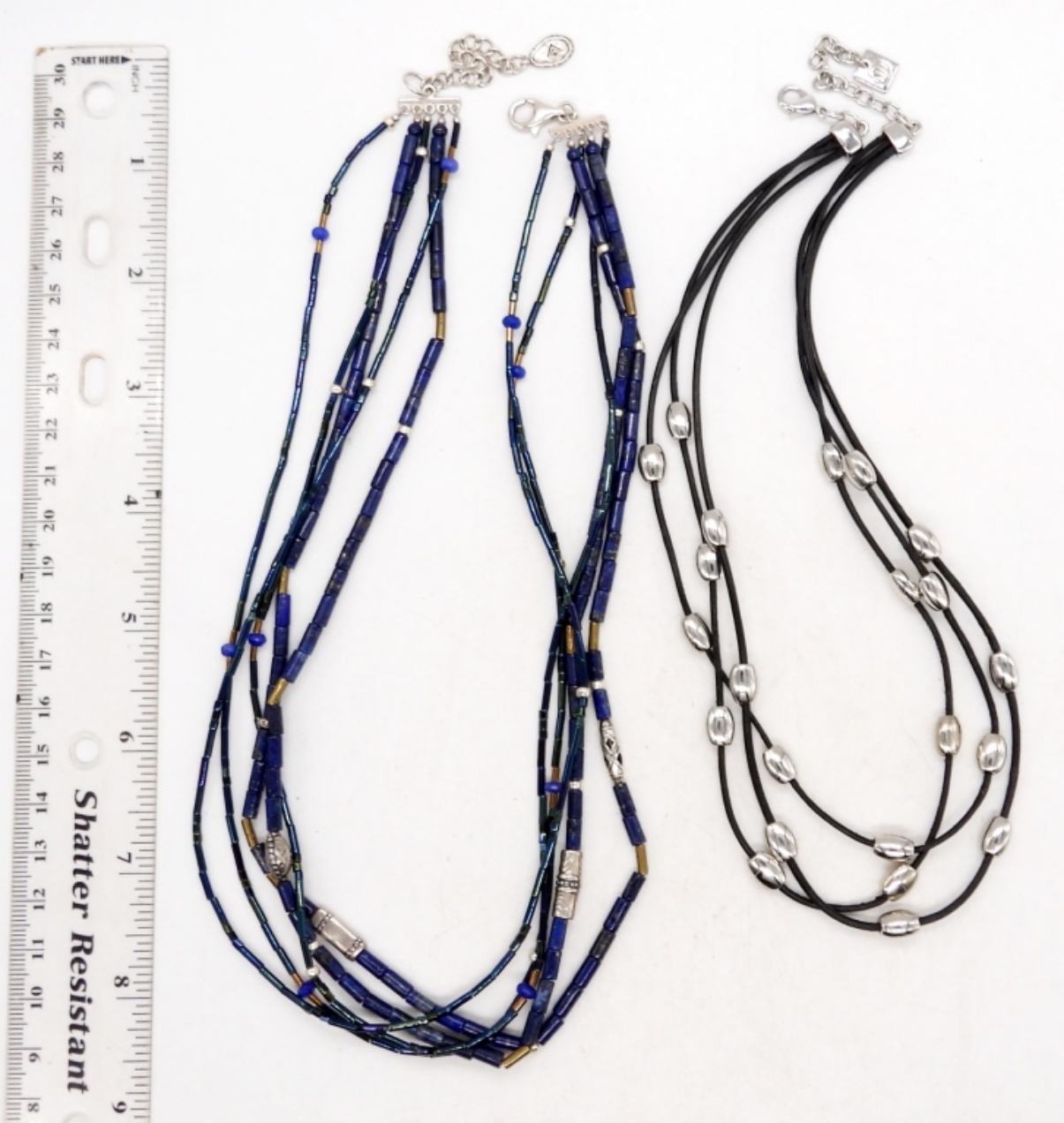 WITH LEATHER, SILVER BEADS, LIQUID BEADS; 15″ & 18″ LENGTHS