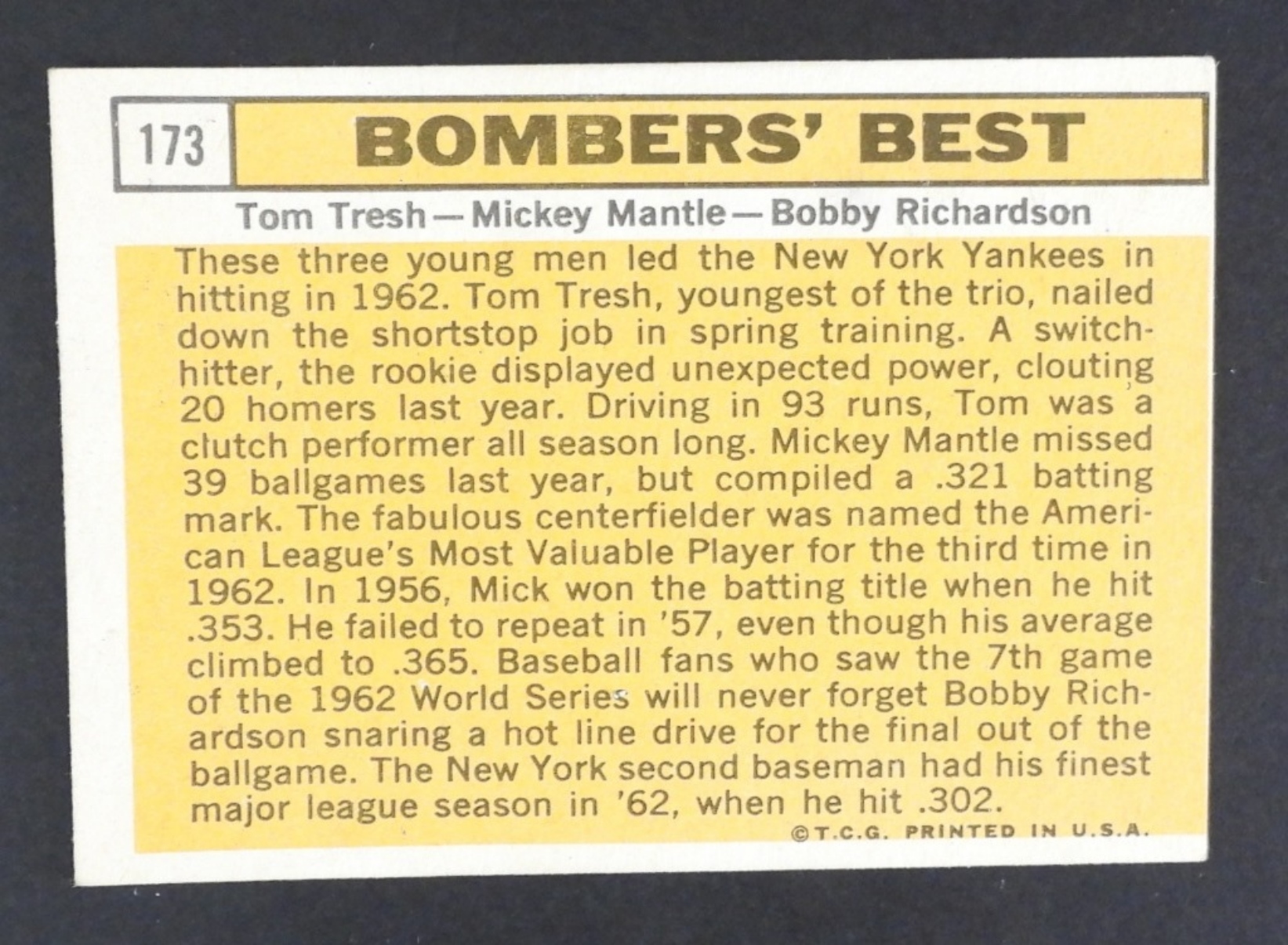 1963 TOPPS # 173 BOMBER’S BEST, TOM TRESH, MICKEY MANTLE, BOBBY RICHARD(VGEX)