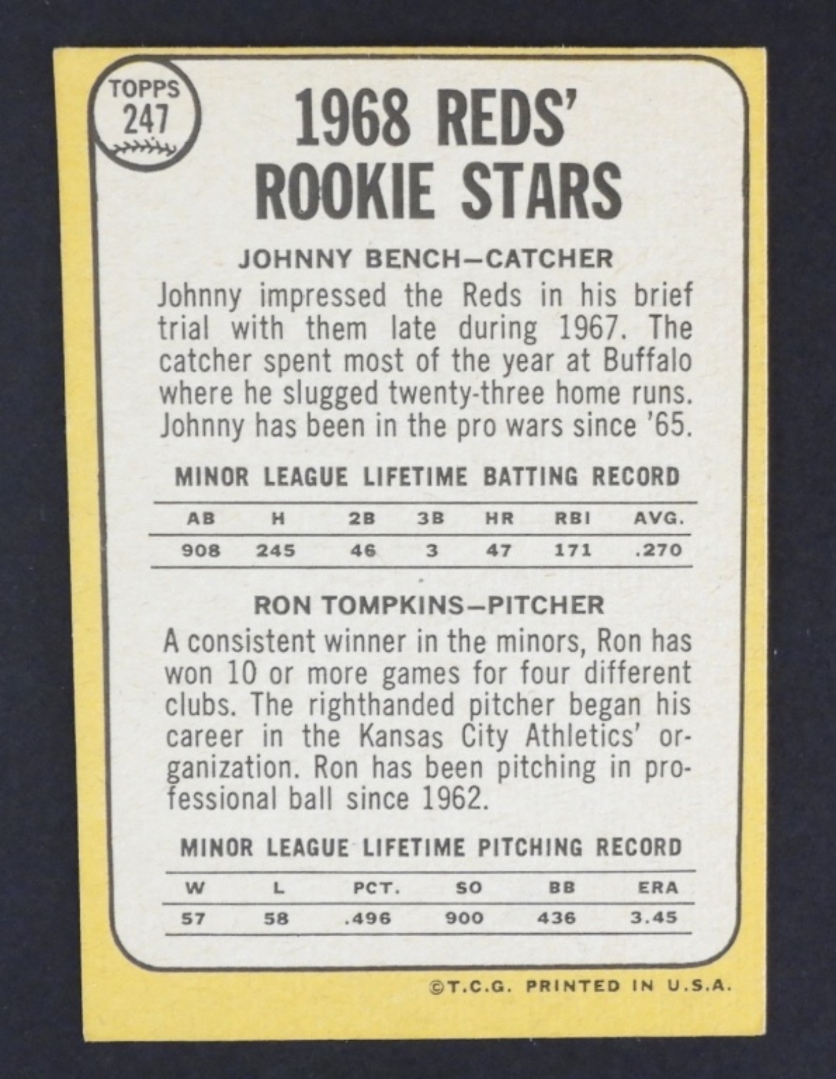 1968 TOPPS #247 JOHNNY BENCH, RON TOMPKINS ROOKIE STARS, (EX)