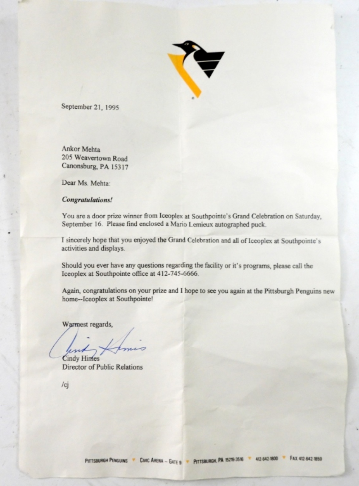 PENGUINS SIGNED PUCK by MARIO LEMIEUX with PENGUINS COA