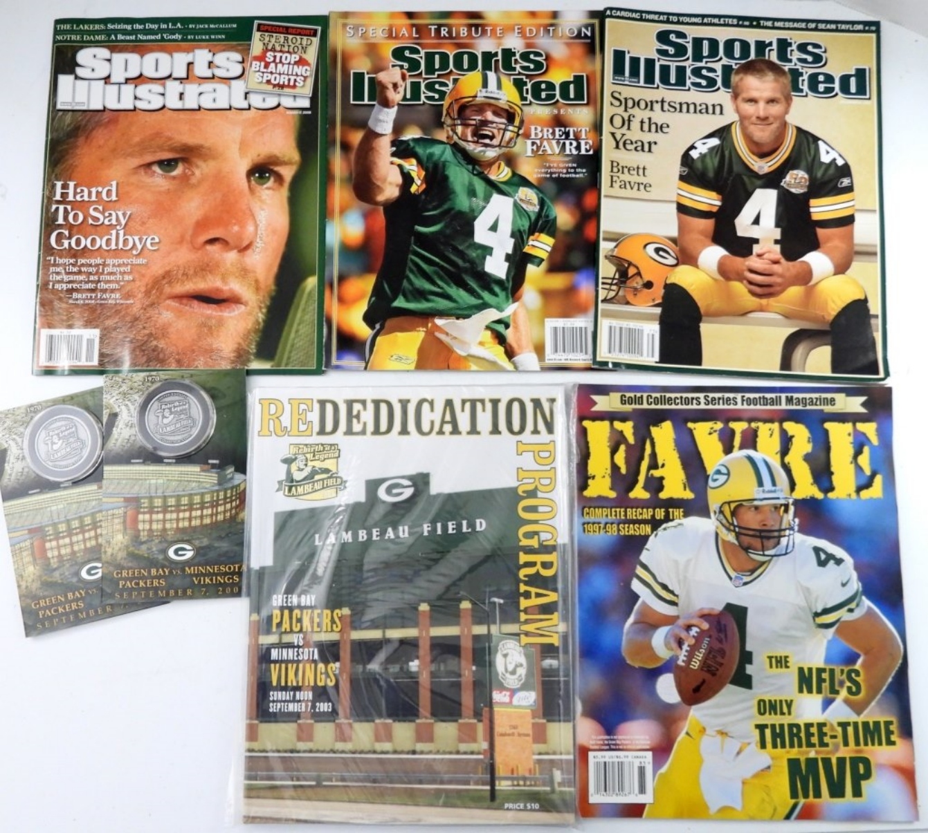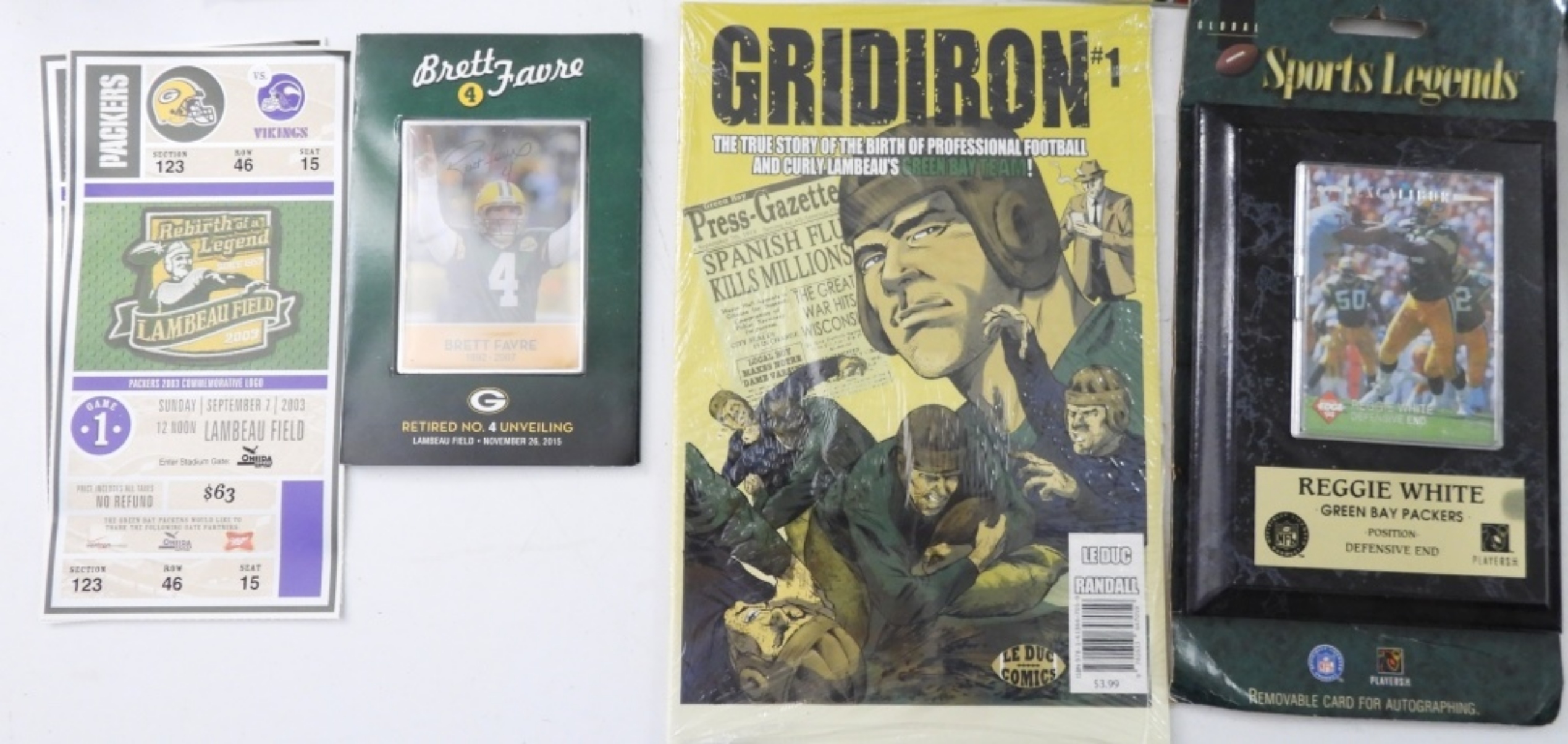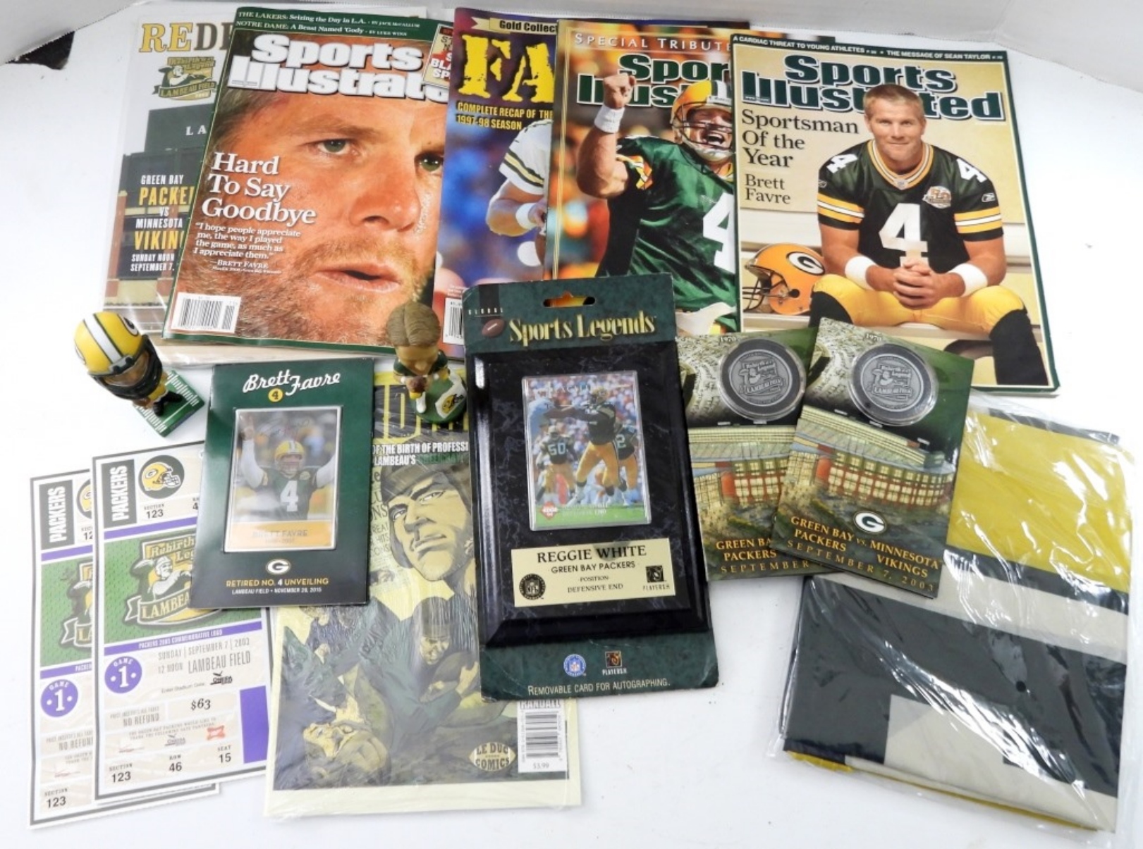 NO COA, REGGIE WHITE PLAQUE & CARD BRETT FARVE BOBBLEHEAD, SIGNED CARD, MAGAZINES, PACKERS FLAG, COINS, PROGRAMS GOOD CONDITION