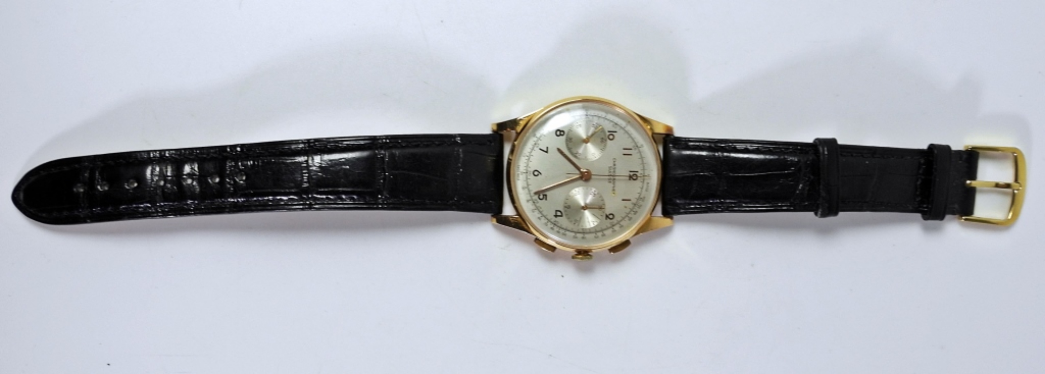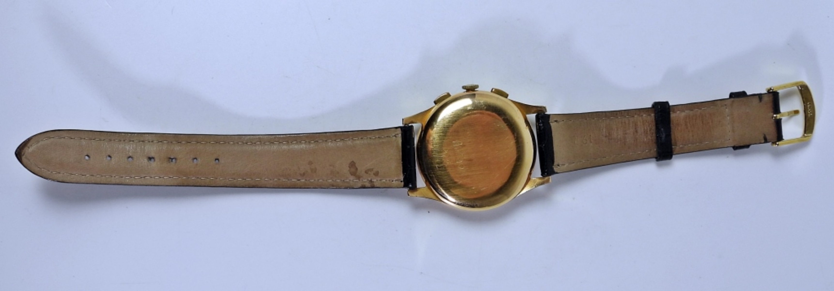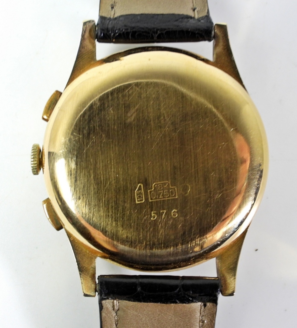 NICE ORIGINAL DIAL. 37mm GOLD SWAPBACK CASE MARKED 18kt. 17 JEWEL MOVEMENT (LANDERON). NEW STRAP