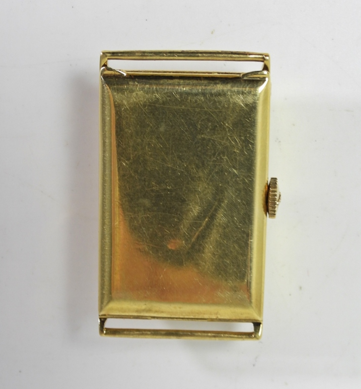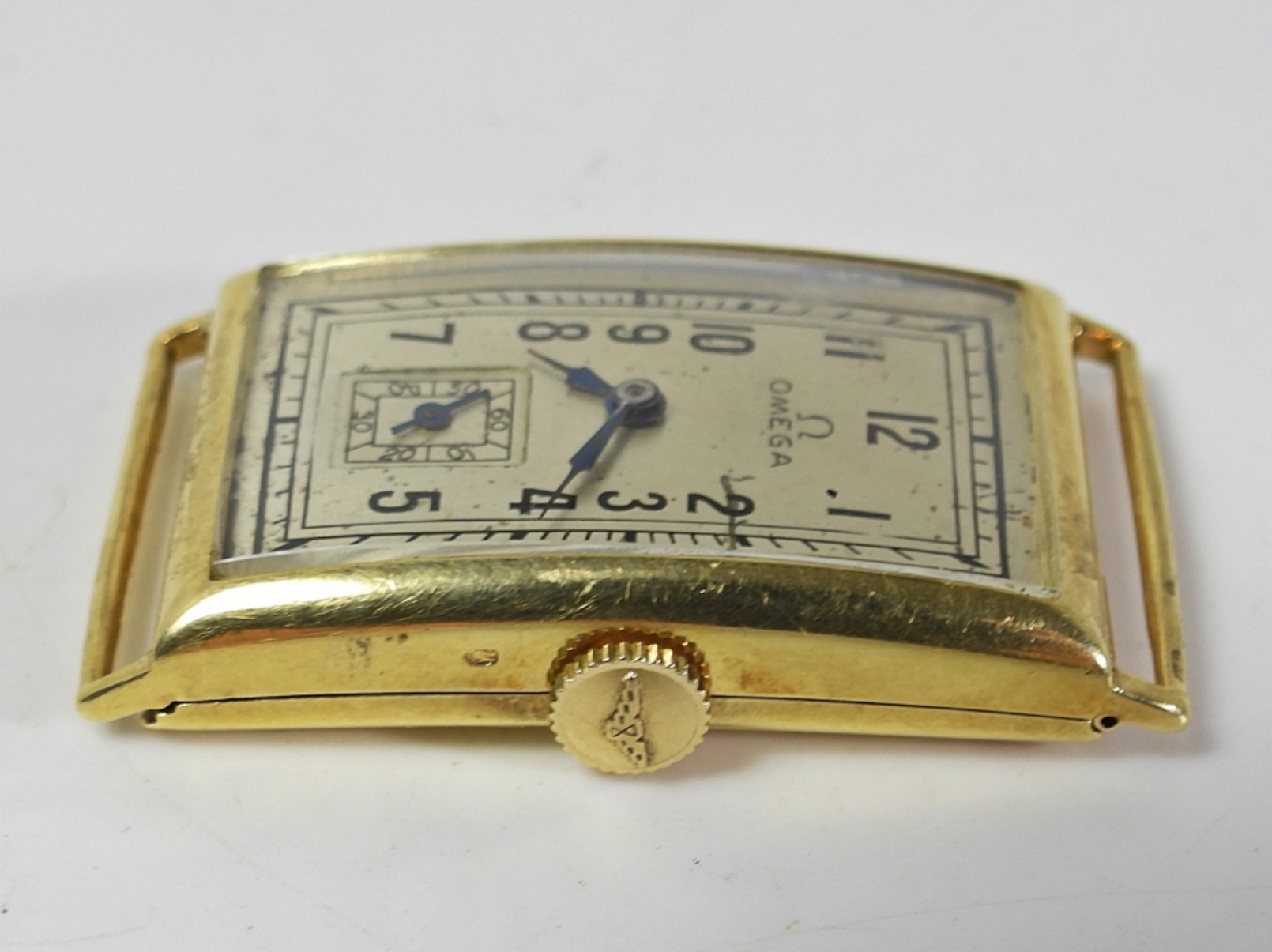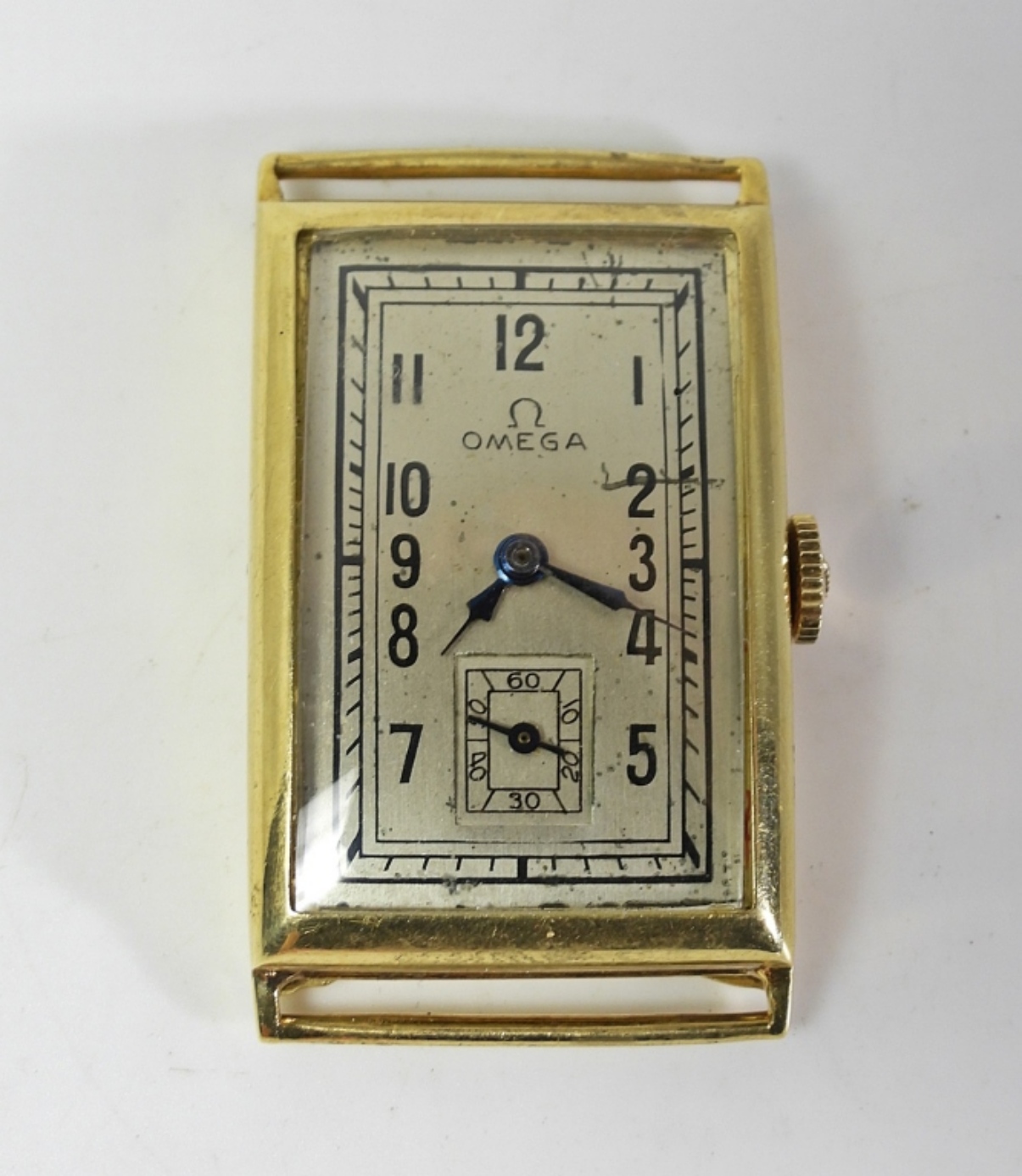 NICE ORIGINA PRINTED DIAL. 32mm LONG. 14kt FULLY SIGNED SWISS OMEGA CASE. 15 JEWEL NICKEL RECTANGULAR MOVEMENT. CIRC 1930’s