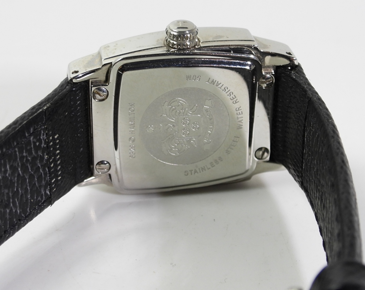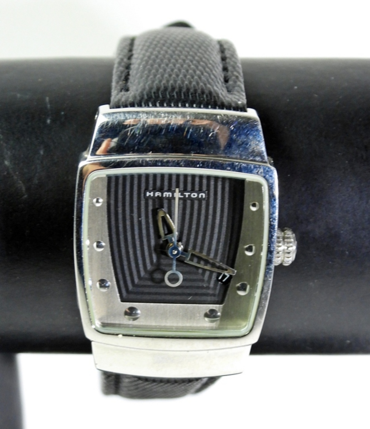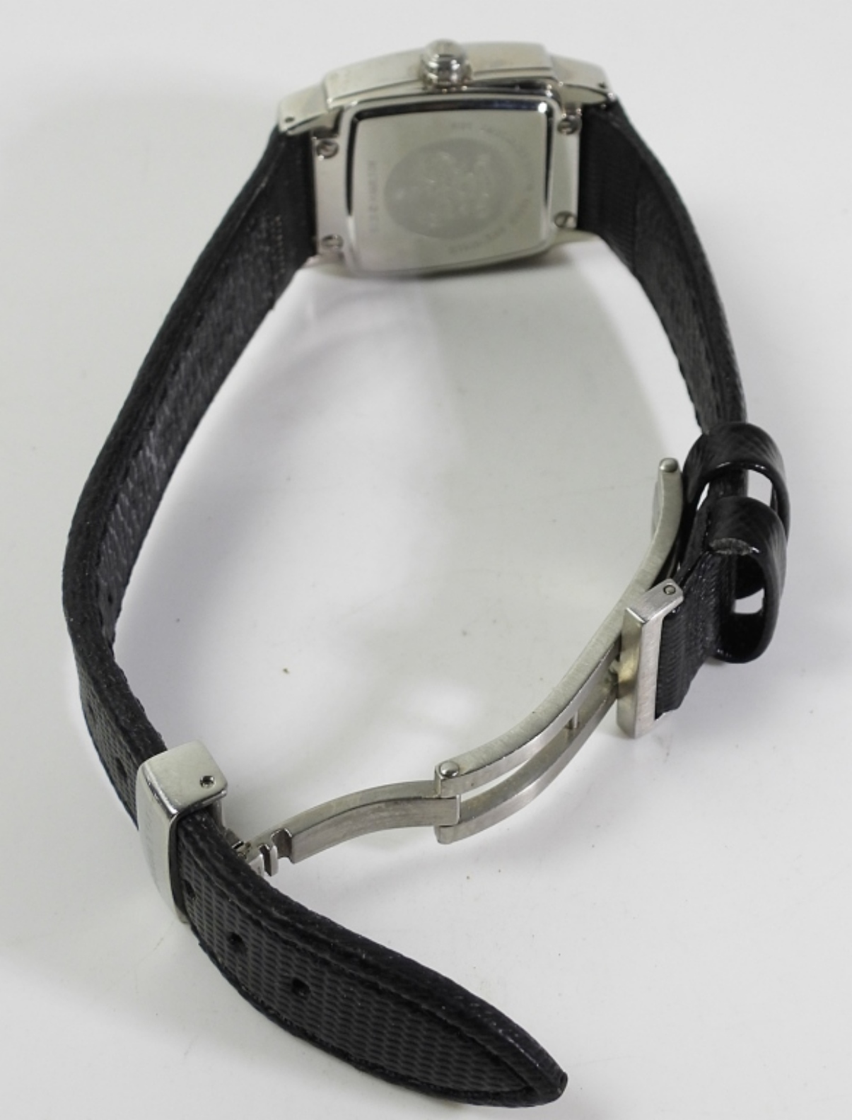 PERFECT BLACK & SILVER DIAL WITH DATE. QUARTZ MOVEMENT. STAINLESS CASE MEASURES 33mm LONG. WITH SIGNED LEATHER STRAP ON DEPLOYMENT. CLASP IN EXCELLENT CONDITION