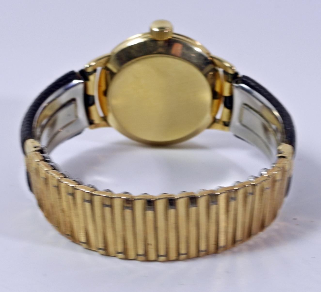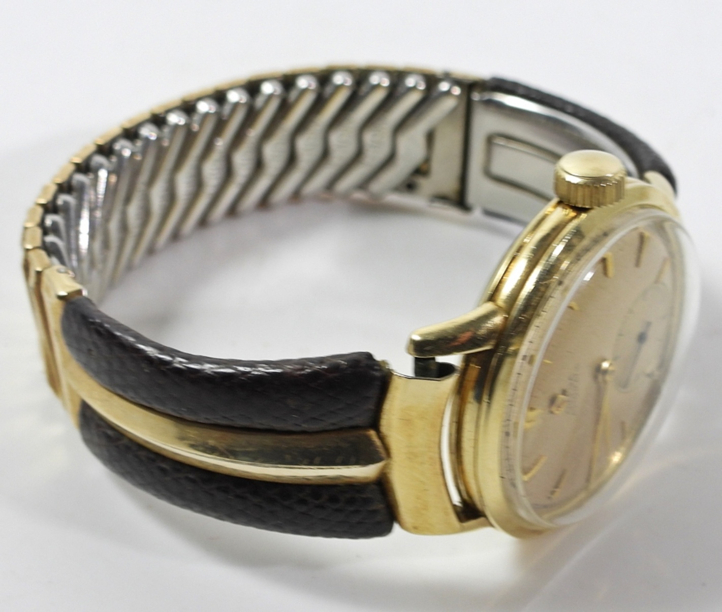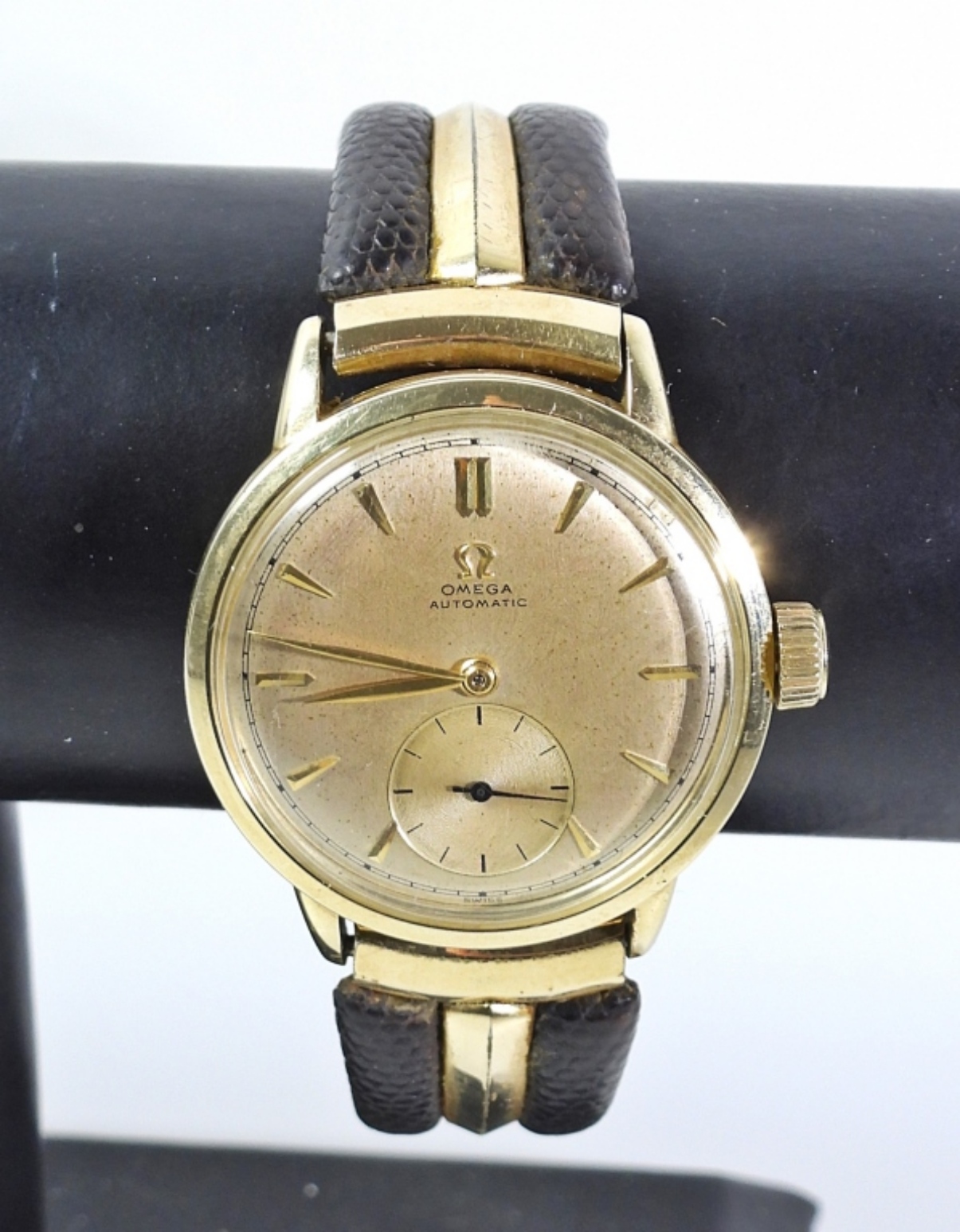 33mm CASE. NICE ORIGINAL SUB SECONDS DIAL. 17 JEWEL AUTOMATIC BOUNCER MOVEMENT. 14kt GOLD SNAP BACK CASE SIGNED OMEGA & WADSWORTH. COMPLETE WITH VINTAGE KREISLER STRETCH BAND.