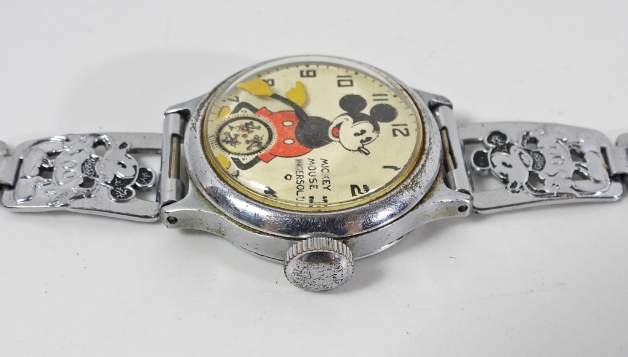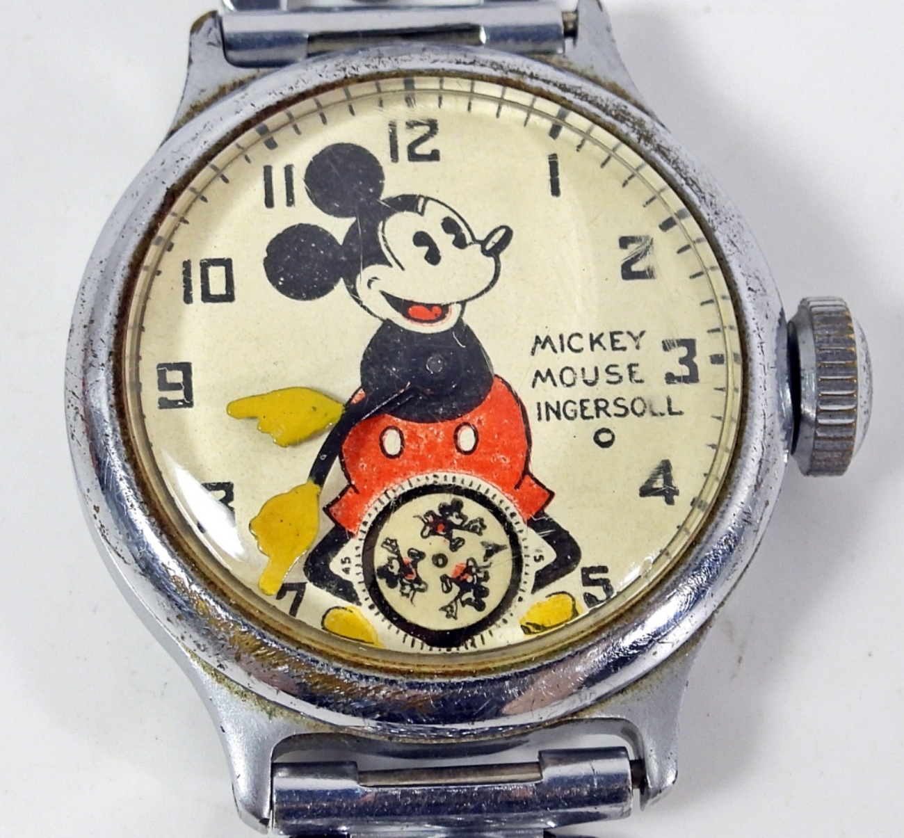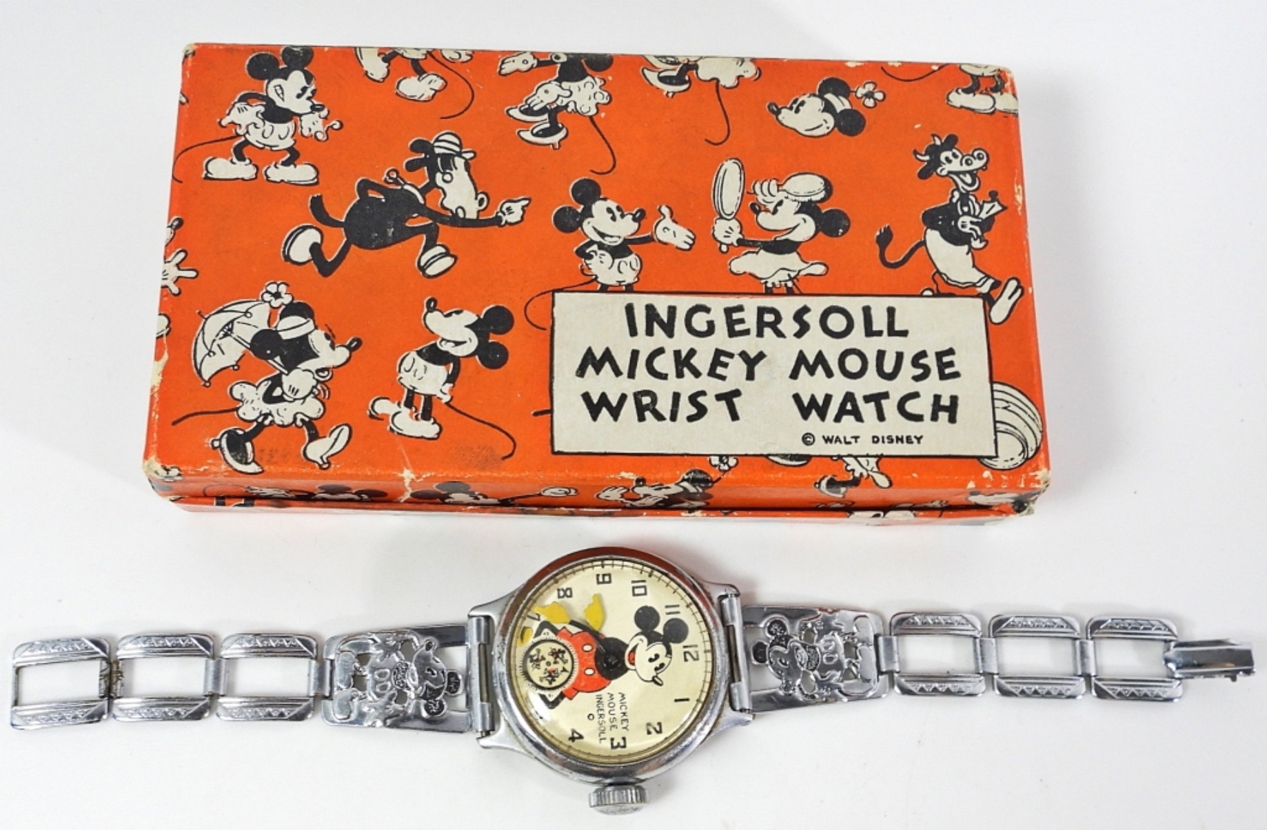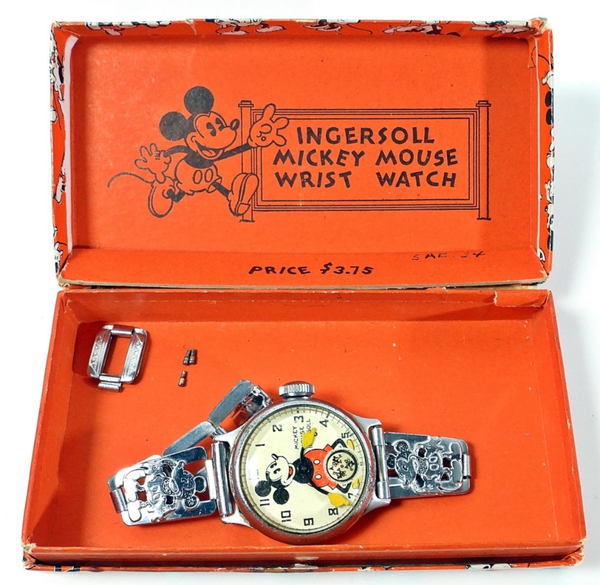 METAL BRACELT WITH APPLIED MICKEYS. WATCH WITH REVOLVING SECONDS IN RUNNING ORDER. COMPLETE WITH ORIGINAL RED BOX AND EXTRA BRACELET LINK.