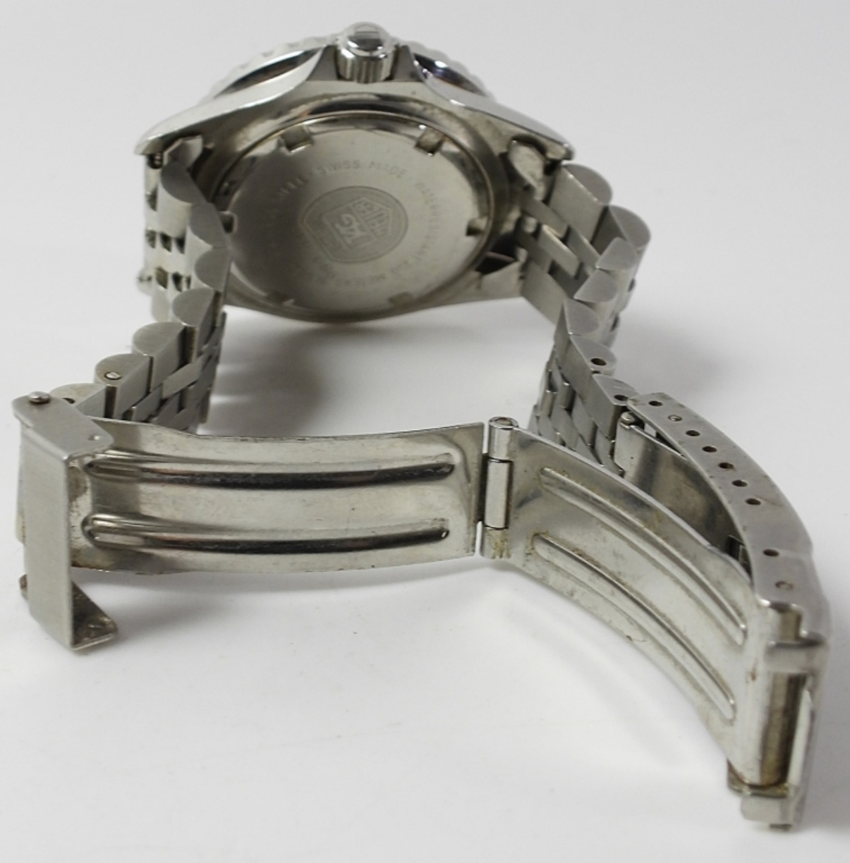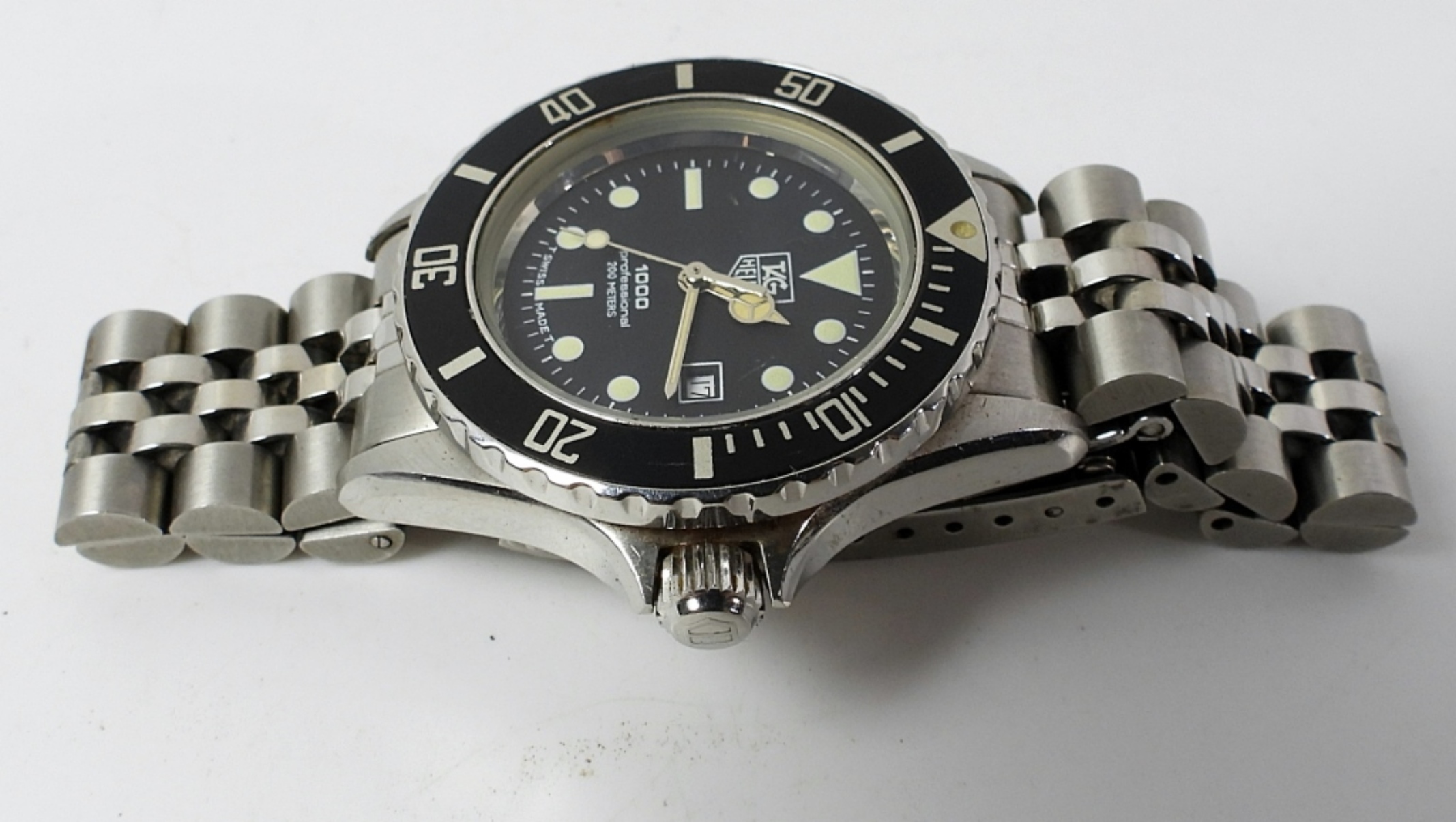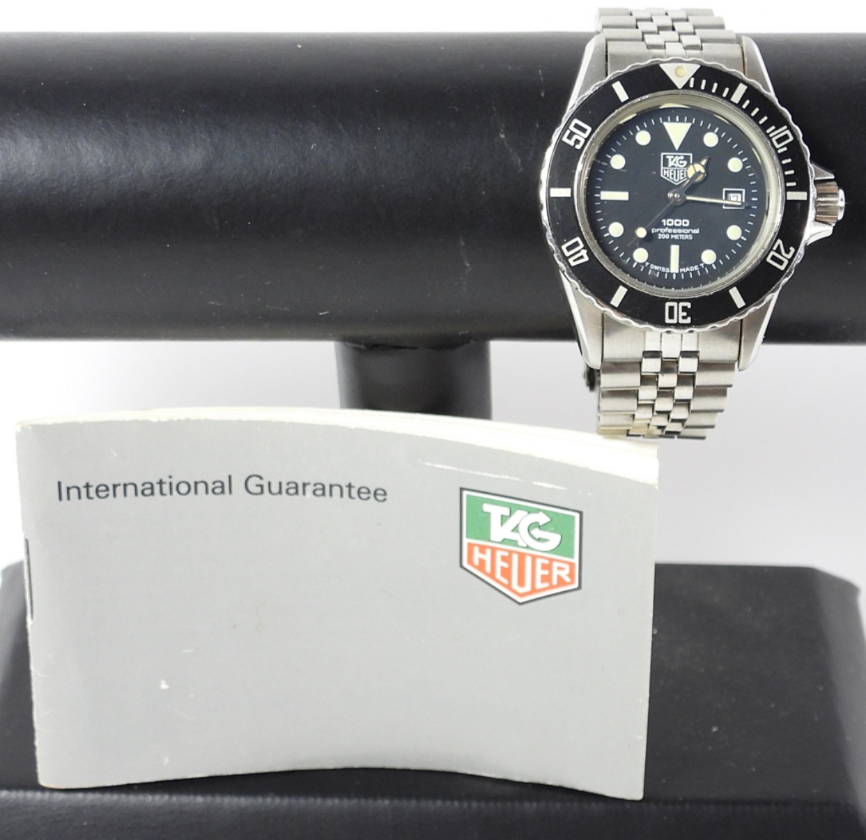PERFECT BLACK FACE. QUARTZ MOVEMENT. 32mm STAINLESS CASE WITH SCREWBACK. ROTATING BEZEL AND SCREWDOWN CROWN. WITH SIGNED FLIP LOCK STYLE BRACELET. COMPLETE WITH GUARANTEE BOOKLET DATED OCT. 1990