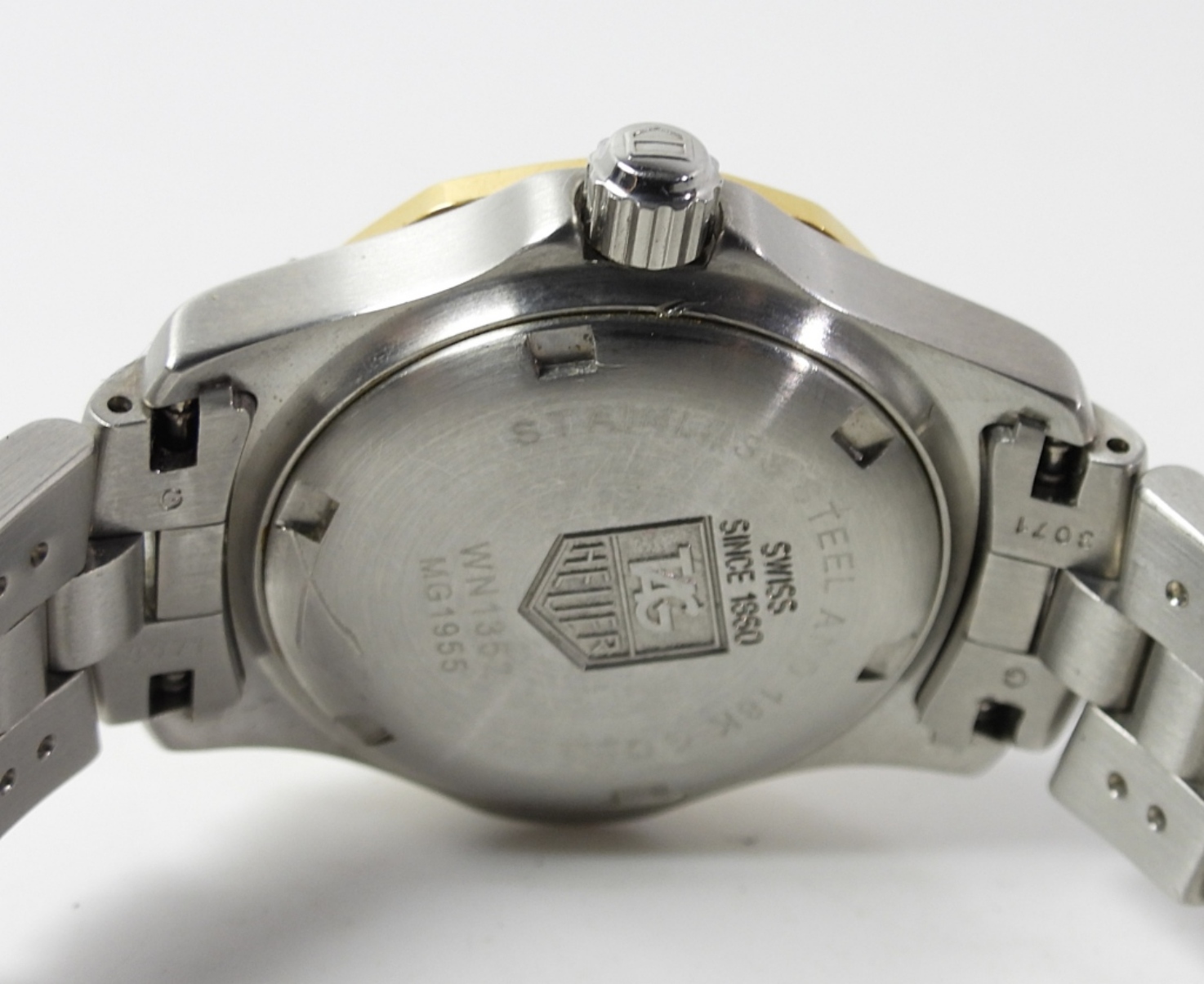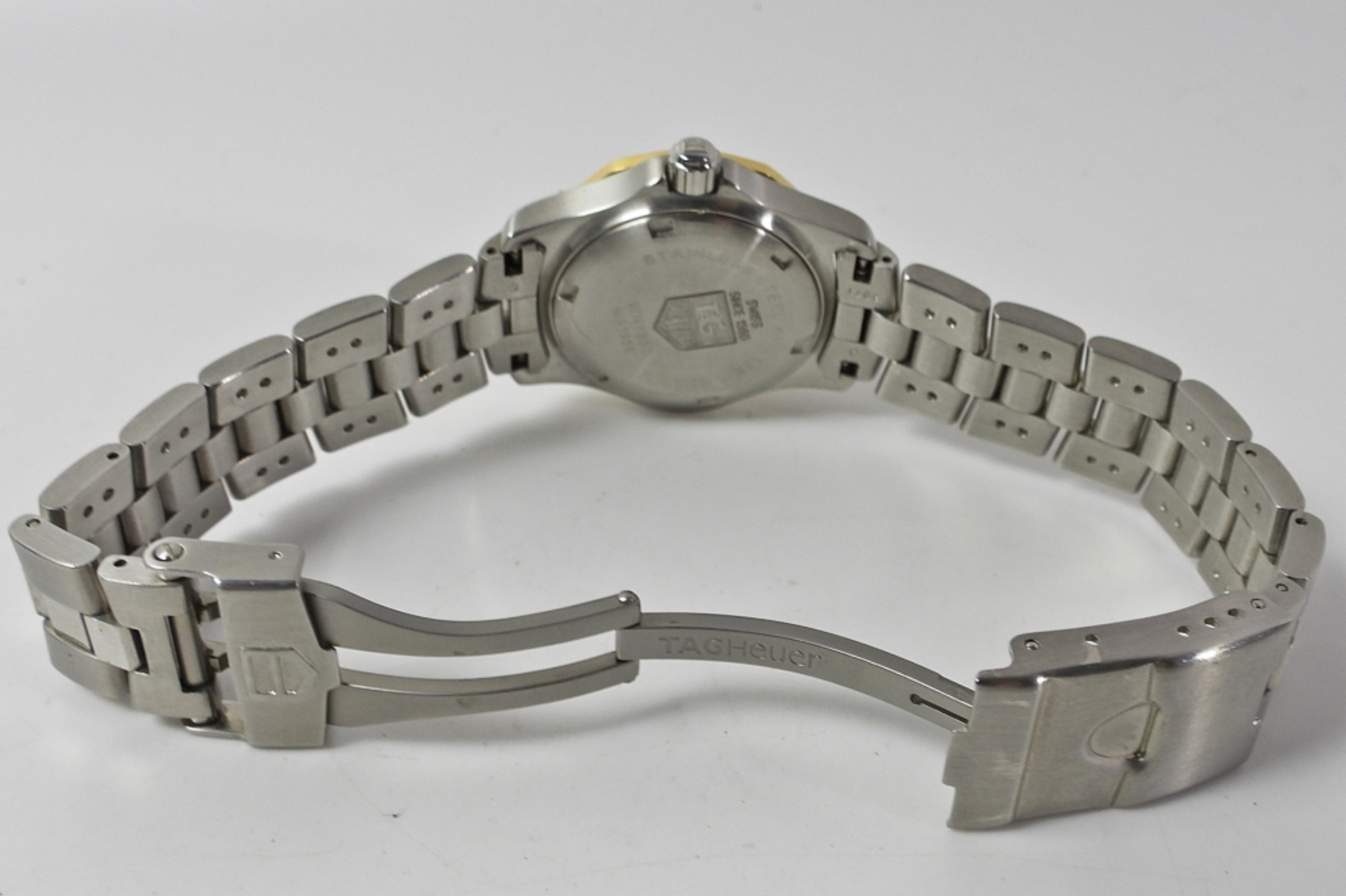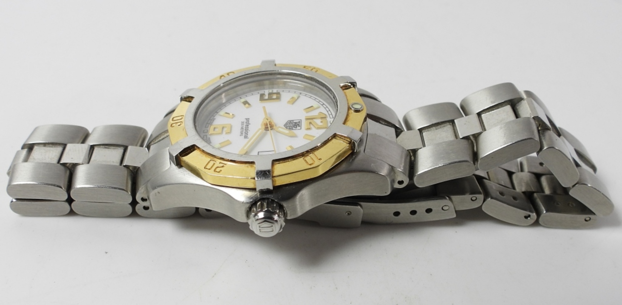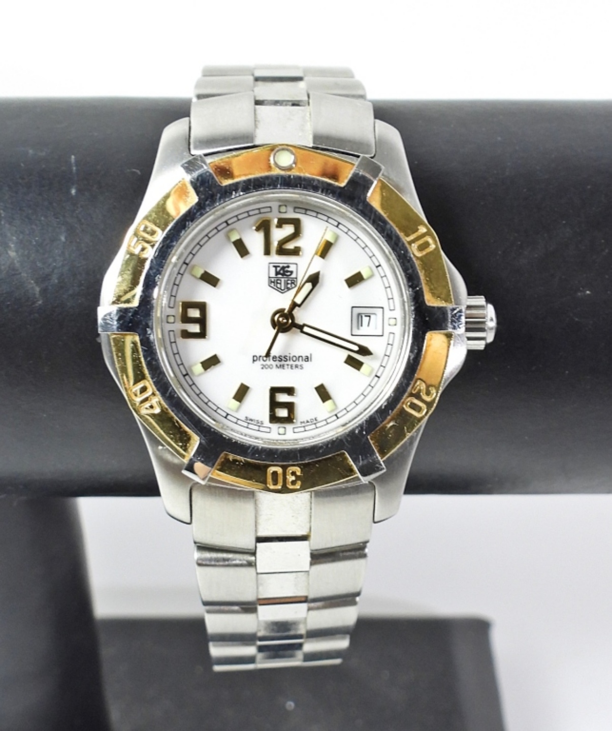 PERFECT WHITE DIAL. 29mm DIAMETER CASE WITH GOLD REVOLVING BEZEL. QUARTZ MOVEMENT. FULLY SIGNED TAG STAINLESS BRACELET.