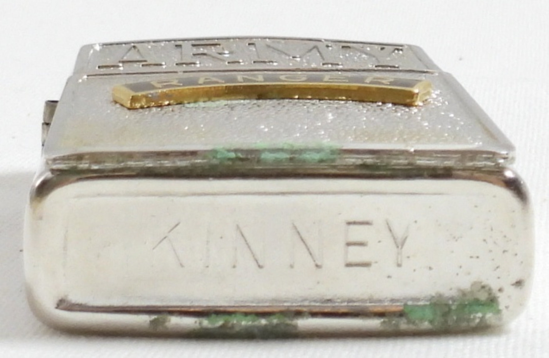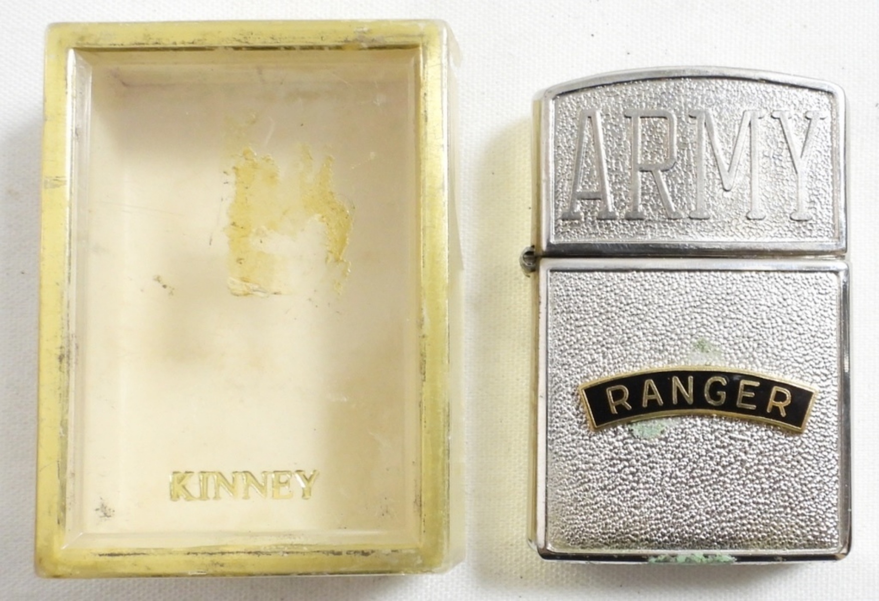 KINNEY ARMY RANGER LIGHTER IN BOX “ARMY”, “RANGER” BADGE, TEXTURED SILVER