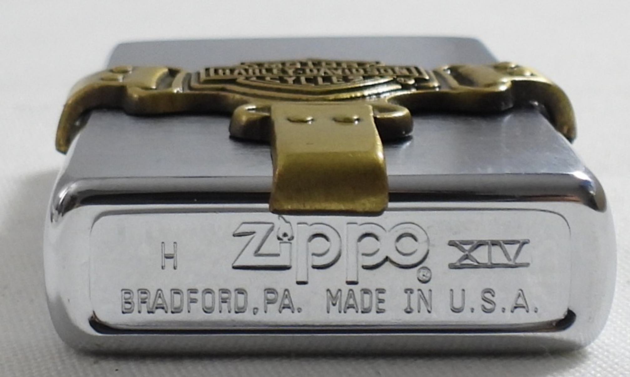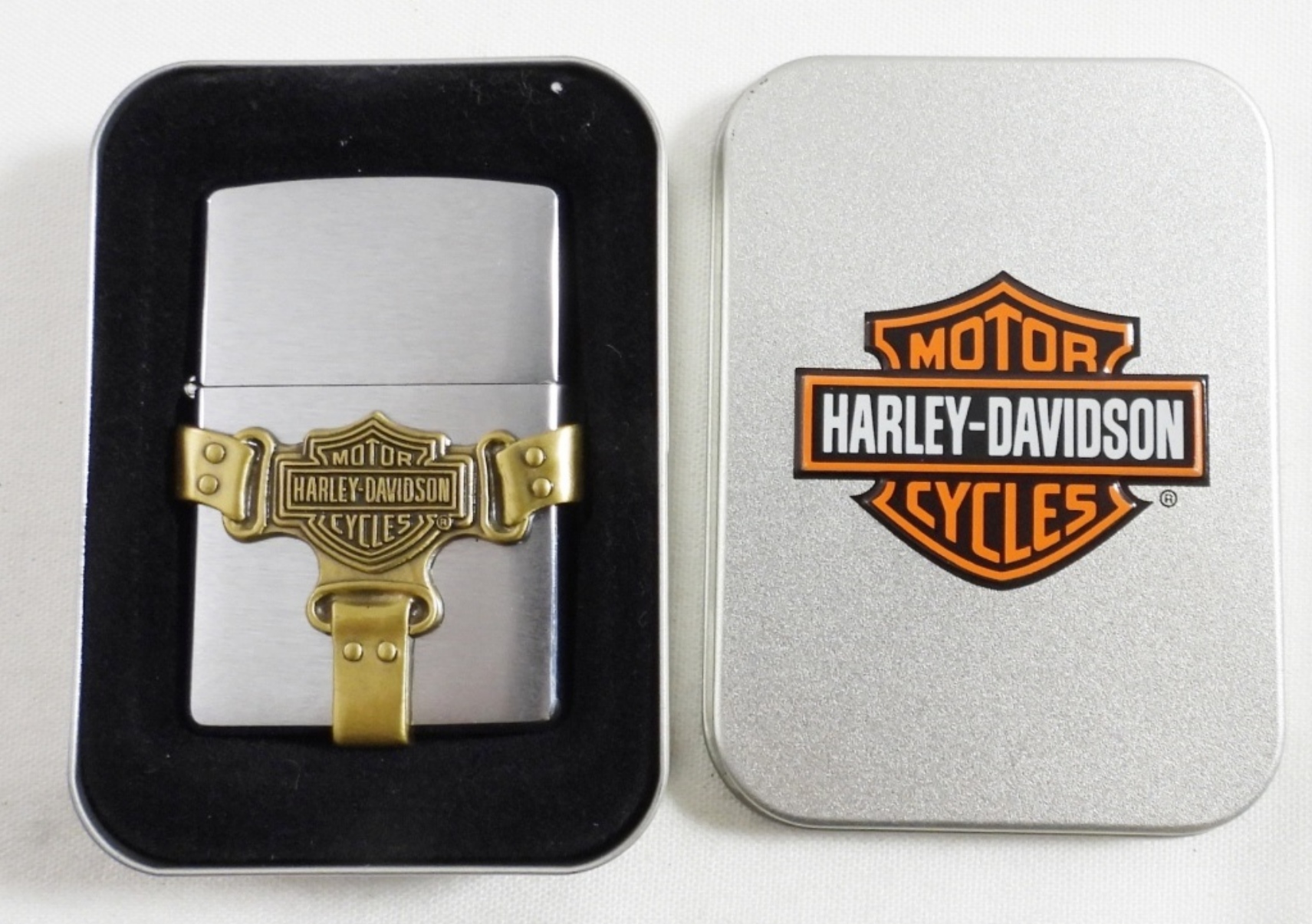 1998 HARLEY DAVISON BOOT STRAP ZIPPO (SEALED/UNFIRED) IN ORIGINAL TIN BRUSHED CHROME & BRASS
