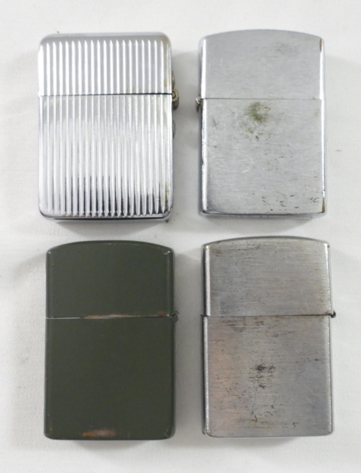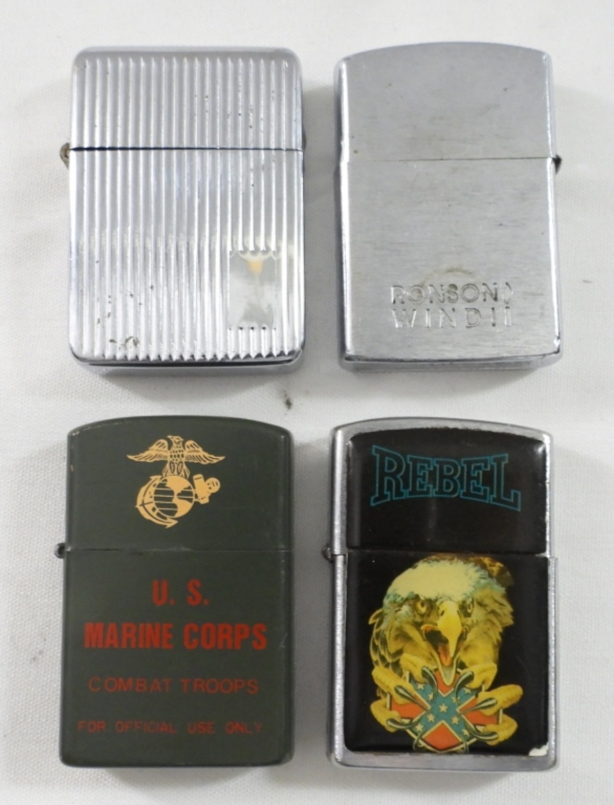 (4) VINTAGE LIGHTERS ALL DIFFERENT, MARINE CORPS DESIGN, REBEL EAGLE, TEXTURED SILVER, RONSON WIND II