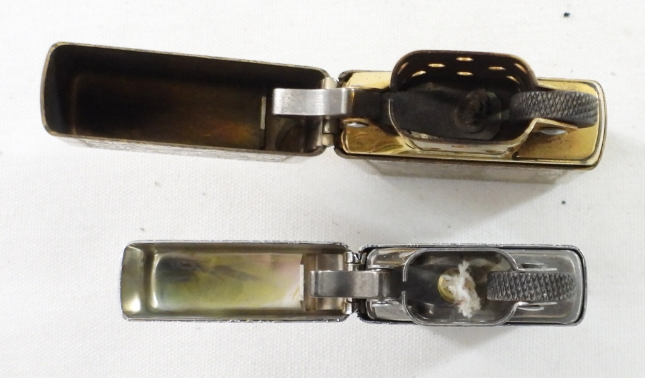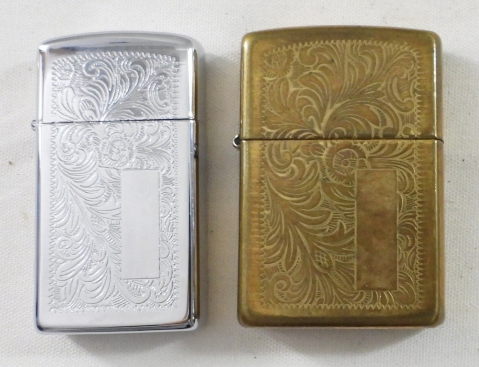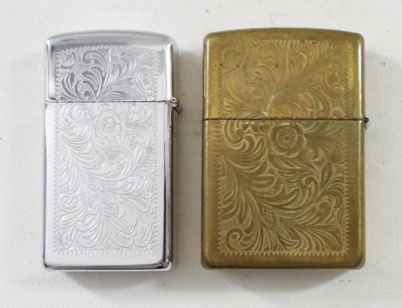 (1) BRASS 1995 & (1) SILVERTONE 1998 ZIPPO ORNATE FLORAL PATTERN. BRASS FIRED, SILVERTONE UNFIRED