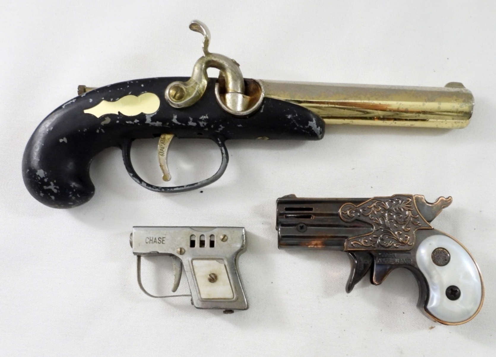 (3) PISTOL-SHAPED LIGHTERS (1) BLACK AND GOLD FLINTLOCK LIGHTER PARTS & REPAIR, (1) CHASE HANDGUN LIGHTER WORN CONDITION (1) MODERN ANGEL MASCOT PISTOL LIGHTER GOOD CONDITION
