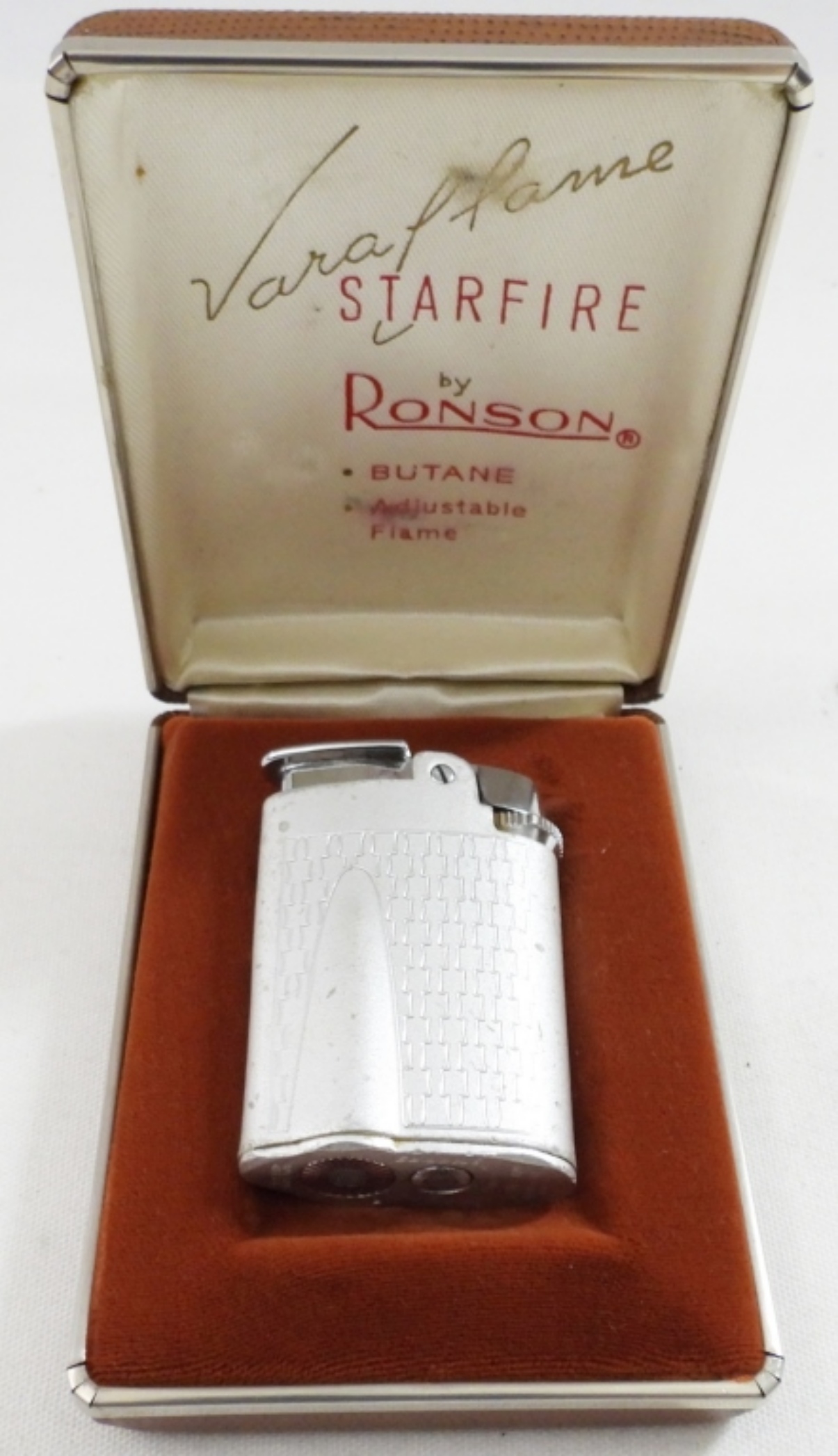 VINTAGE RONSON VARAFLAME STARFIRE SILVER TONE BUTANE LIGHTER WITH BOX