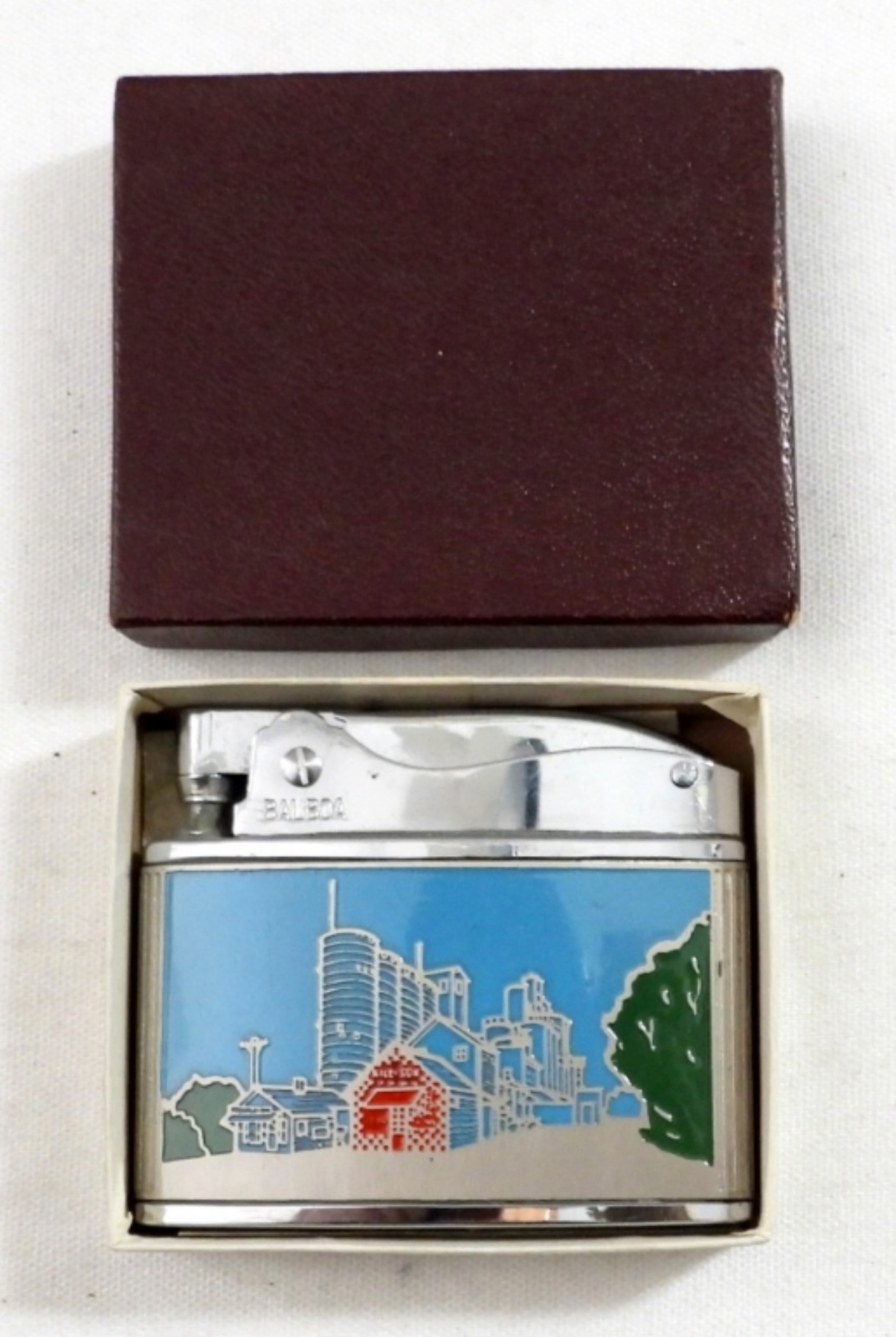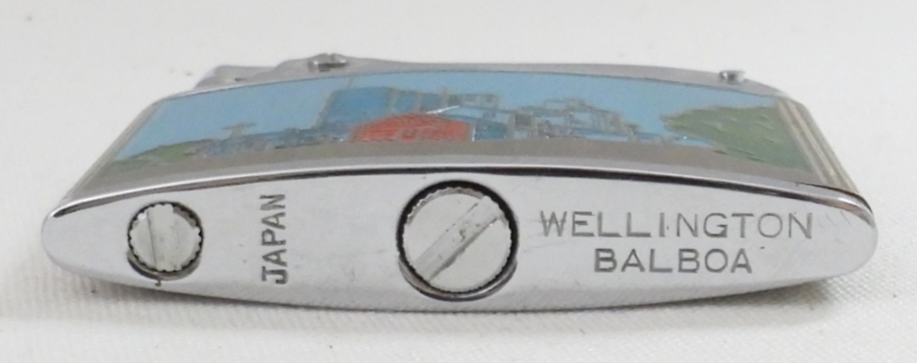 VINTAGE WELLINGTON BALBOA UNFIRED LIGHTER ADVERTISEMENT ON ONE SIDE AND CITY SCAPE ON THE OTHER