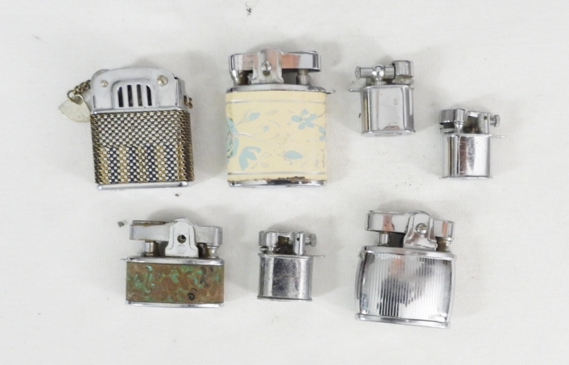 (7) VINTAGE SMALL / TINY LIGHTERS , SMALL LIGHTERS W DESIGN & TINY LIFT ARM SILVER LIGHTERS