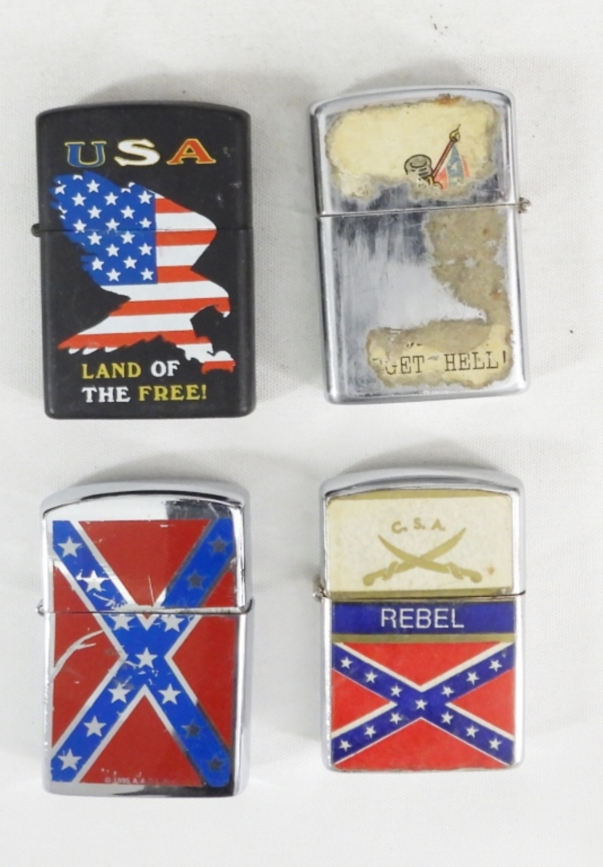 (3)CONFEDERATE FLAG & (1)USA LIGHTER, 2 CONF. FLAG FADED/WORN, 1 CONF. FLAG, “REBEL” CSA & PLAYING CARD DESIGN, 1 FLAG EAGLE “USA LAND OF THE FREE”