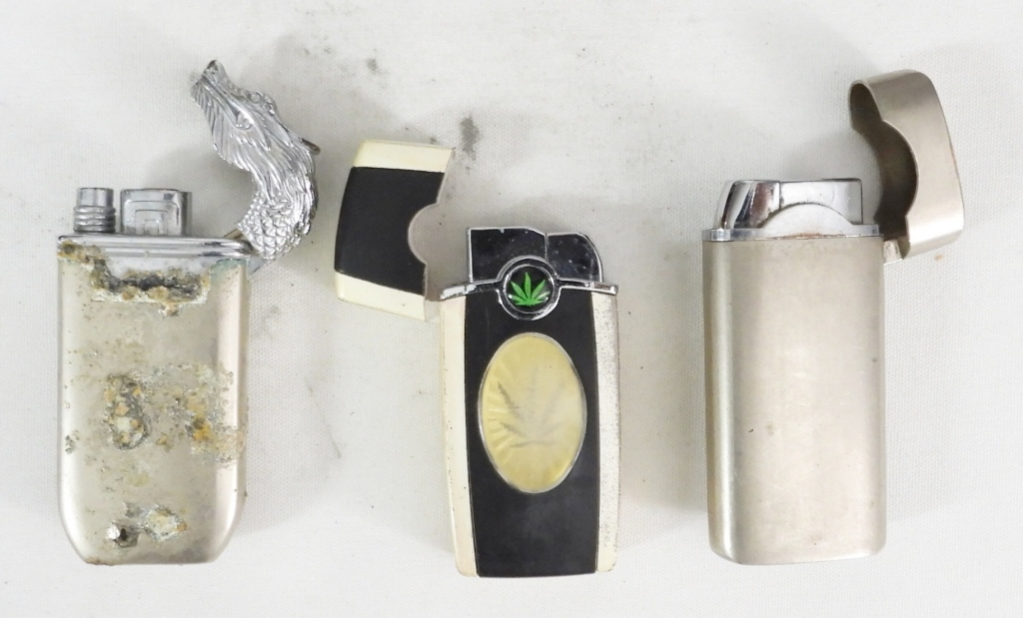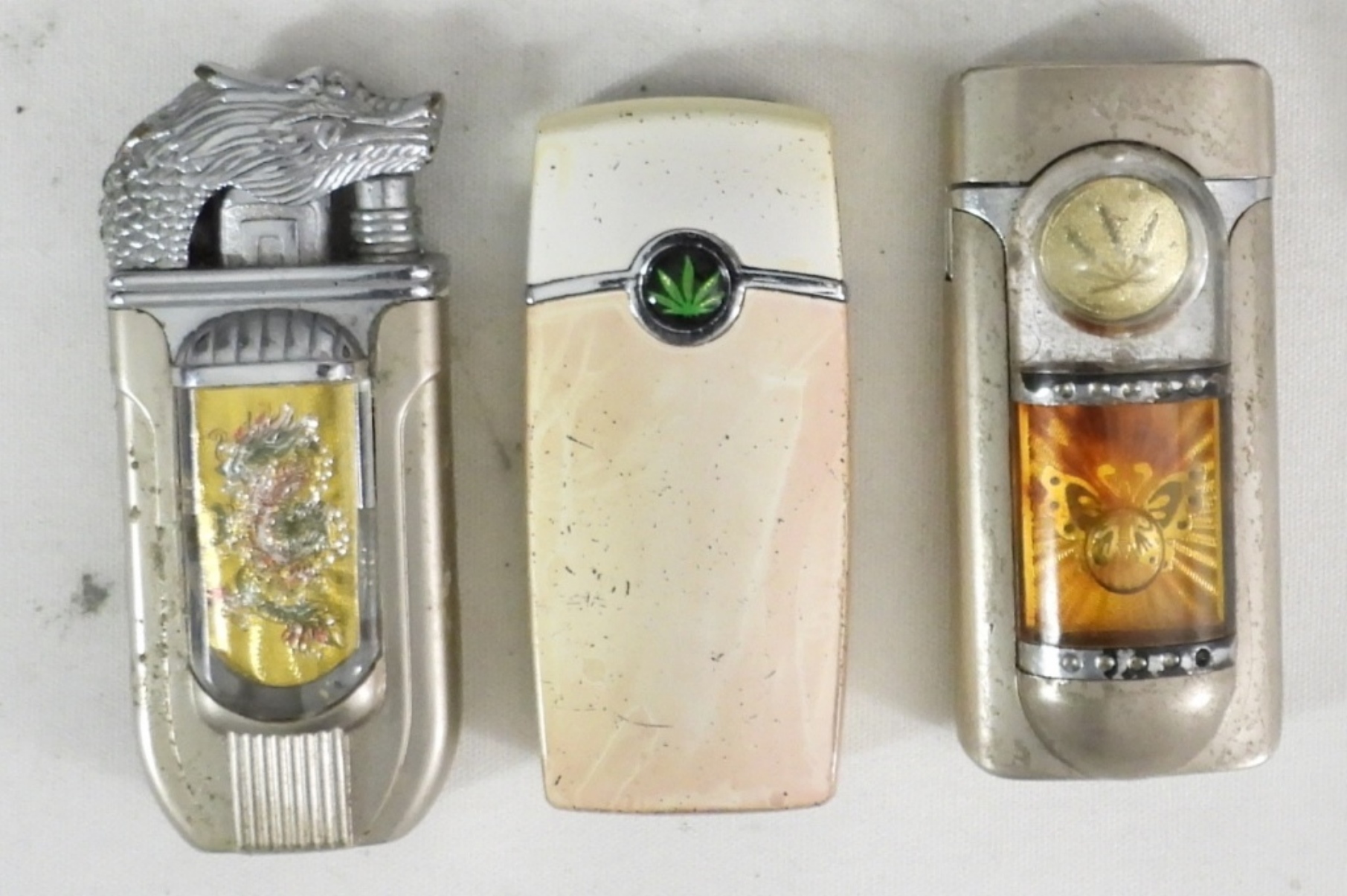 (3) BUTANE LIGHTERS W ENAMEL DESIGNS, LEAF DESIGN, LEAF & BUBBLE/WATER WINDOW BUTTERFLY, DRAGON ENAMEL DESIGN W DRAGON HEAD