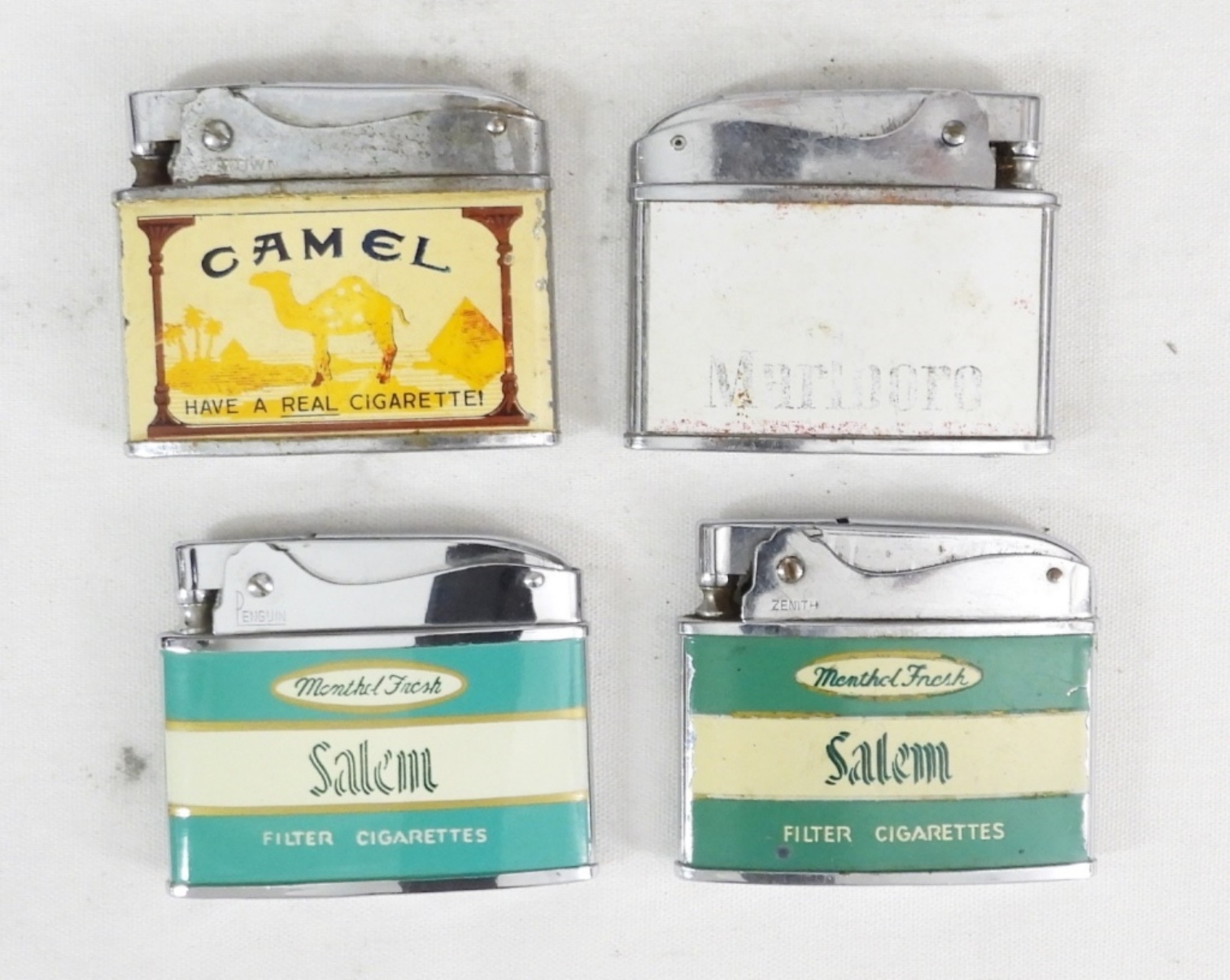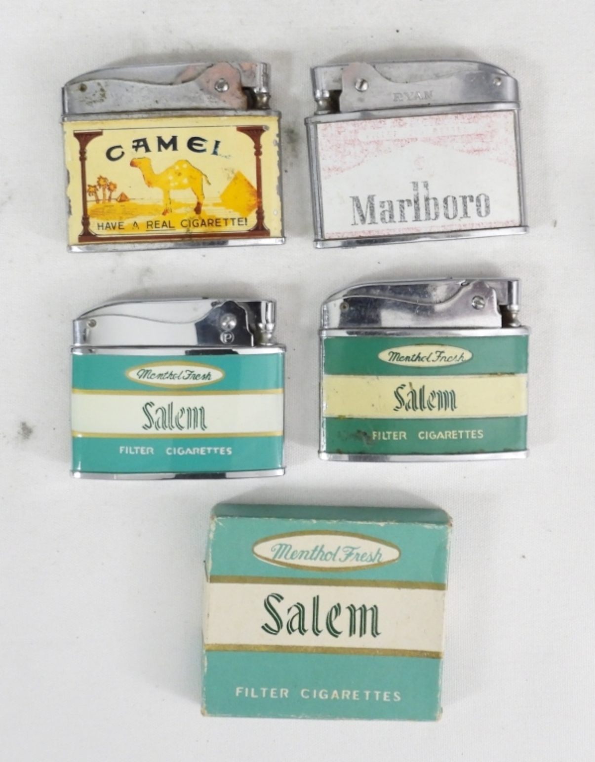 (4) CIG. ADVERTISING FLAT LIGHERS, SALEM MENTHOL FRESH LIGHTER IN ORIGINAL BOX, CAMEL, SALEM, MARLBORO (FADED)