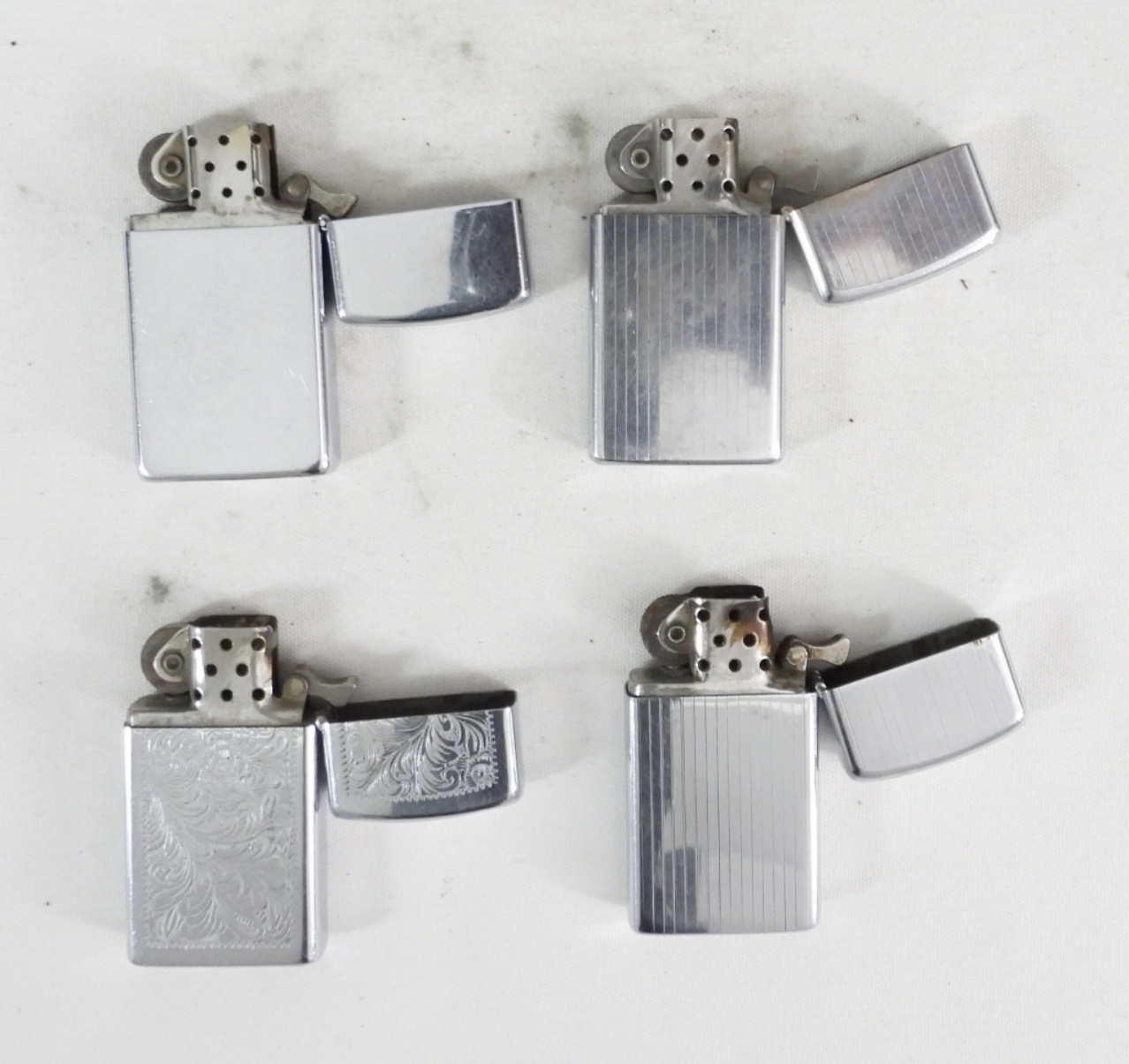 (4) ART DECO SILVERTONE SLIM ZIPPOS, VARIOUS YEARS, SCROLL PATTERN MONOGRAMMED “KATHY”, CROSS HATCH PATTERN MONOGRAMMED “B R”, (2) SIMPLE LINES DESIGNS