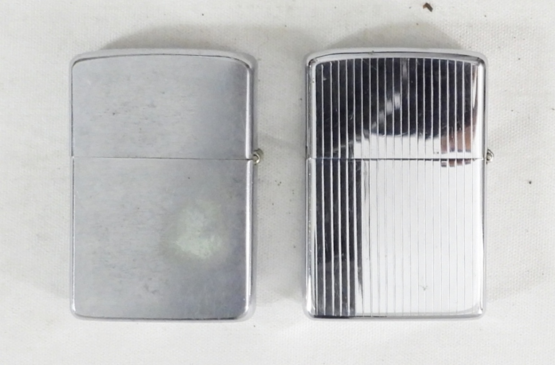 (2) SILVERTONE ZIPPOS 1961 & 1977, 1961 WORN/USED PAT 2517191 MATCHING INSERT, 1977 FIRED ART DECO LINES NO MONOGRAM