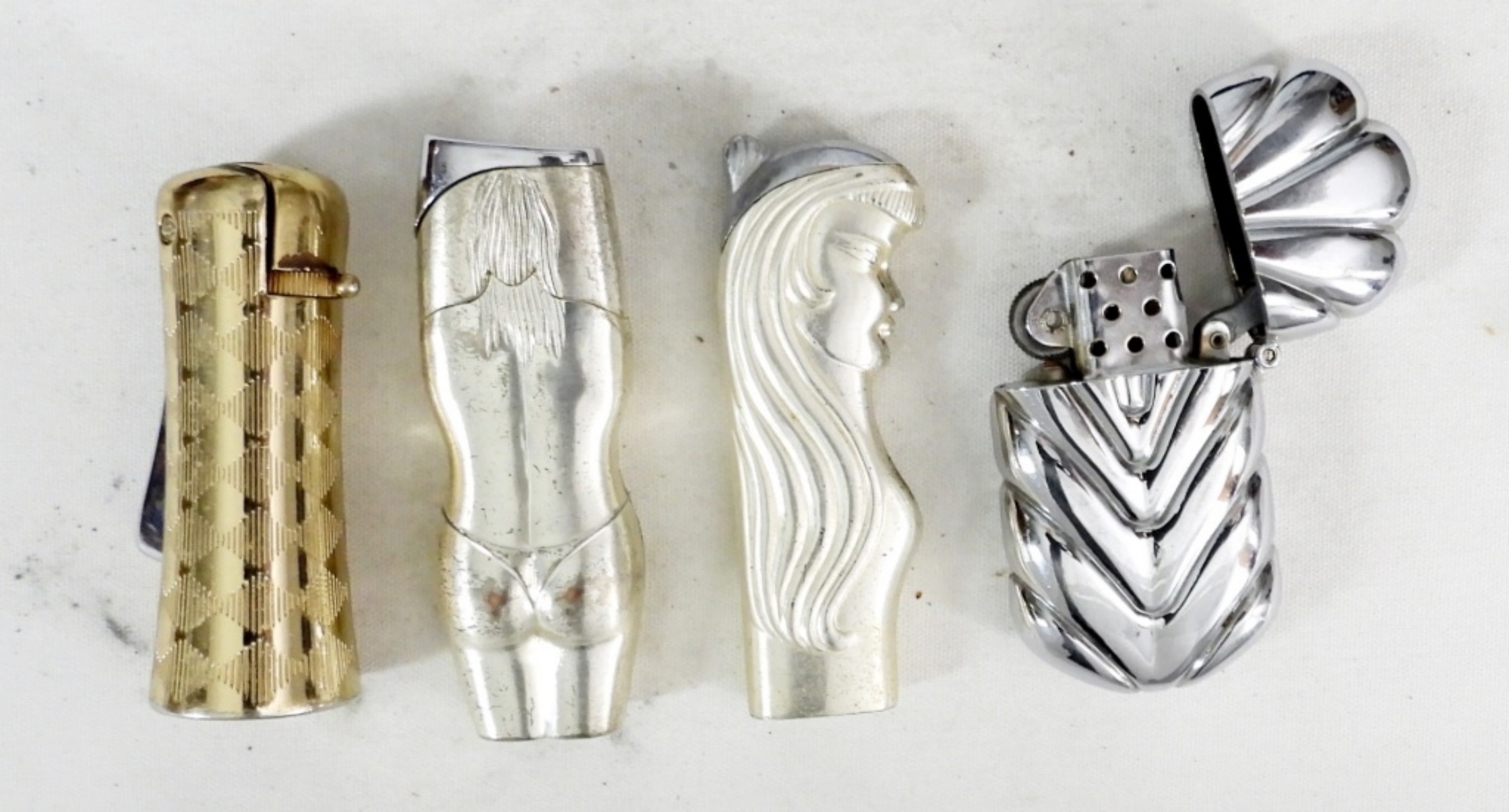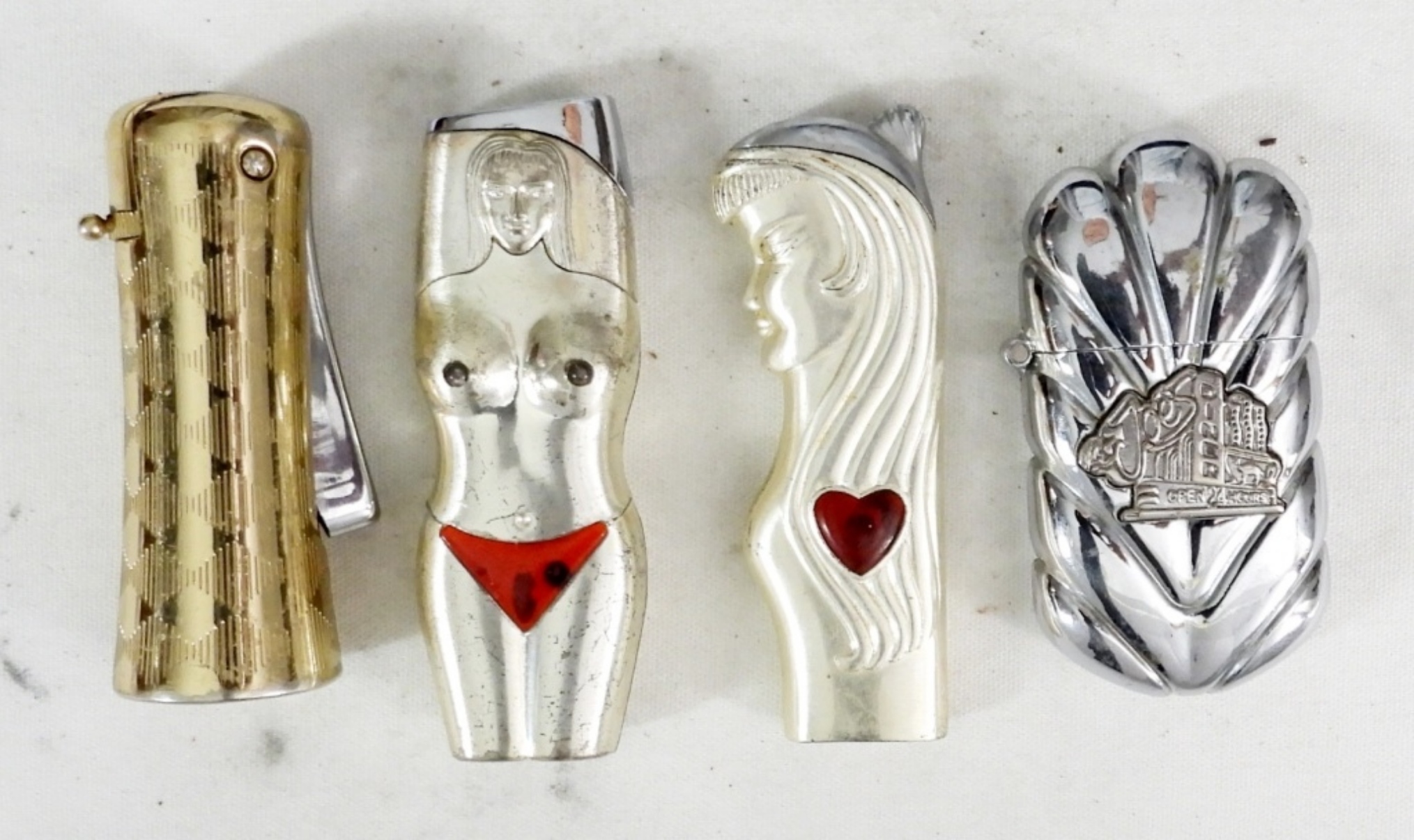 (4) UNUSUAL BUTANE LIGHTERS, SILVERTONE NUDE WOMAN SHAPE, SILVERTONE WOMAN AND HEART, JOES DINER SILVERTONE, RONSON GOLDTONE CYLINDER