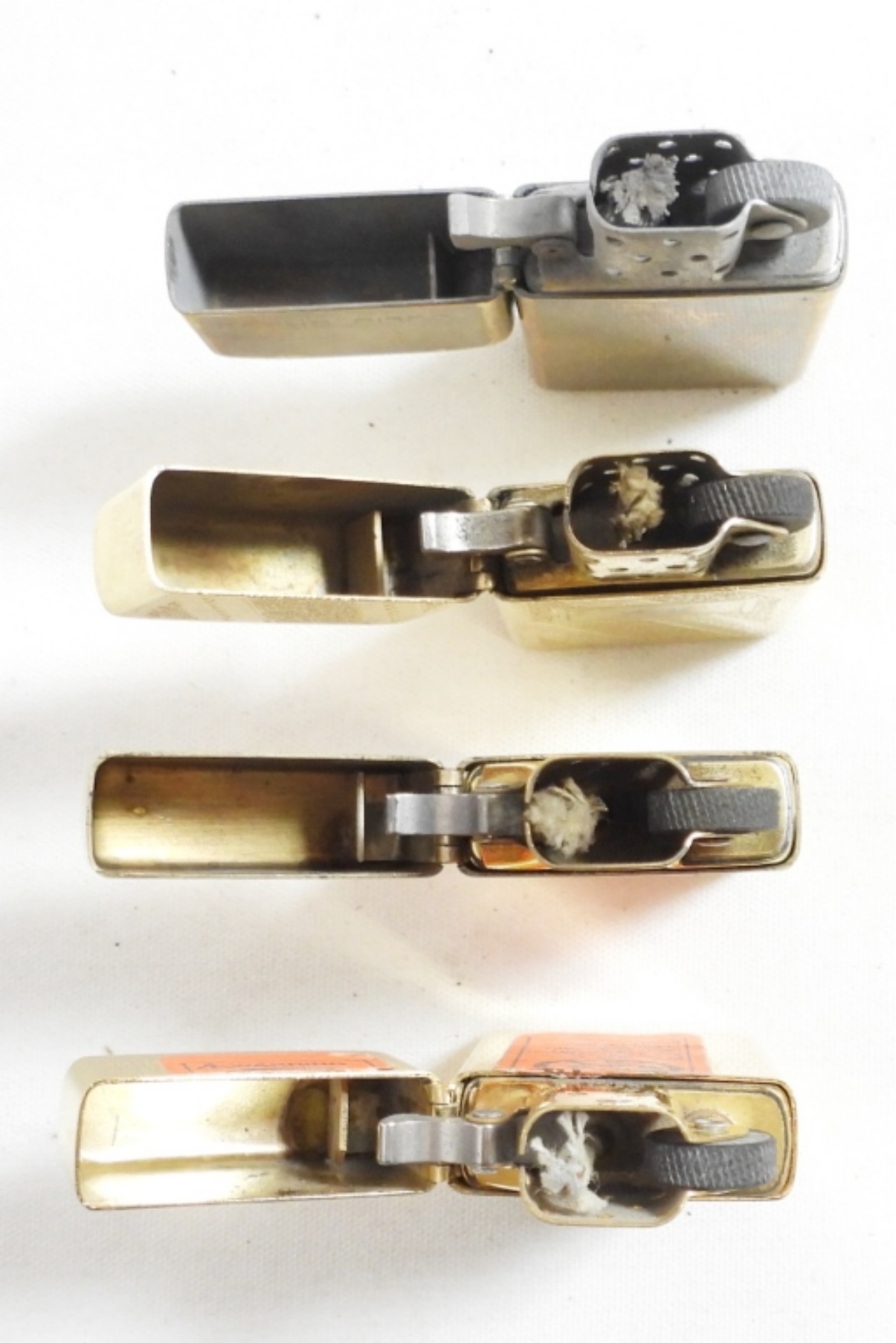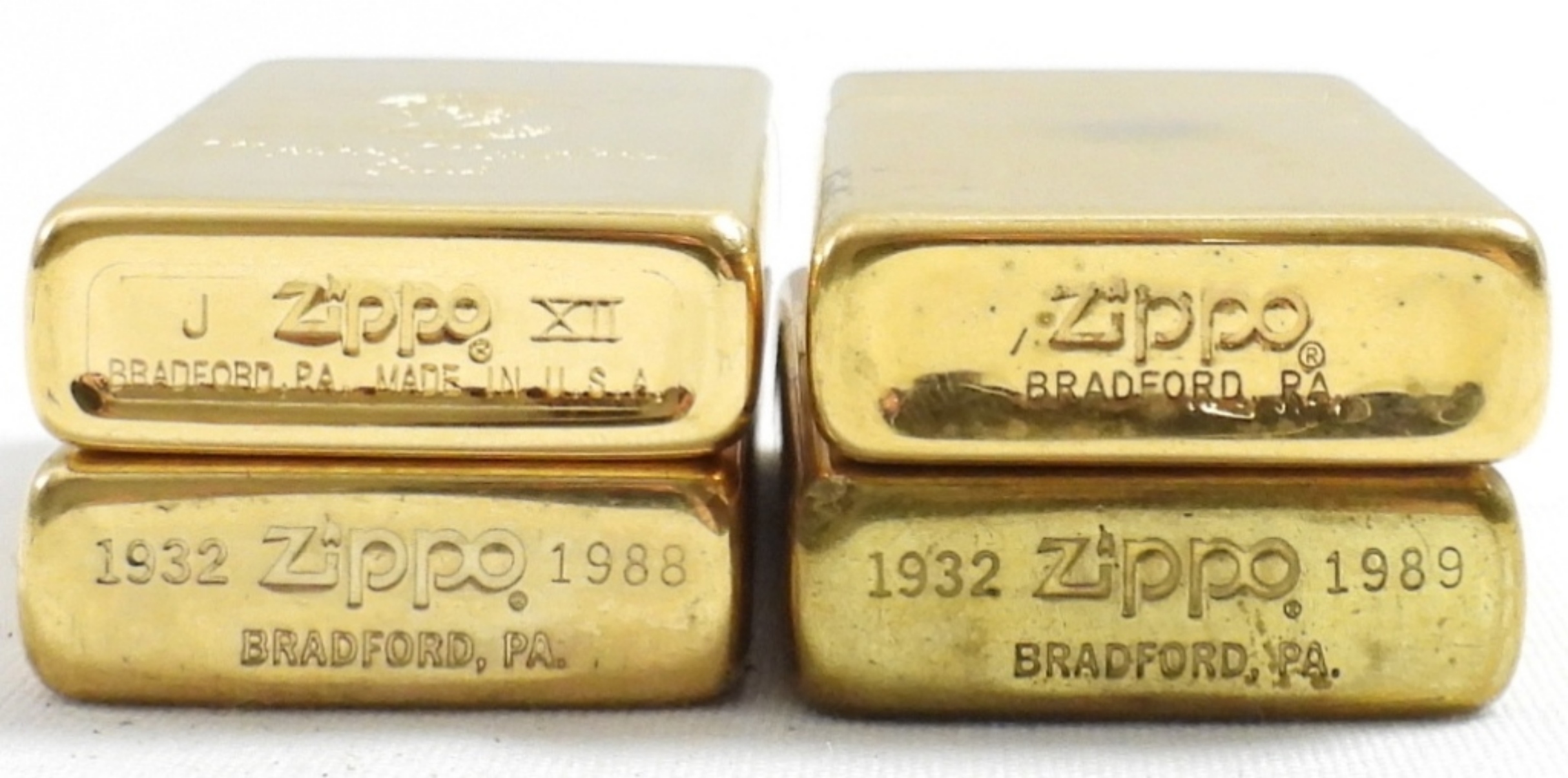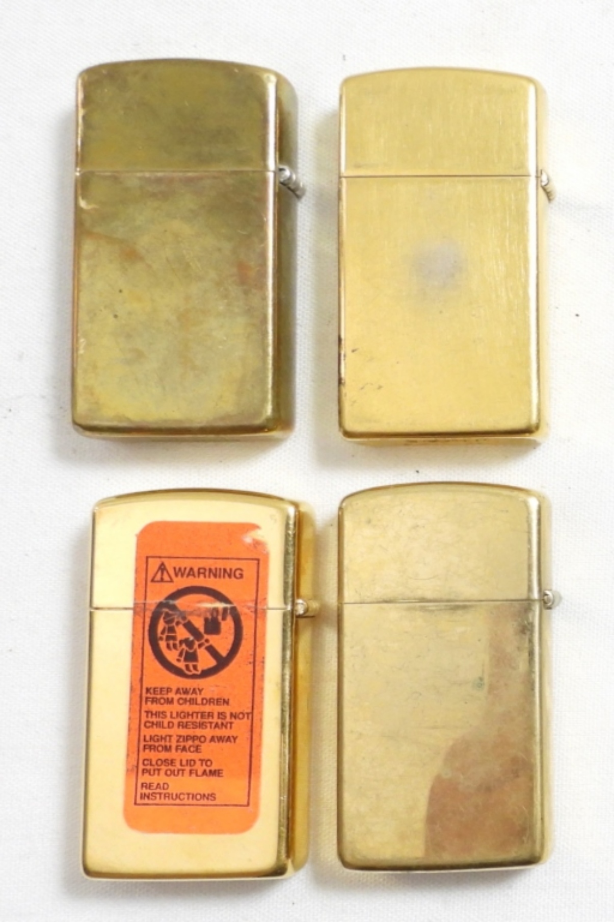 (4) BRASS SLIM ZIPPO (1) UNFIRED (3) FIRED, 3 ARE ENGRAVED (1981,1989,1988,1991)