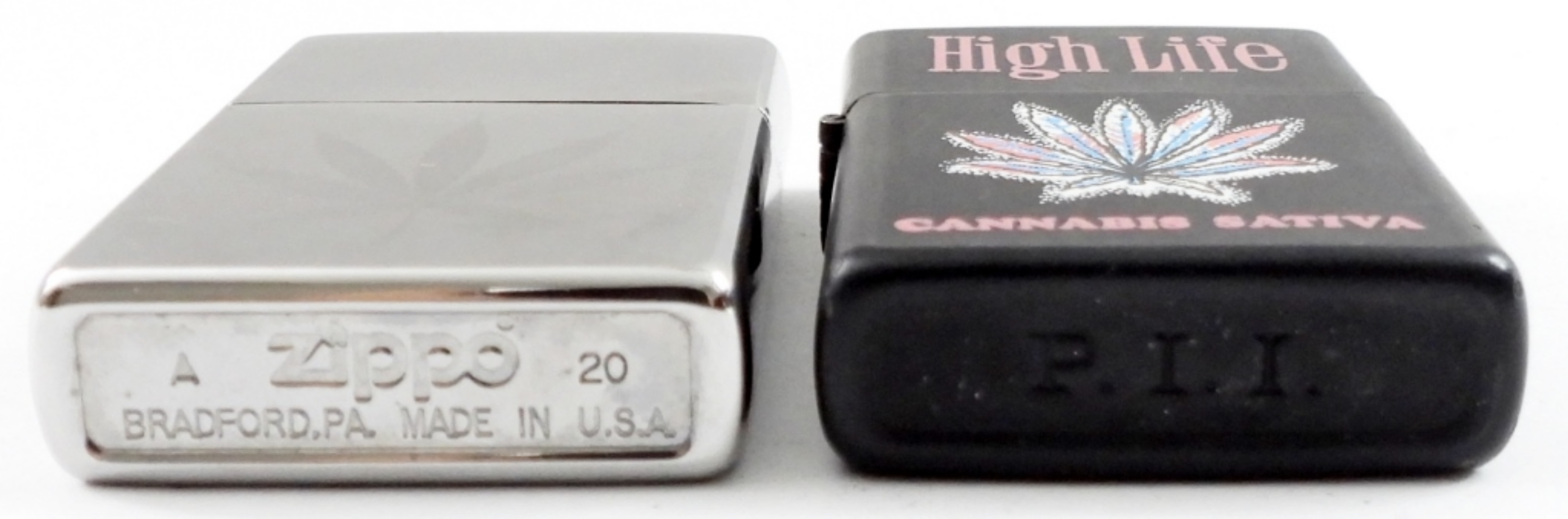 2020 ZIPPO SILVER TONE LIGHTER WITH ETCHED LEAF, INSERT IS A 2020 ZIPPO PIPE INSERT. “HIGH LIFE” NON-ZIPPO LIGHTER WITH LEAF.
