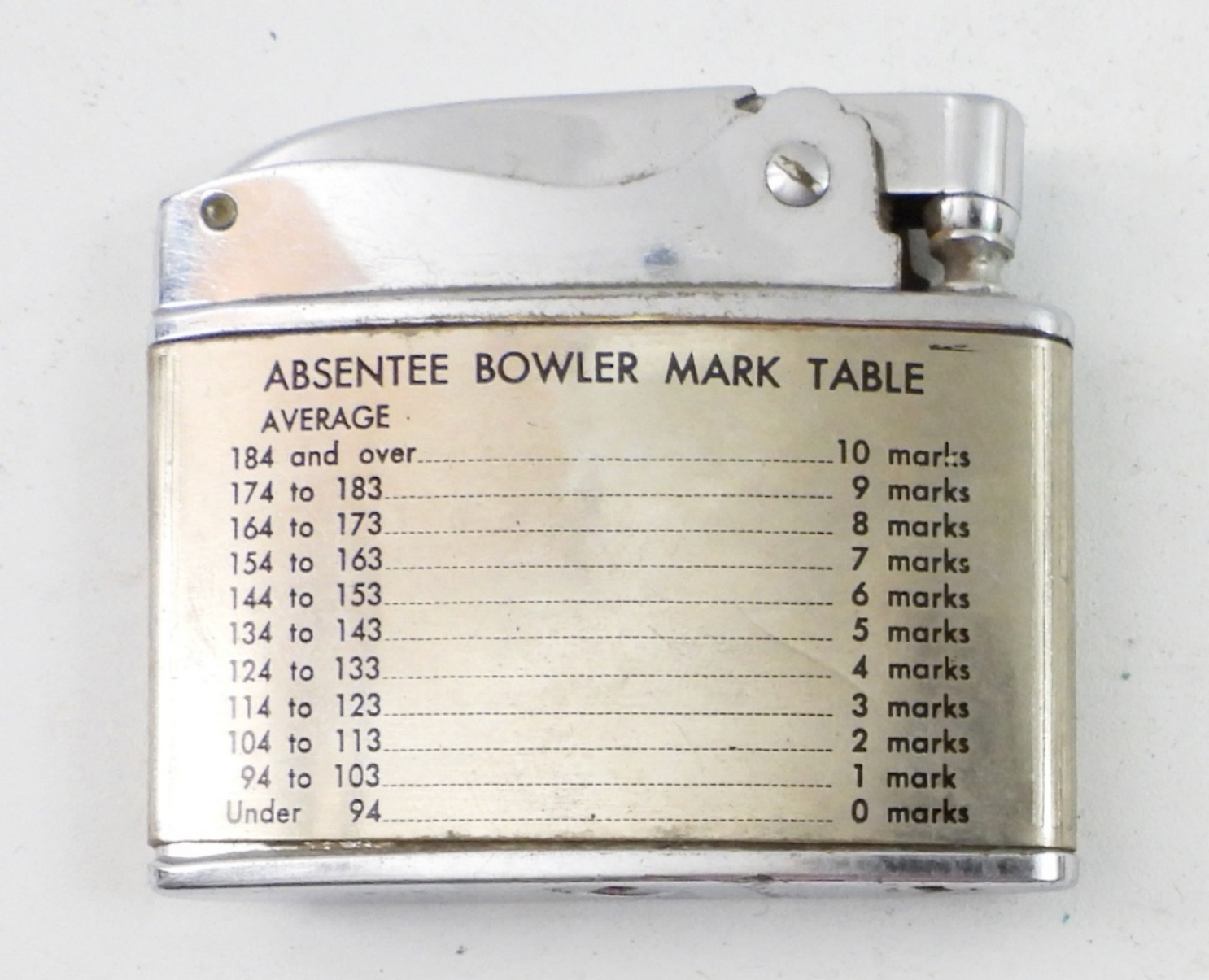 VINTAGE ROLEX LIGHTER. HAS KING LOUIE BOWLING LANES ADVERTISEMENT PRINTED ON IT. IN ORIGINAL ROLEX BOX.