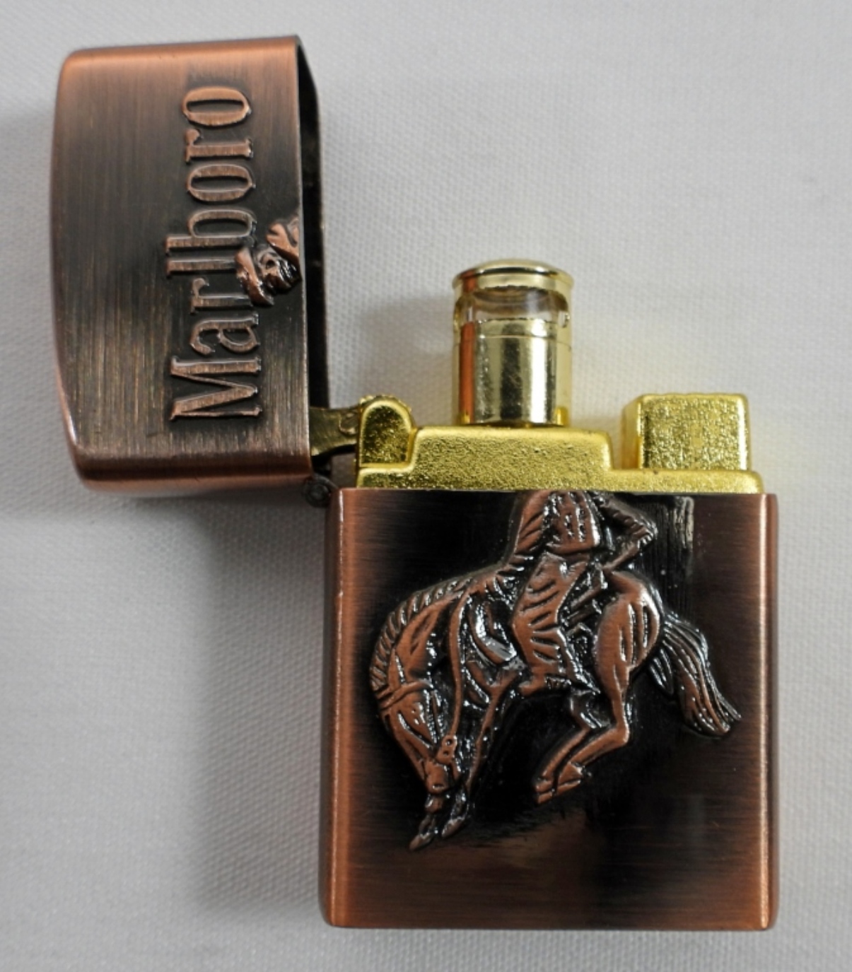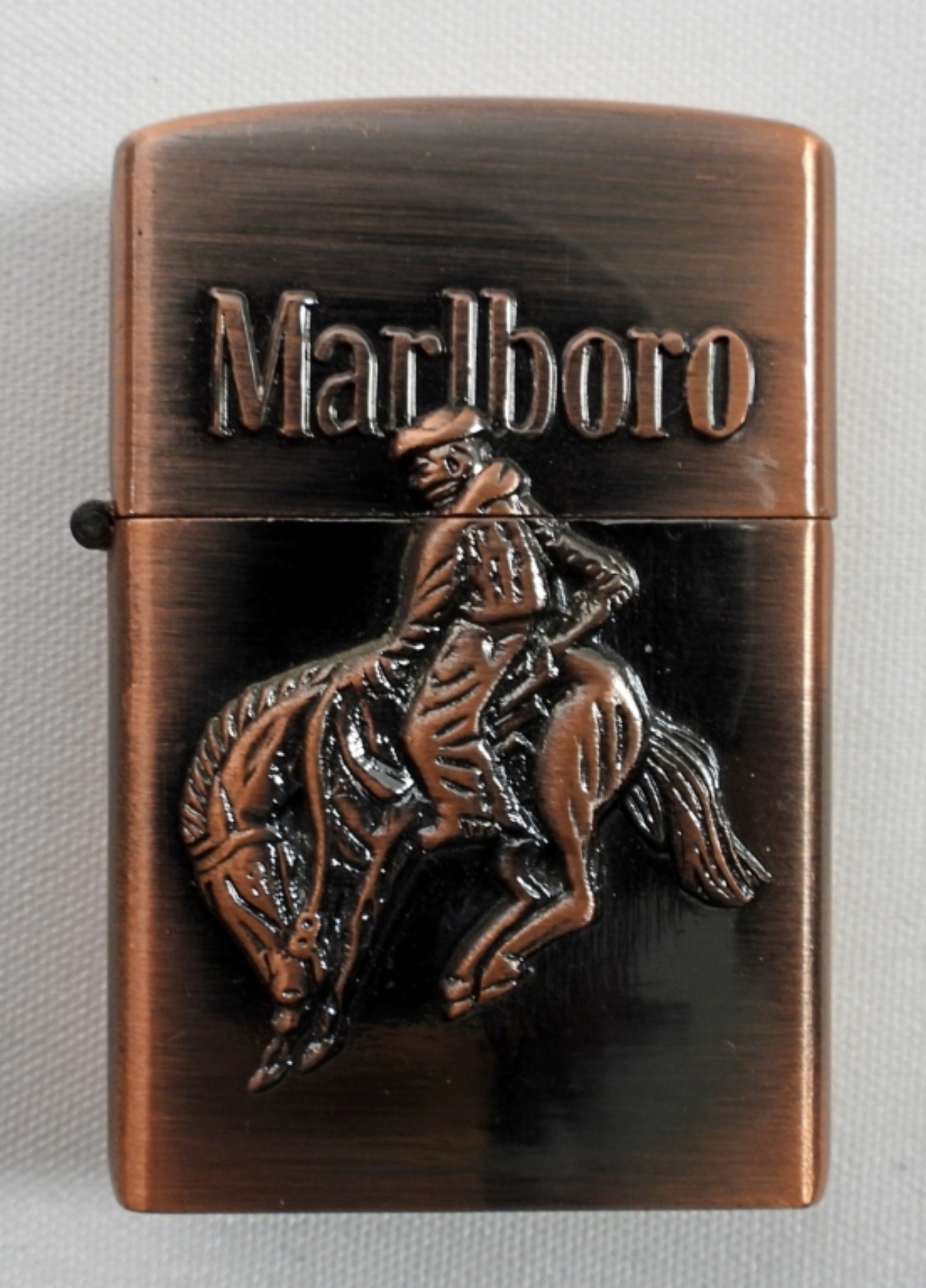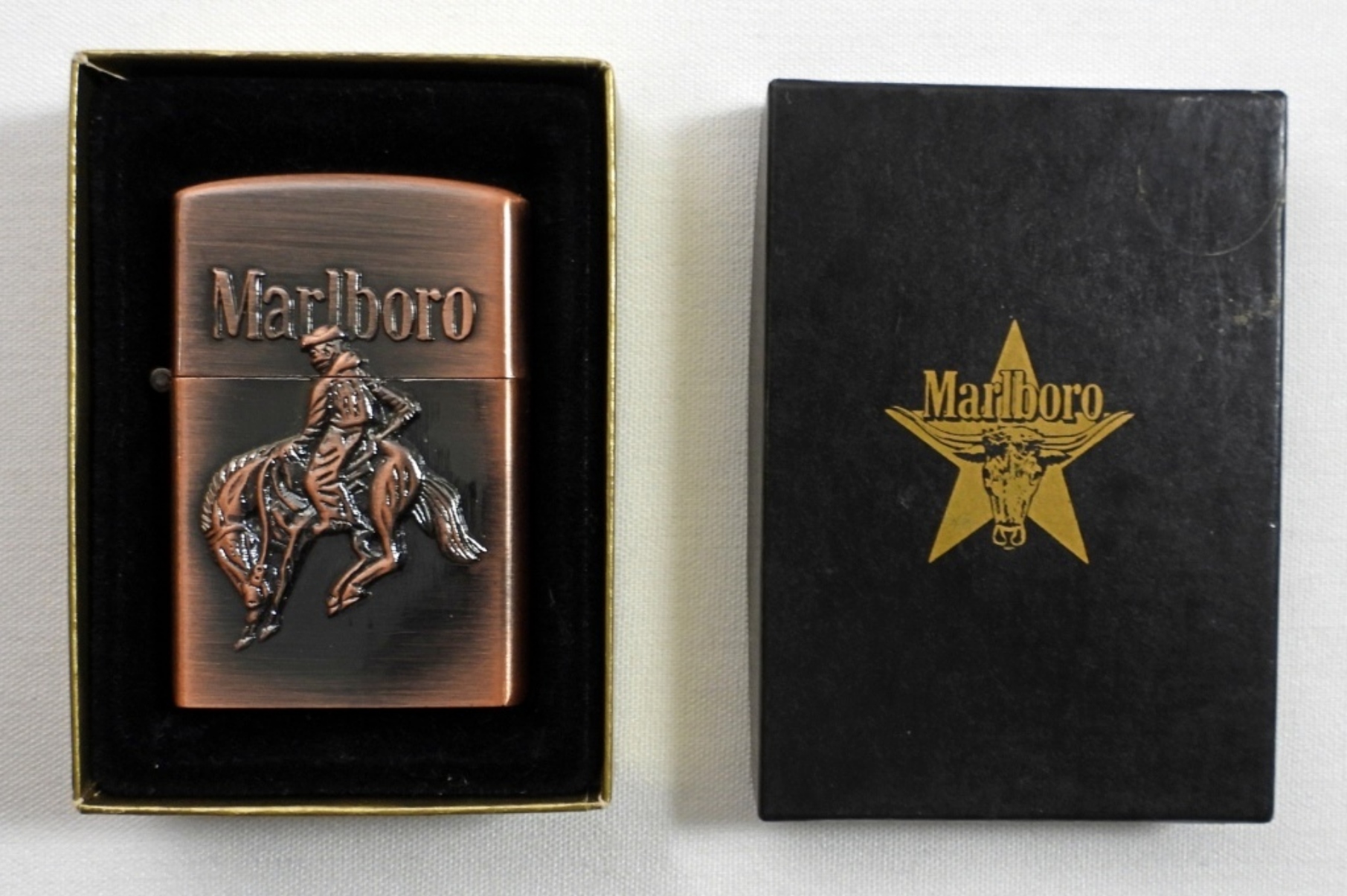 VINTAGE BRASS MARLBORO COWBOY BUCKING BRONCO BUTANE ZIPPO. (DATE NOT FOUND) IN MARLBORO BOX