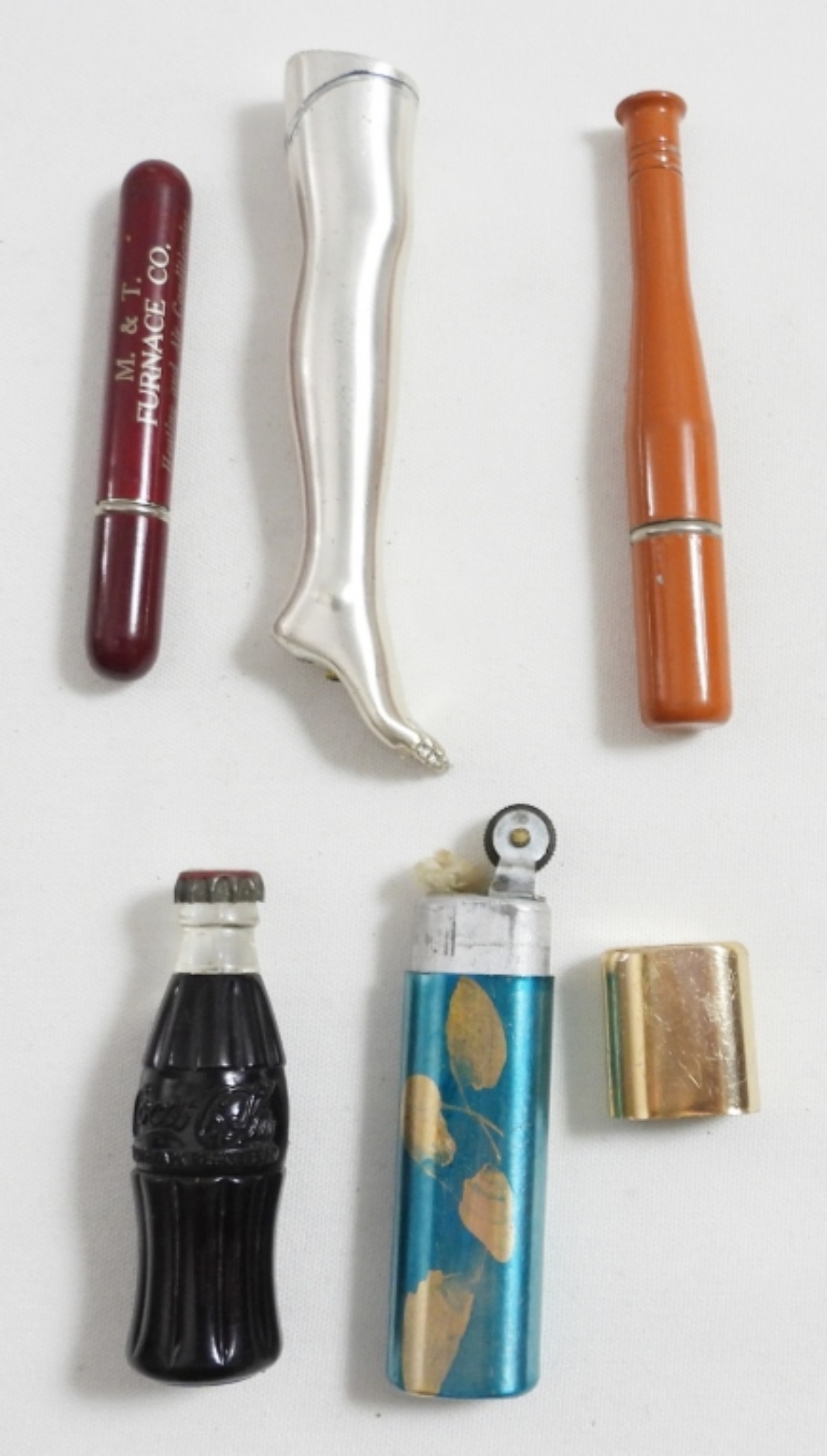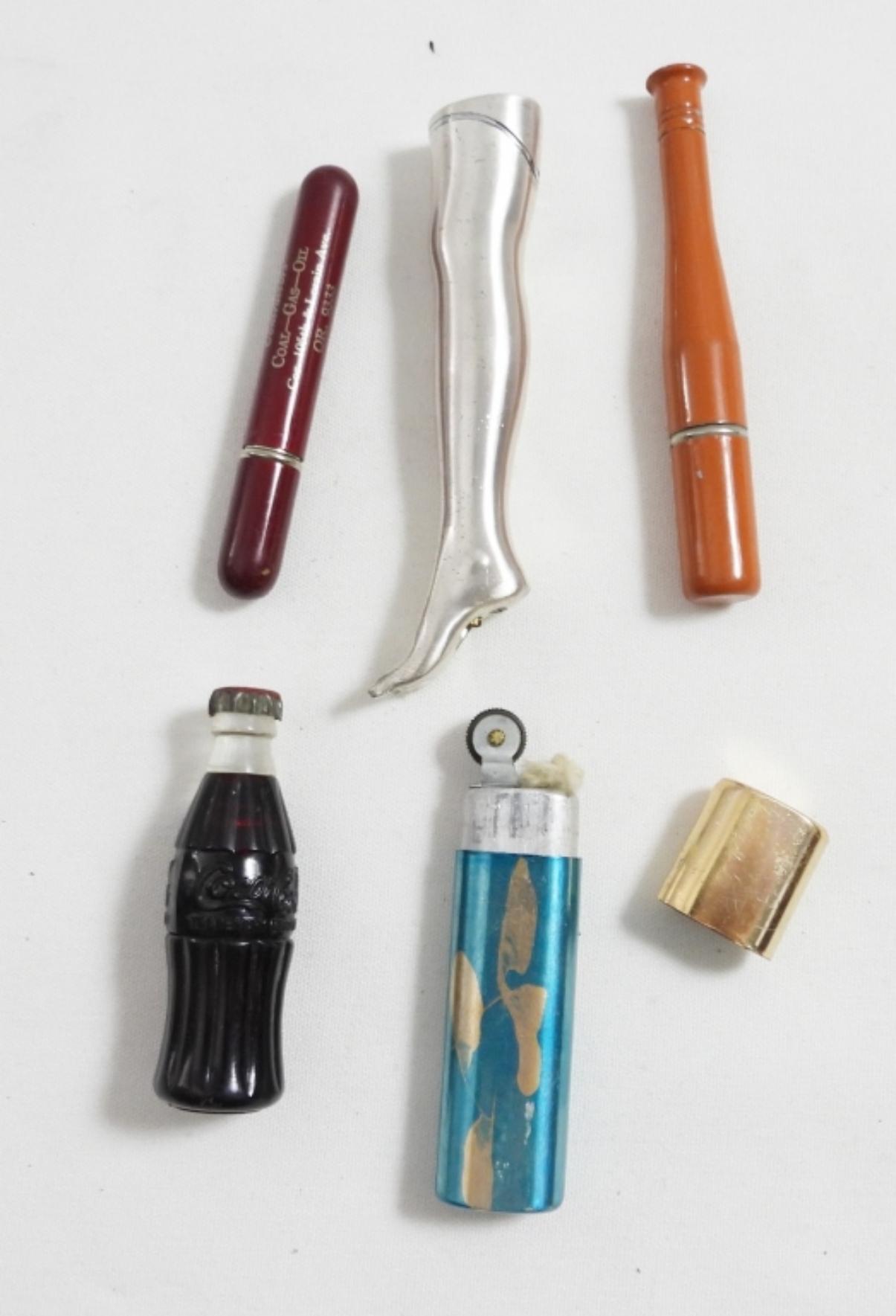 (5) NOVELTY UNFIRED LIGHTERS, (1)COCA-COLA, (1)BALLBAT, (1) LEG (1) ADVERTISING (1) FLORAL